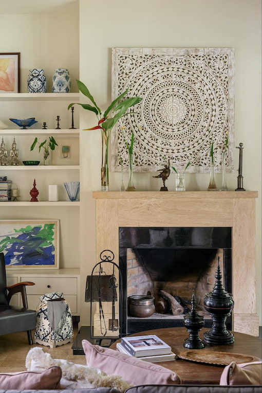 Often, statues of Buddhist or Hindu deities are incorporated into Asian decor. Deities are typically placed at the center of a shrine so they can be given offerings in religious households. Some people may also use deity statues to decorate a high wall or shelf as long as the location is respectful to the particular deity.