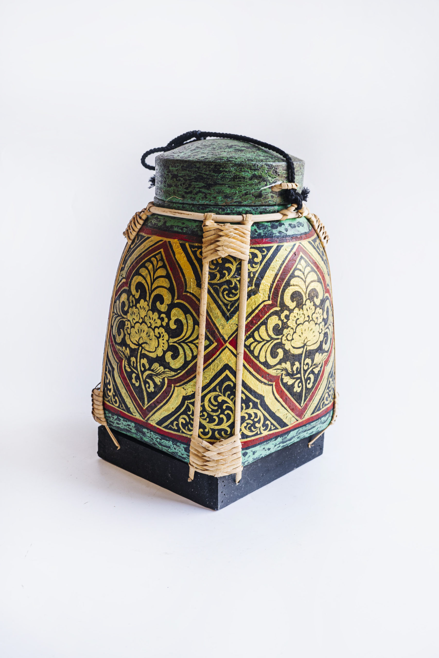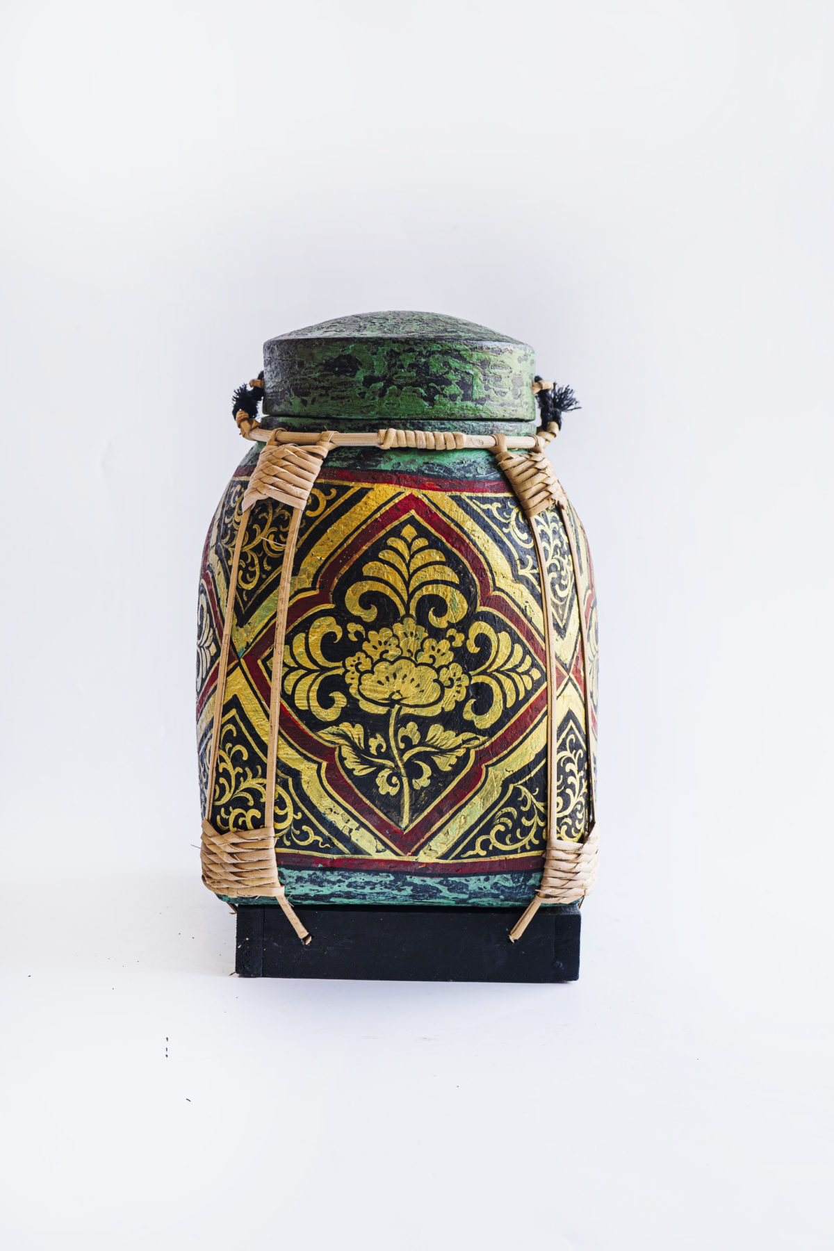 This ornate Thai vessel showcases a luxurious gold floral medallion with crimson accents on a dark background, topped with a verdigris-hued lid. The bamboo-woven container features rattan bindings and rests on a black wooden base.
