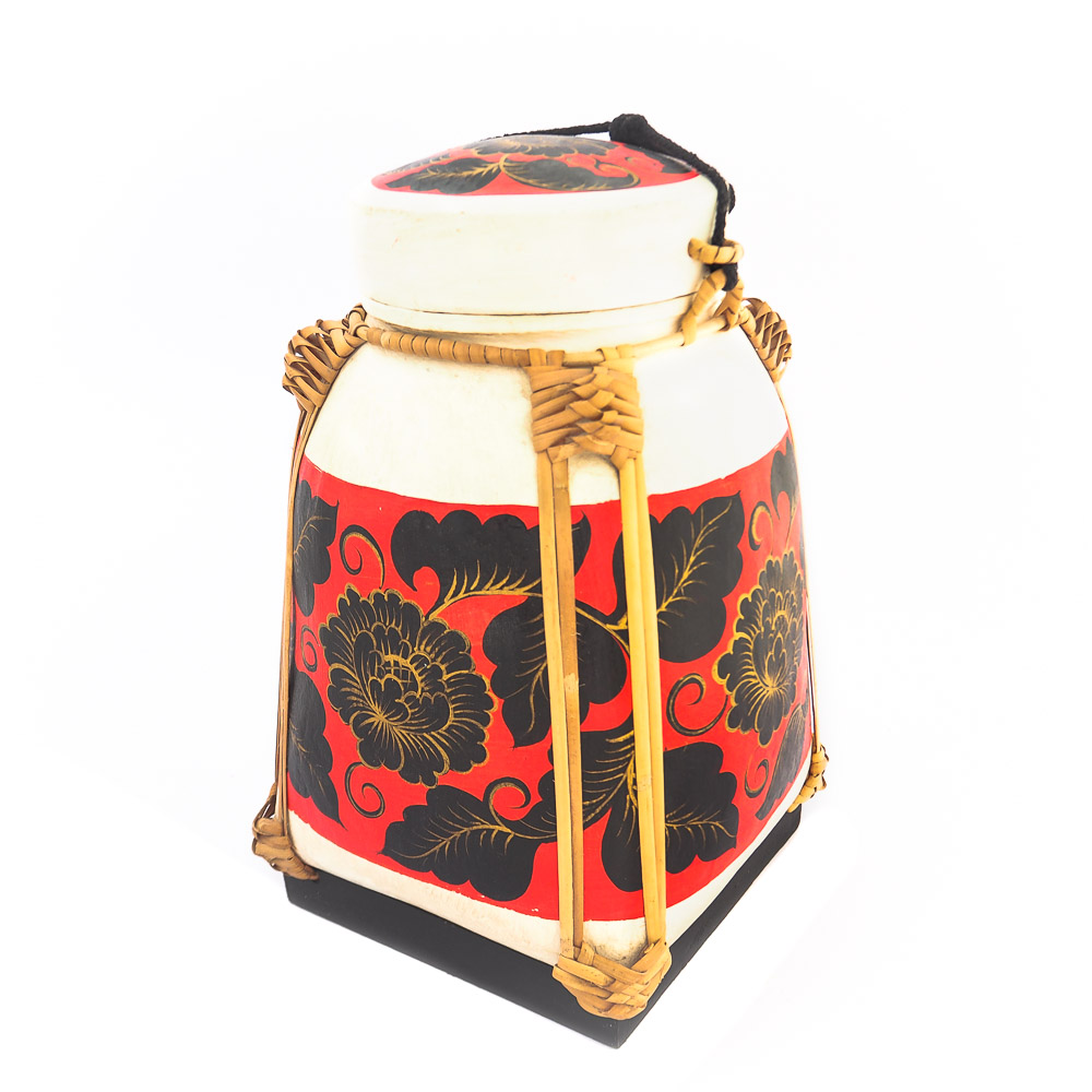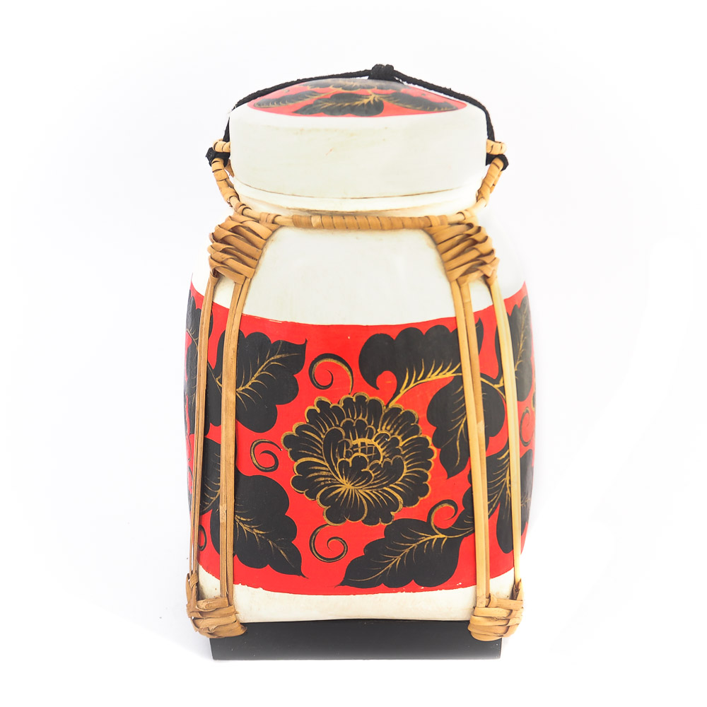 This vibrant Thai basket features bold black peonies and foliage painted on a striking red band against a cream background. The bamboo-woven container is enhanced with rattan supports and a coordinating lid, resting on a dark wooden base.