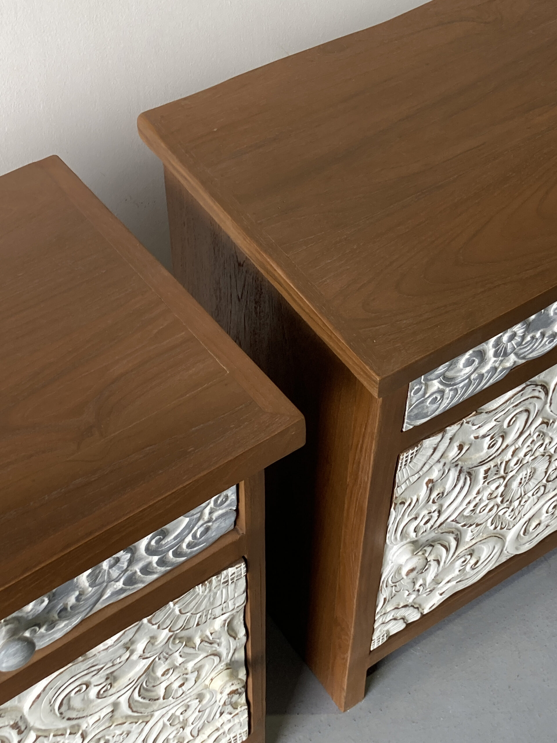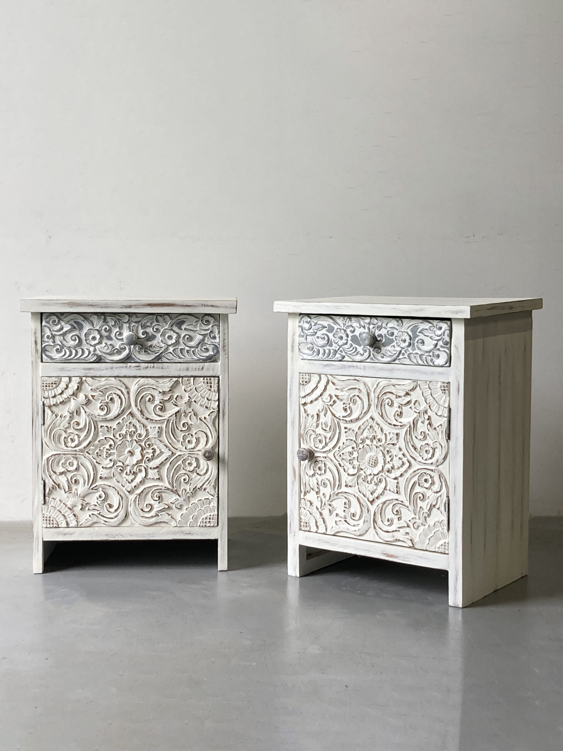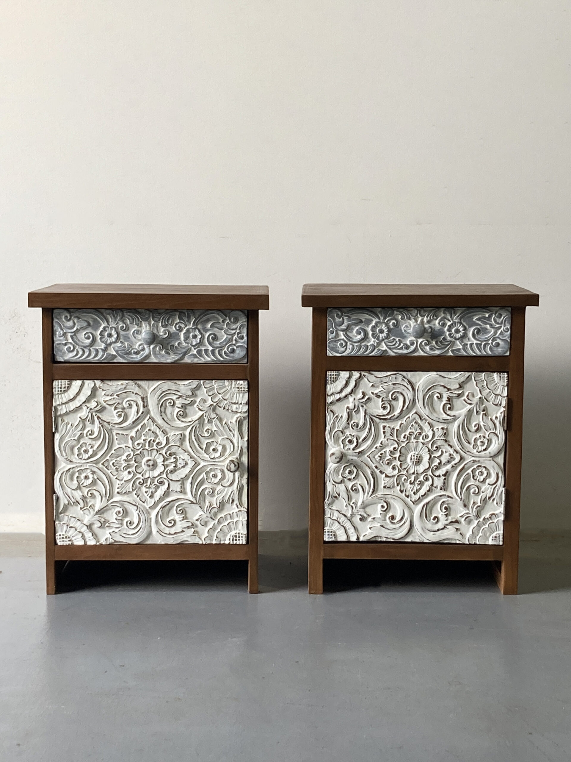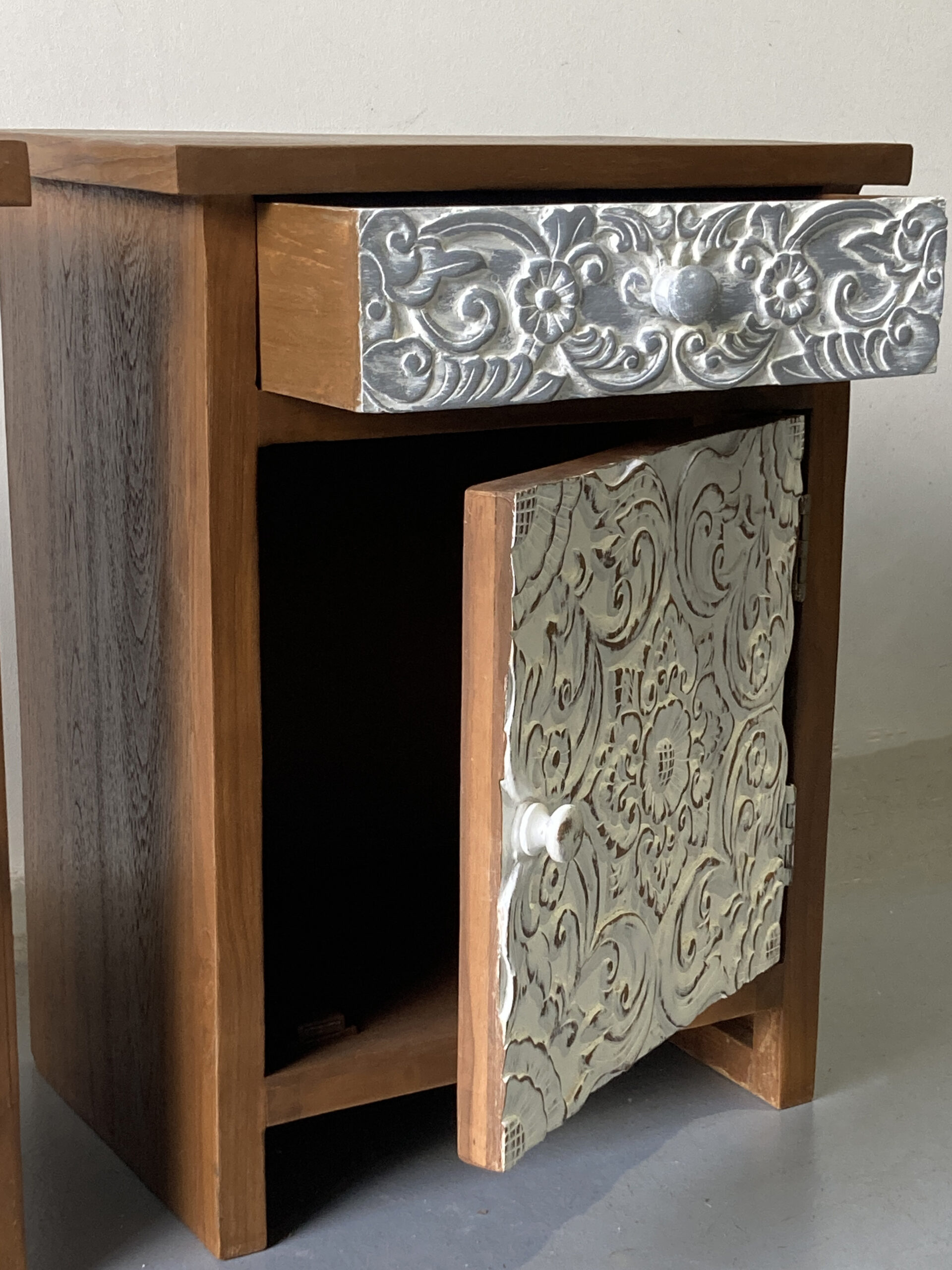 | Content & Care | • Hand-carved Teak wood nightstands • 1 drawer, 1 door • Due to the nature of handmade, expect a slightly difference in the appearance of each unique piece, sizes may vary from 0.5 inches • Dusting is best done with a soft, lint-free cloth • If a liquid spill occurs prompt cleaning is advised • Do not use harsh solvents or chemicals • Clean carving grooves with small, soft brush • Do not place hot items directly on surface • Do not sliding objects on furniture’s surface; always lift and place objects • This piece is intended for indoor use or covered outdoor space |