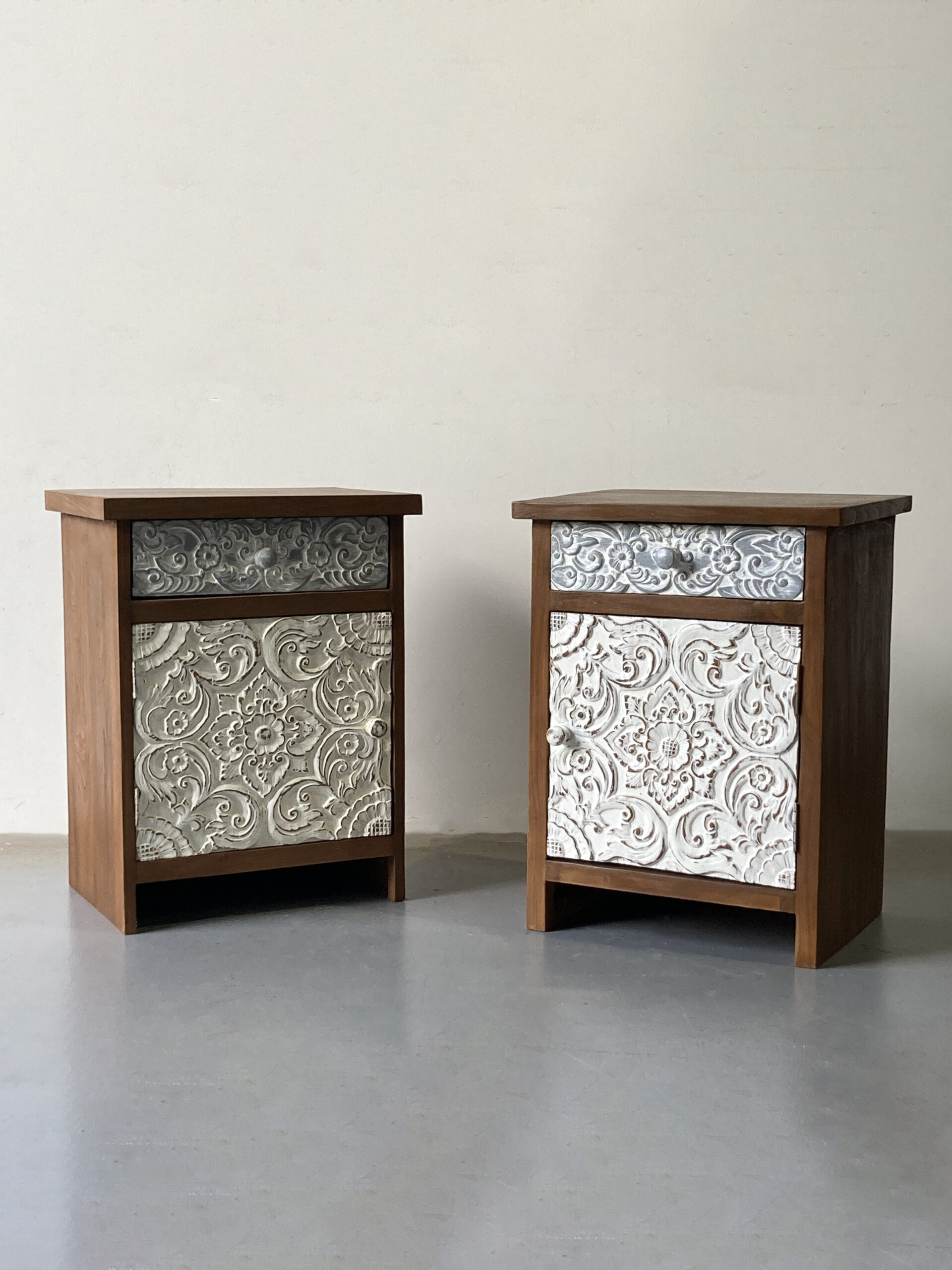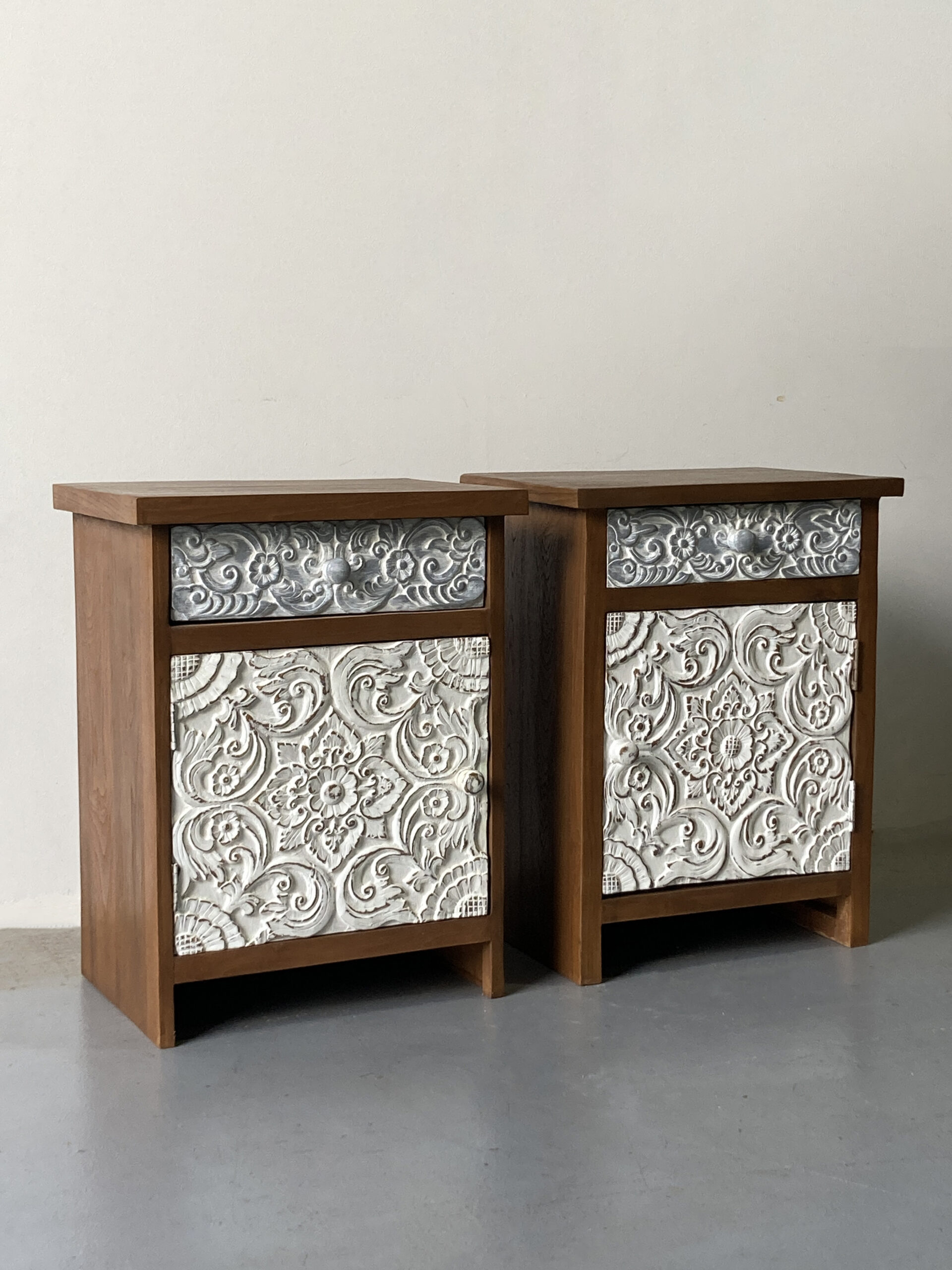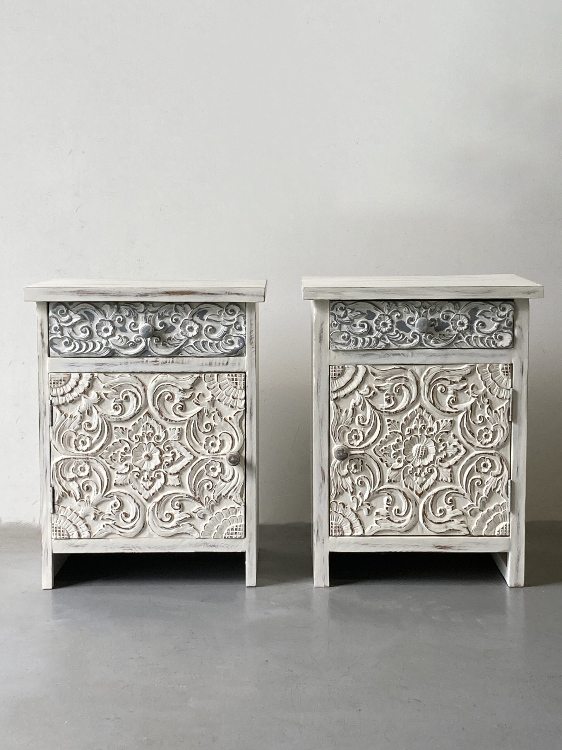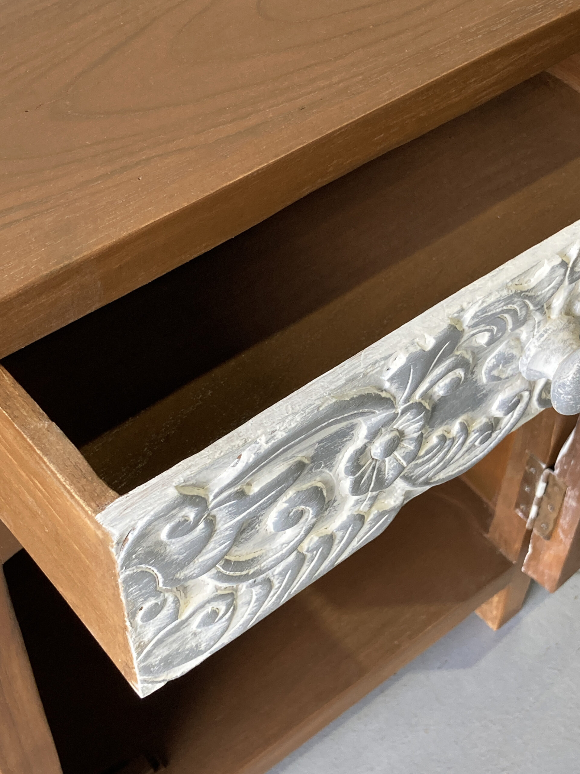 | Content & Care | • Hand-carved Teak wood nightstands • 1 drawer, 1 door • Due to the nature of handmade, expect a slightly difference in the appearance of each unique piece, sizes may vary from 0.5 inches • Dusting is best done with a soft, lint-free cloth • If a liquid spill occurs prompt cleaning is advised • Do not use harsh solvents or chemicals • Clean carving grooves with small, soft brush • Do not place hot items directly on surface • Do not sliding objects on furniture’s surface; always lift and place objects • This piece is intended for indoor use or covered outdoor space |