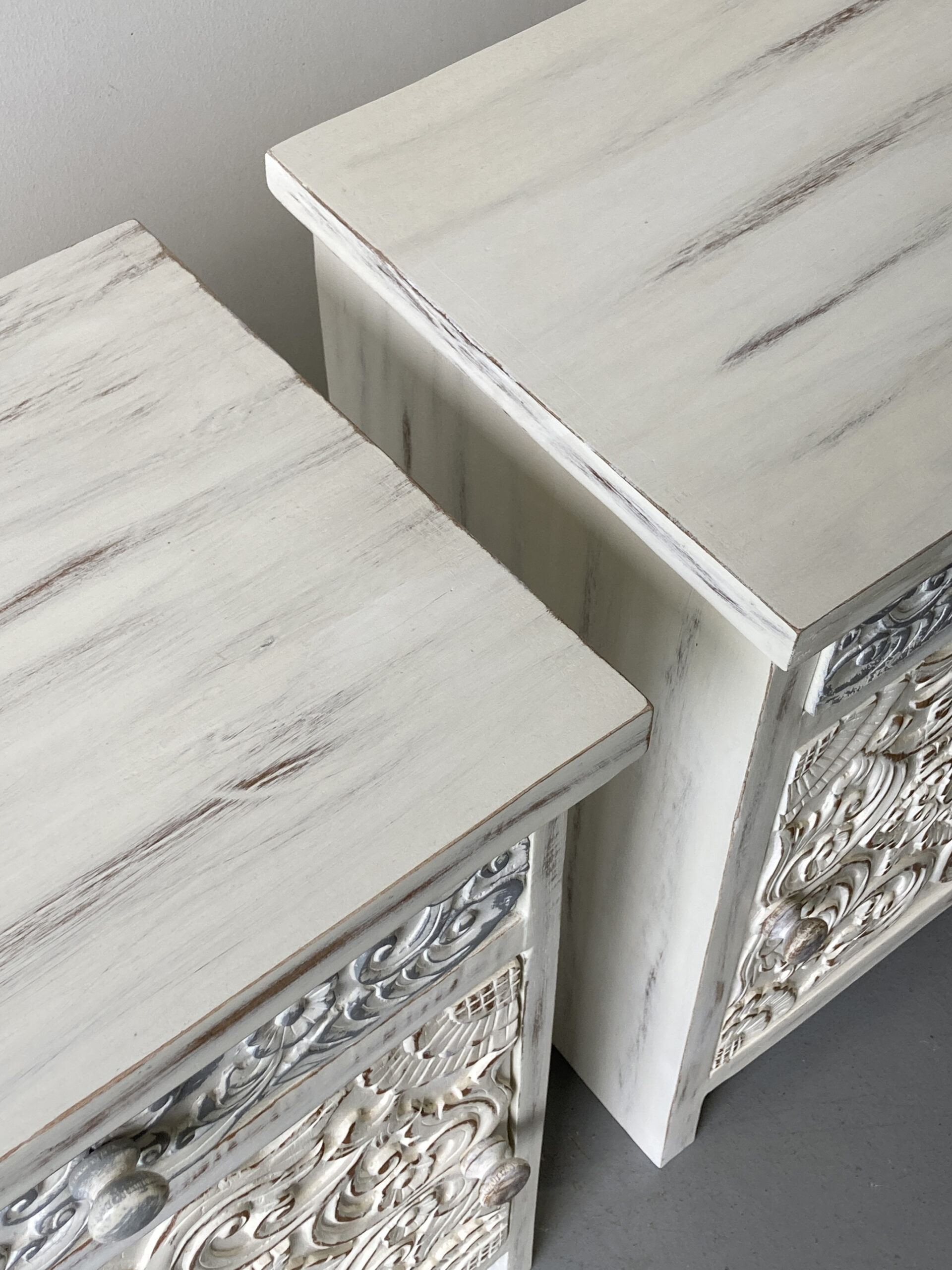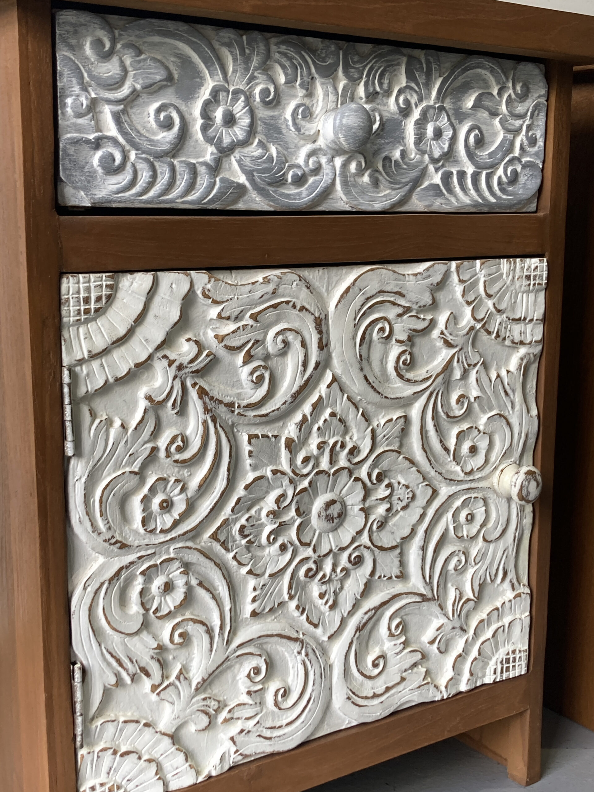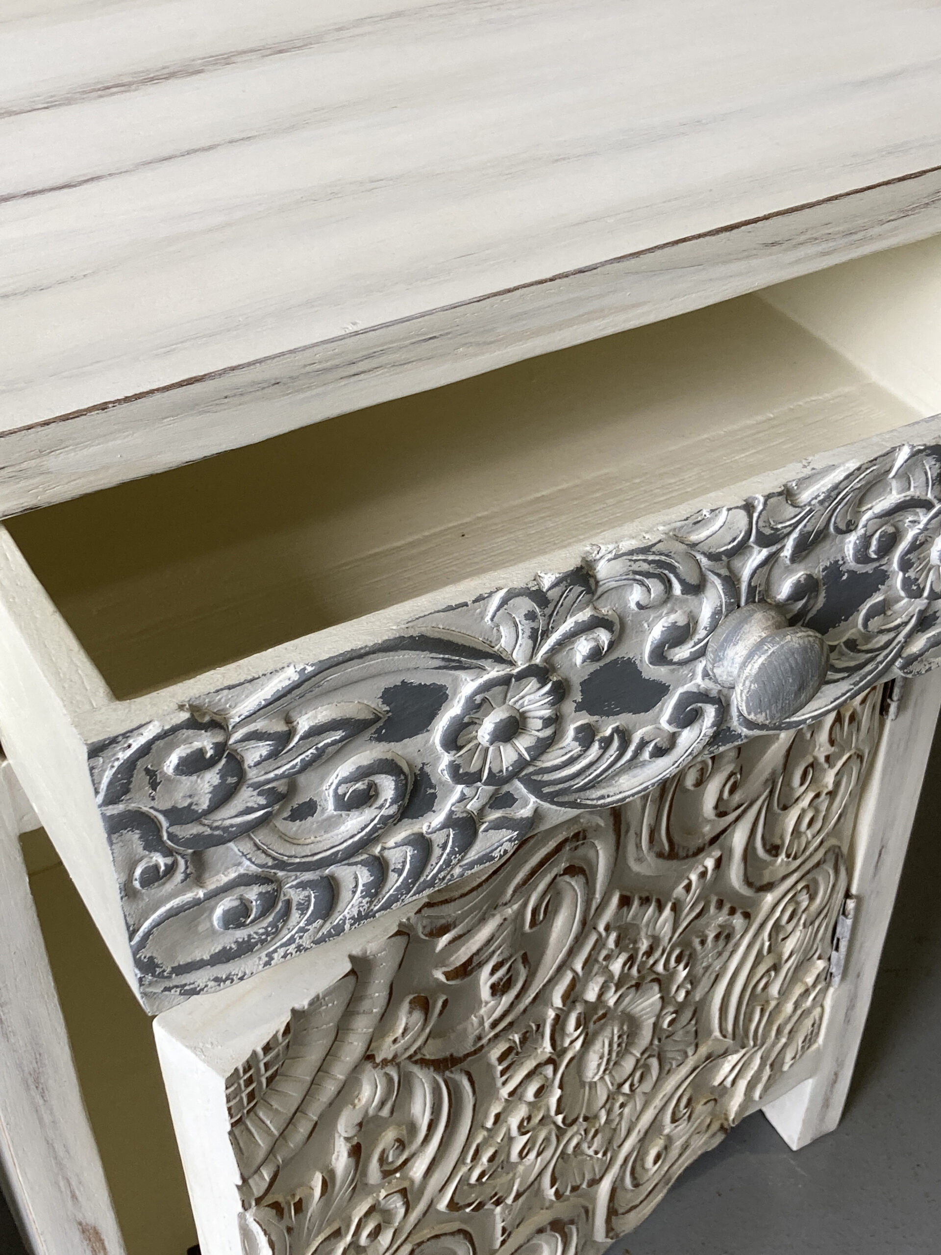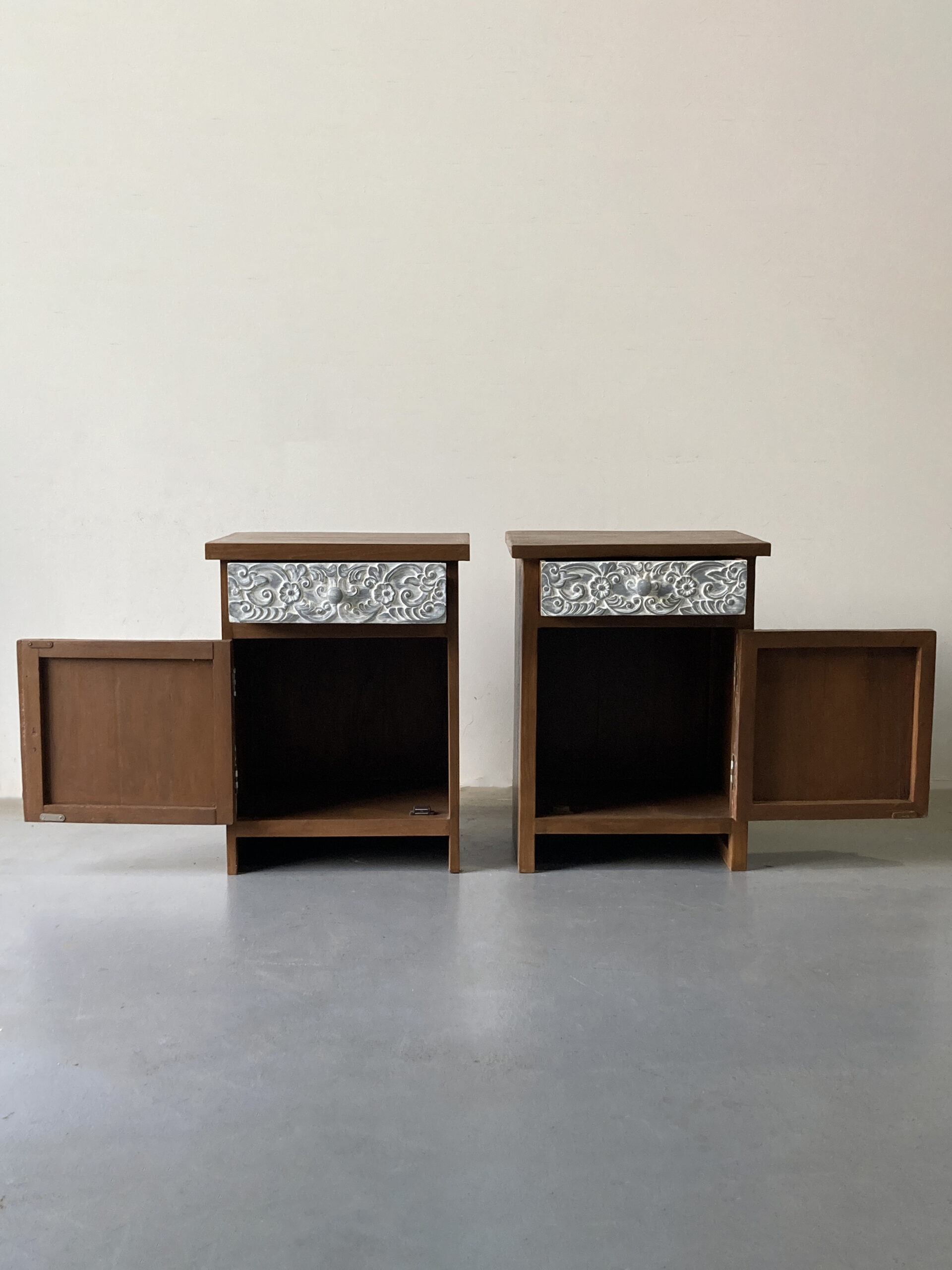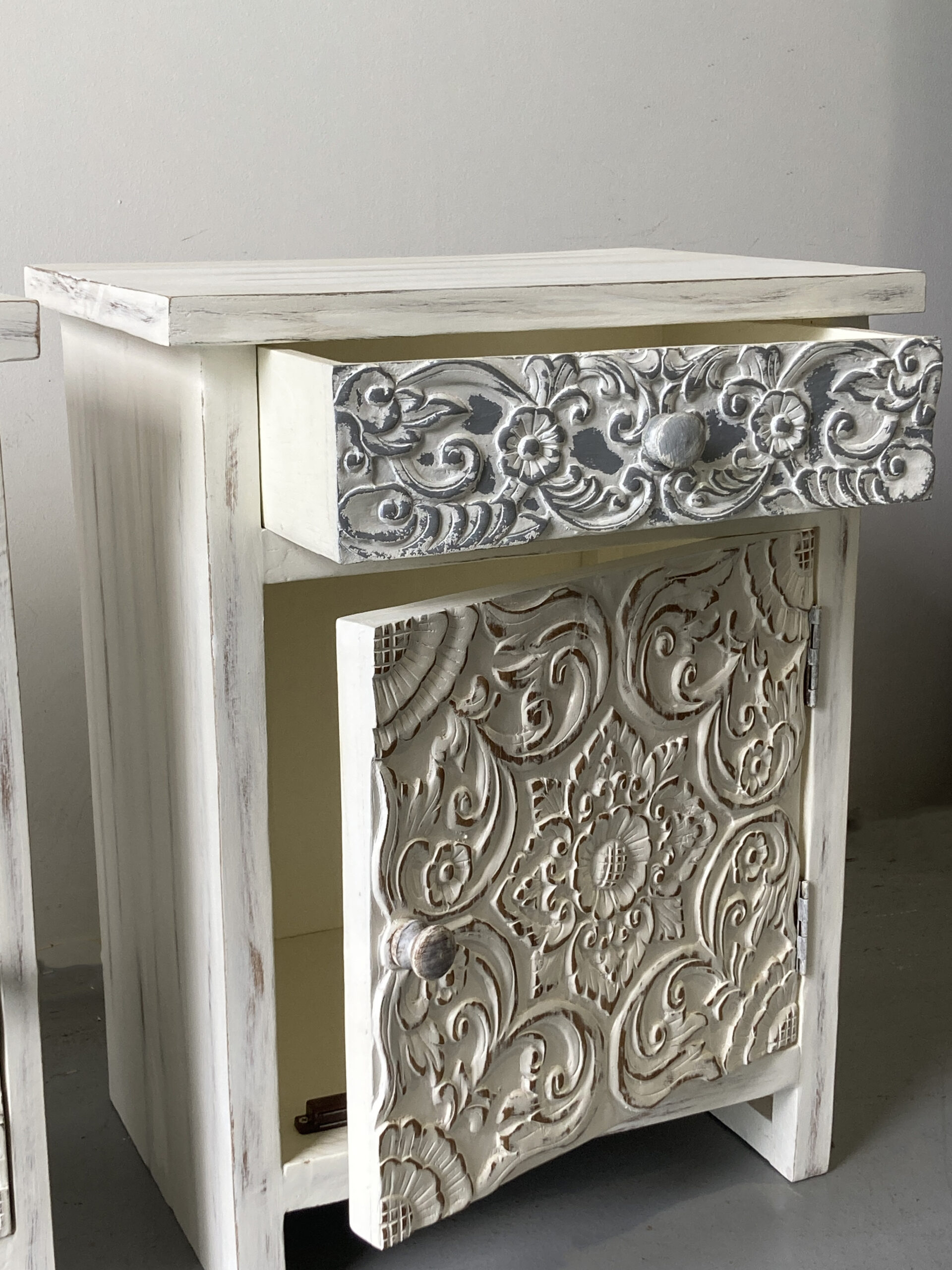| Content & Care | • Hand-carved Teak wood nightstands • 1 drawer, 1 door • Due to the nature of handmade, expect a slightly difference in the appearance of each unique piece, sizes may vary from 0.5 inches • Dusting is best done with a soft, lint-free cloth • If a liquid spill occurs prompt cleaning is advised • Do not use harsh solvents or chemicals • Clean carving grooves with small, soft brush • Do not place hot items directly on surface • Do not sliding objects on furniture’s surface; always lift and place objects • This piece is intended for indoor use or covered outdoor space |