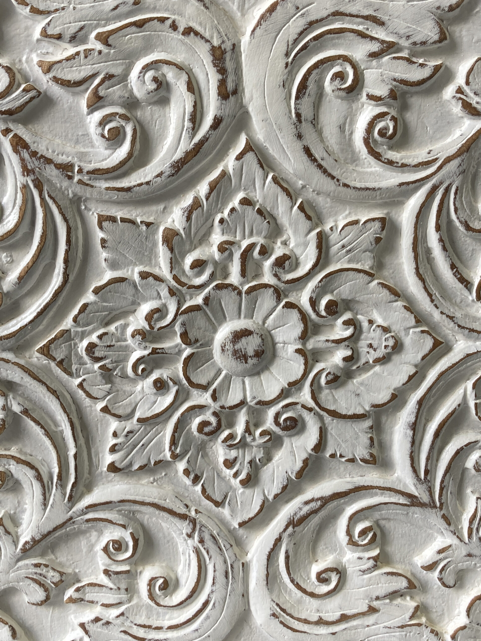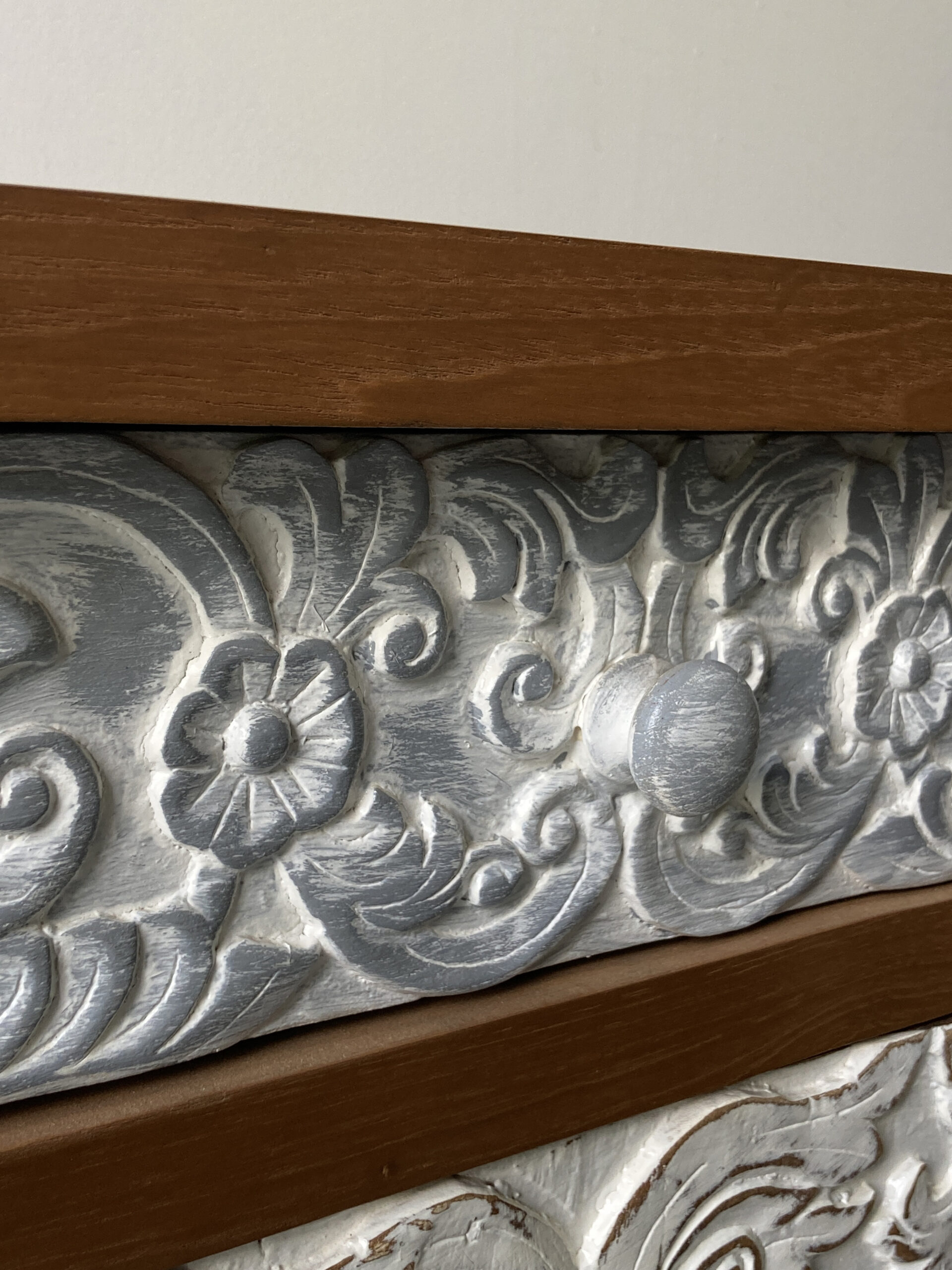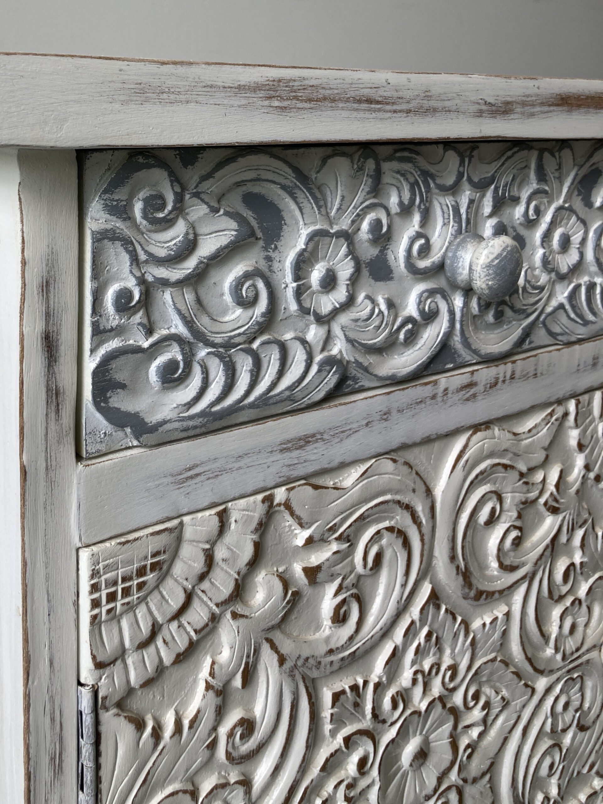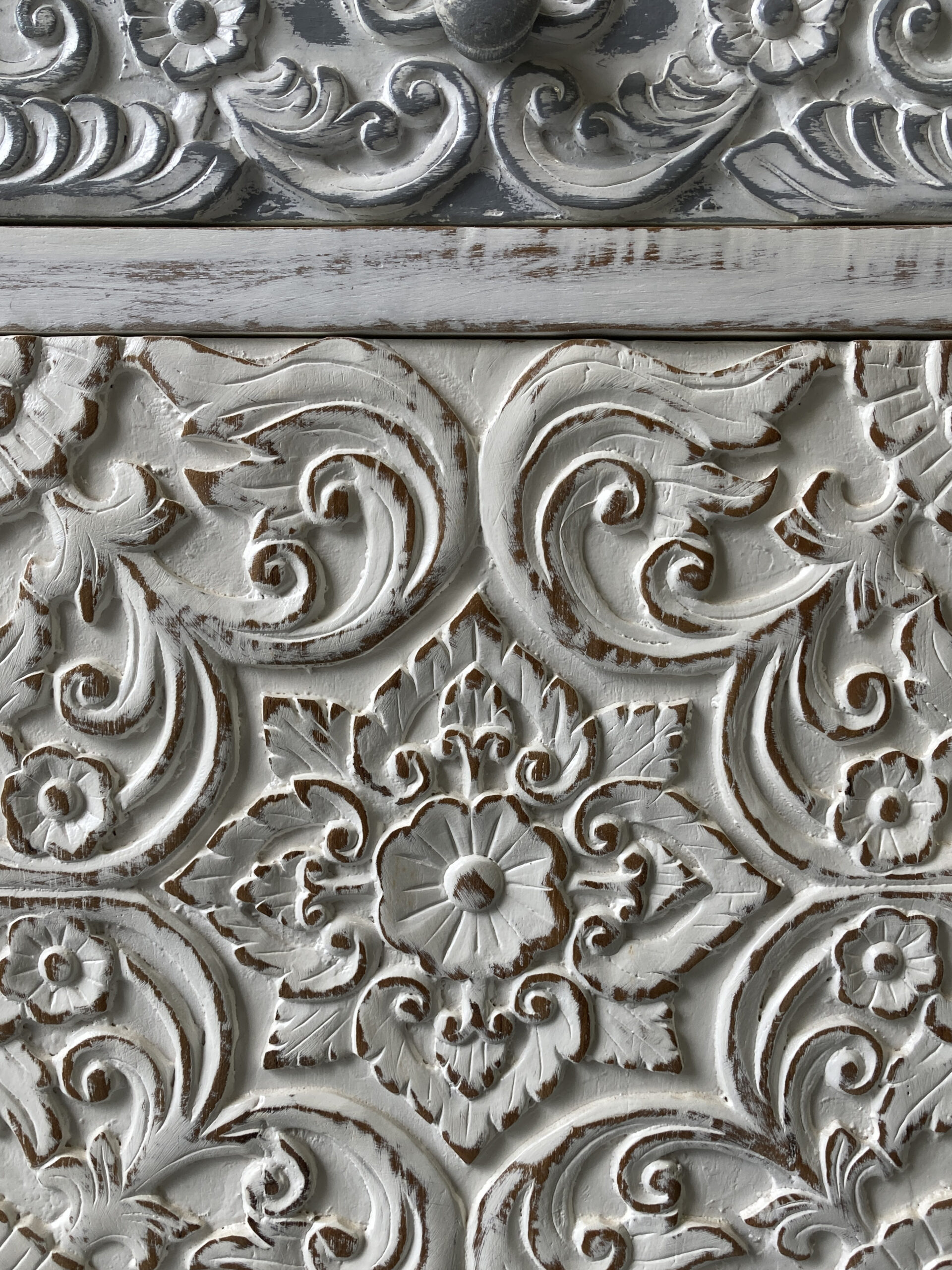 | Content & Care | • Hand-carved Teak wood nightstands • 1 drawer, 1 door • Due to the nature of handmade, expect a slightly difference in the appearance of each unique piece, sizes may vary from 0.5 inches • Dusting is best done with a soft, lint-free cloth • If a liquid spill occurs prompt cleaning is advised • Do not use harsh solvents or chemicals • Clean carving grooves with small, soft brush • Do not place hot items directly on surface • Do not sliding objects on furniture’s surface; always lift and place objects • This piece is intended for indoor use or covered outdoor space |