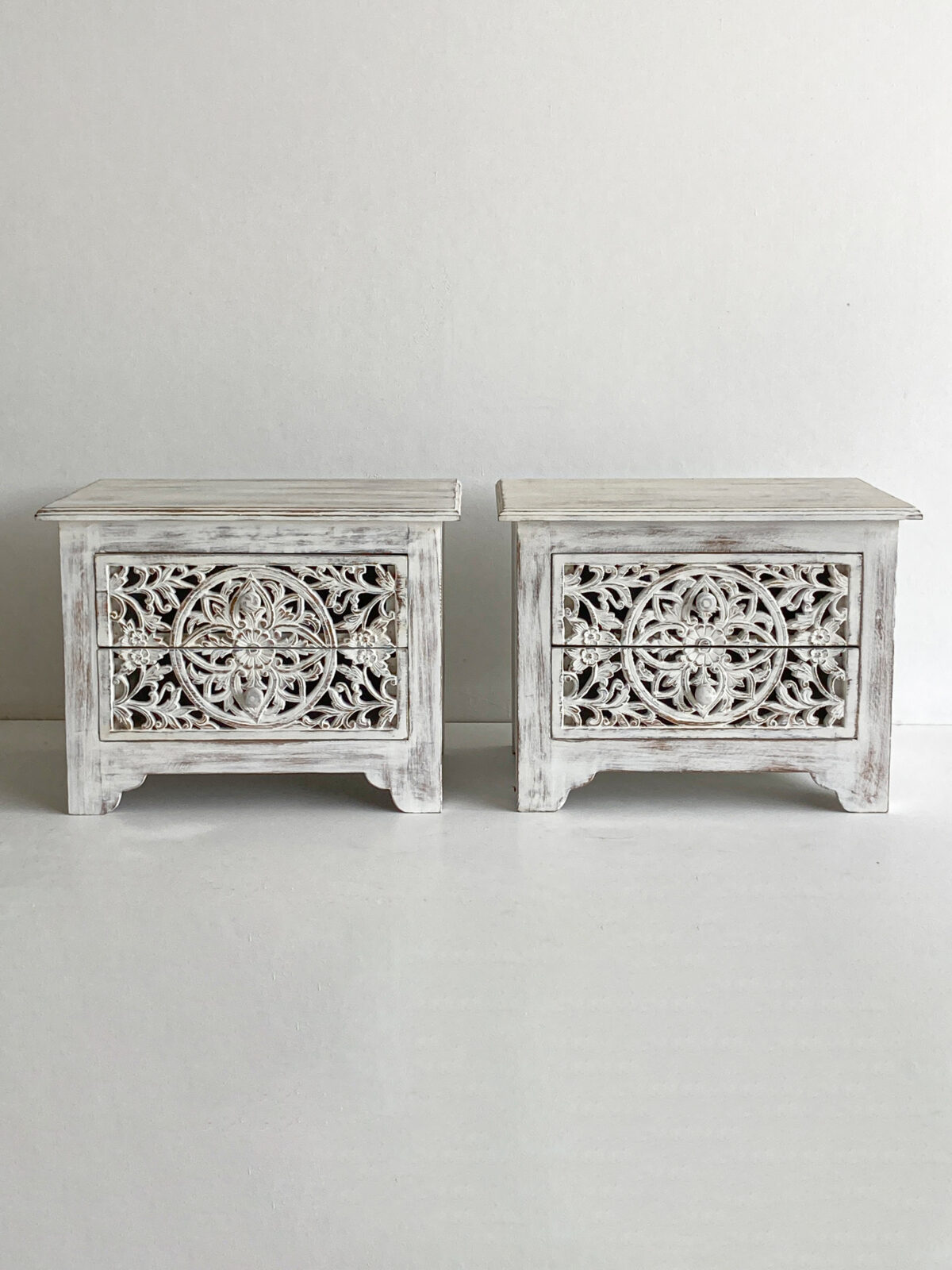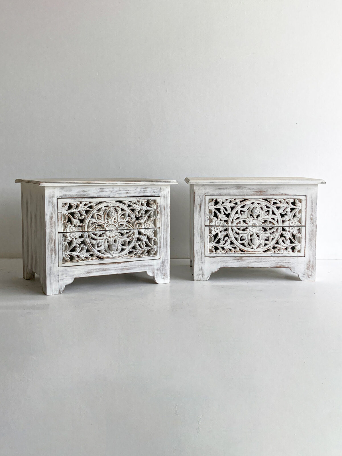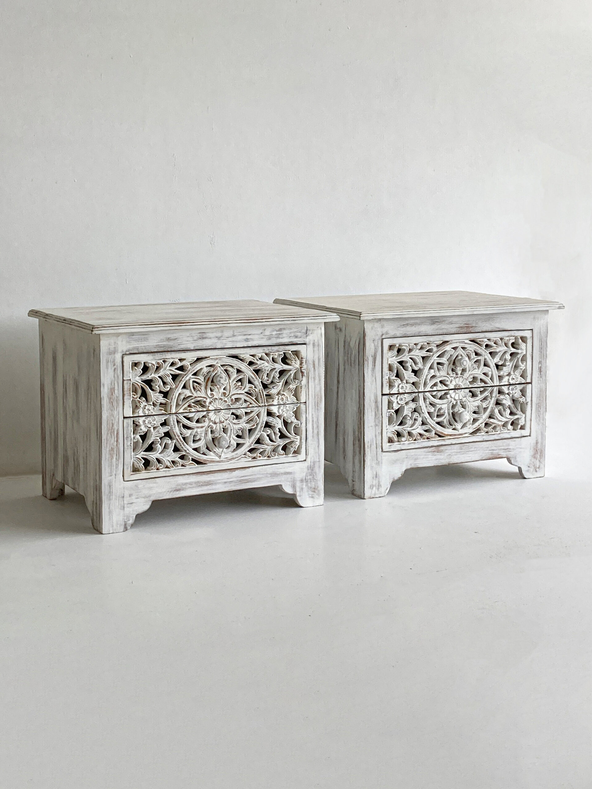 | Content & Care | • Hand-carved Teak wood nightstands • 2 drawers • Due to the nature of handmade, expect a slightly difference in the appearance of each unique piece, sizes may vary from 0.5 inches • Dusting is best done with a soft, lint-free cloth • If a liquid spill occurs prompt cleaning is advised • Do not use harsh solvents or chemicals • Clean carving grooves with small, soft brush • Do not place hot items directly on surface • Do not sliding objects on furniture’s surface; always lift and place objects • This piece is intended for indoor use |