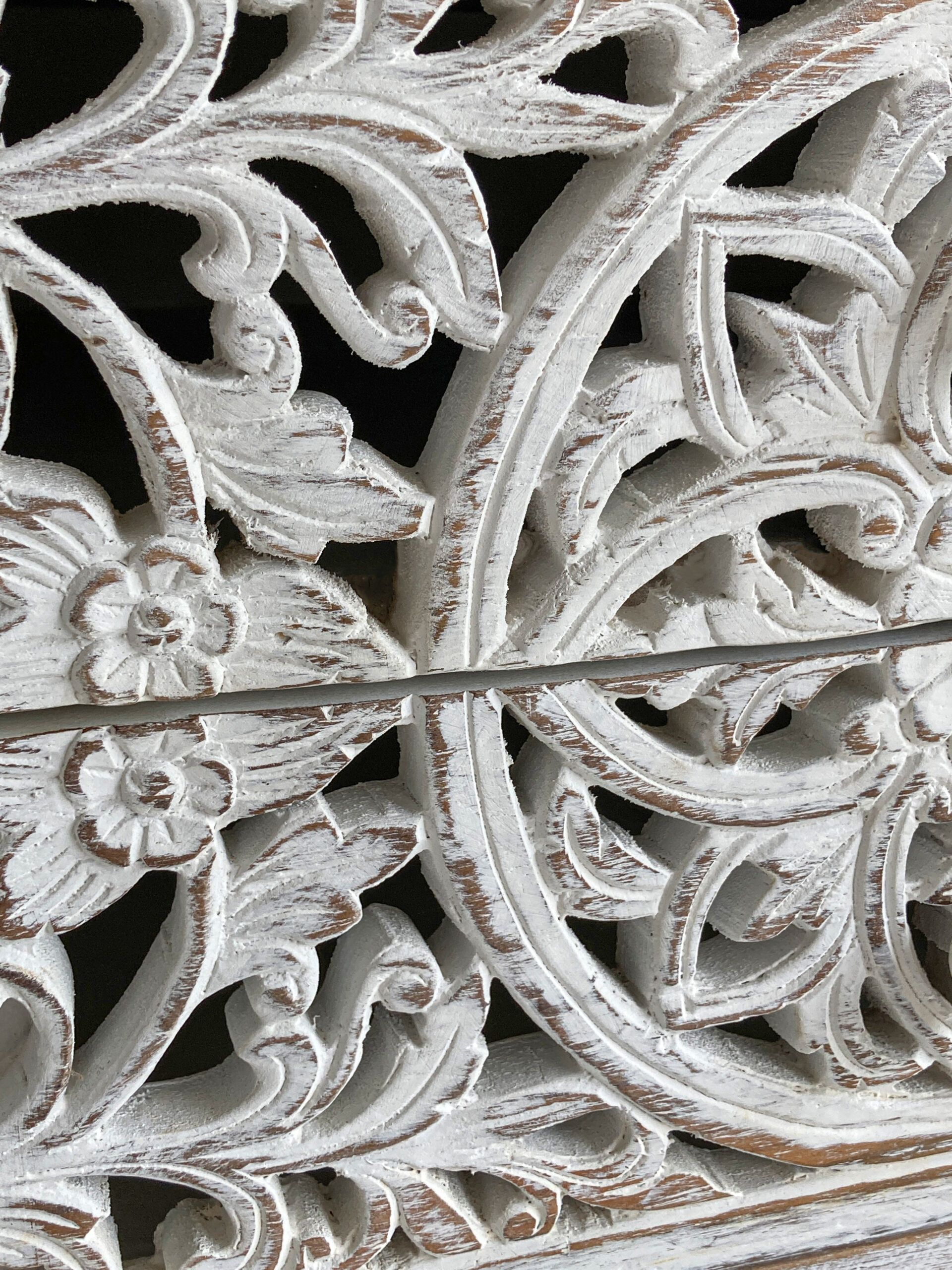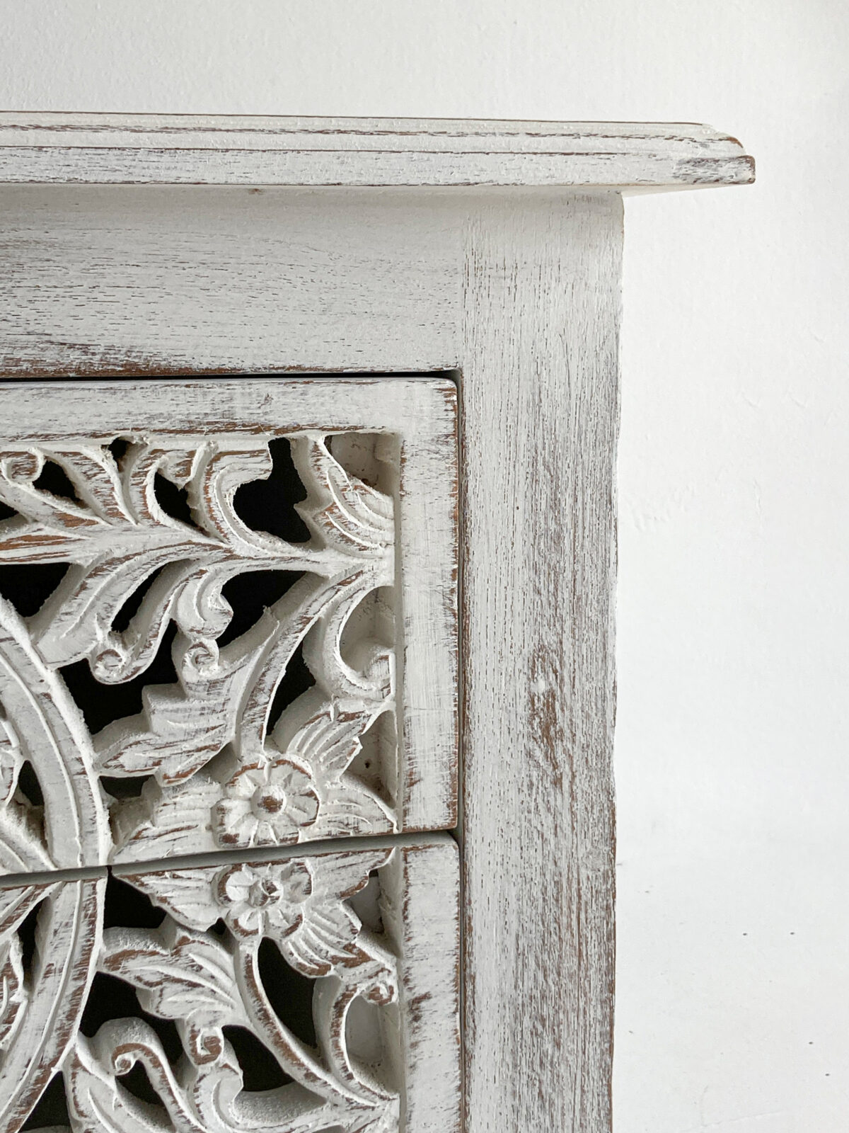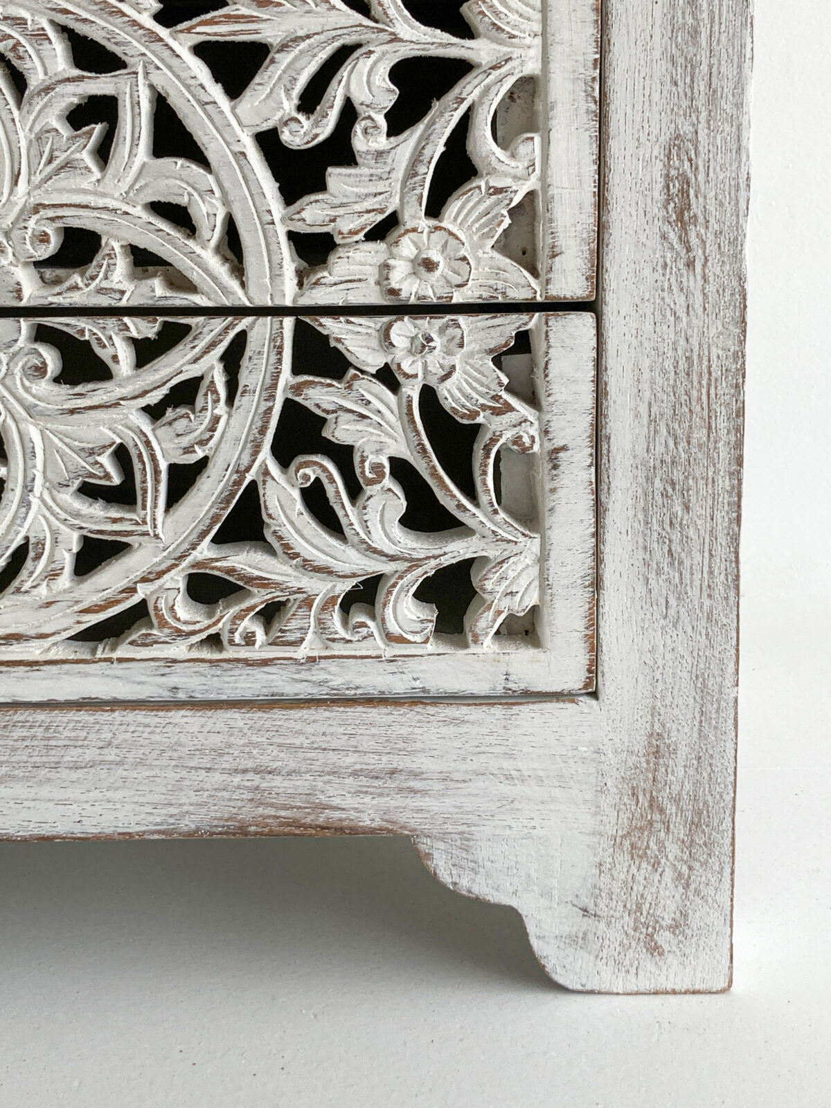 | Content & Care | • Hand-carved Teak wood nightstands • 2 drawers • Due to the nature of handmade, expect a slightly difference in the appearance of each unique piece, sizes may vary from 0.5 inches • Dusting is best done with a soft, lint-free cloth • If a liquid spill occurs prompt cleaning is advised • Do not use harsh solvents or chemicals • Clean carving grooves with small, soft brush • Do not place hot items directly on surface • Do not sliding objects on furniture’s surface; always lift and place objects • This piece is intended for indoor use |