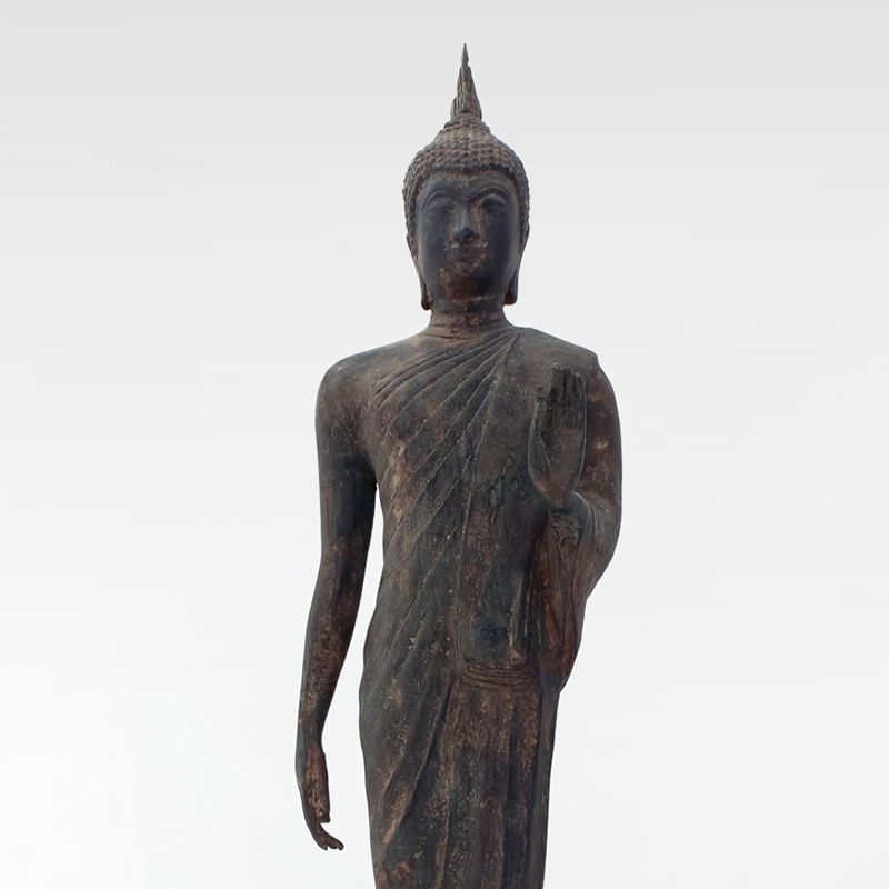The walking Buddha is a sculpture type that flourished in Thailand’s Sukhothai kingdom during the 14th and 15th centuries. The Buddha, born Prince Sidartha, renounced his wealth and spent the rest of his life teaching throughout northern India. The Suhkothai Buddha image portrayed him simply and elegantly, with his heel lifted and eyes lowered, practicing walking meditation. Walking is one of four postures prescribed for meditational exercises in ancient Theravada Buddhist texts. Sukhothai artists were the first to create walking Buddha sculptures fully in the round. The type, however, has its roots in earlier images illustrating the Buddha descending from Tavatimsa heaven on a special ladder, after spending months there teaching his mother, who had died 7 days after his birth. It might also refer to the Buddha walking up and down a golden bridge in the third week following his Enlightenment.