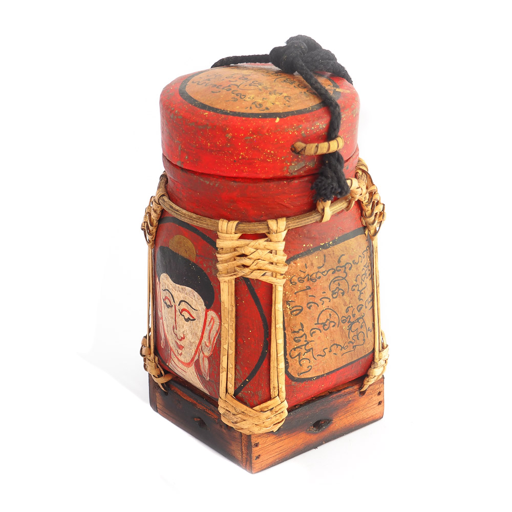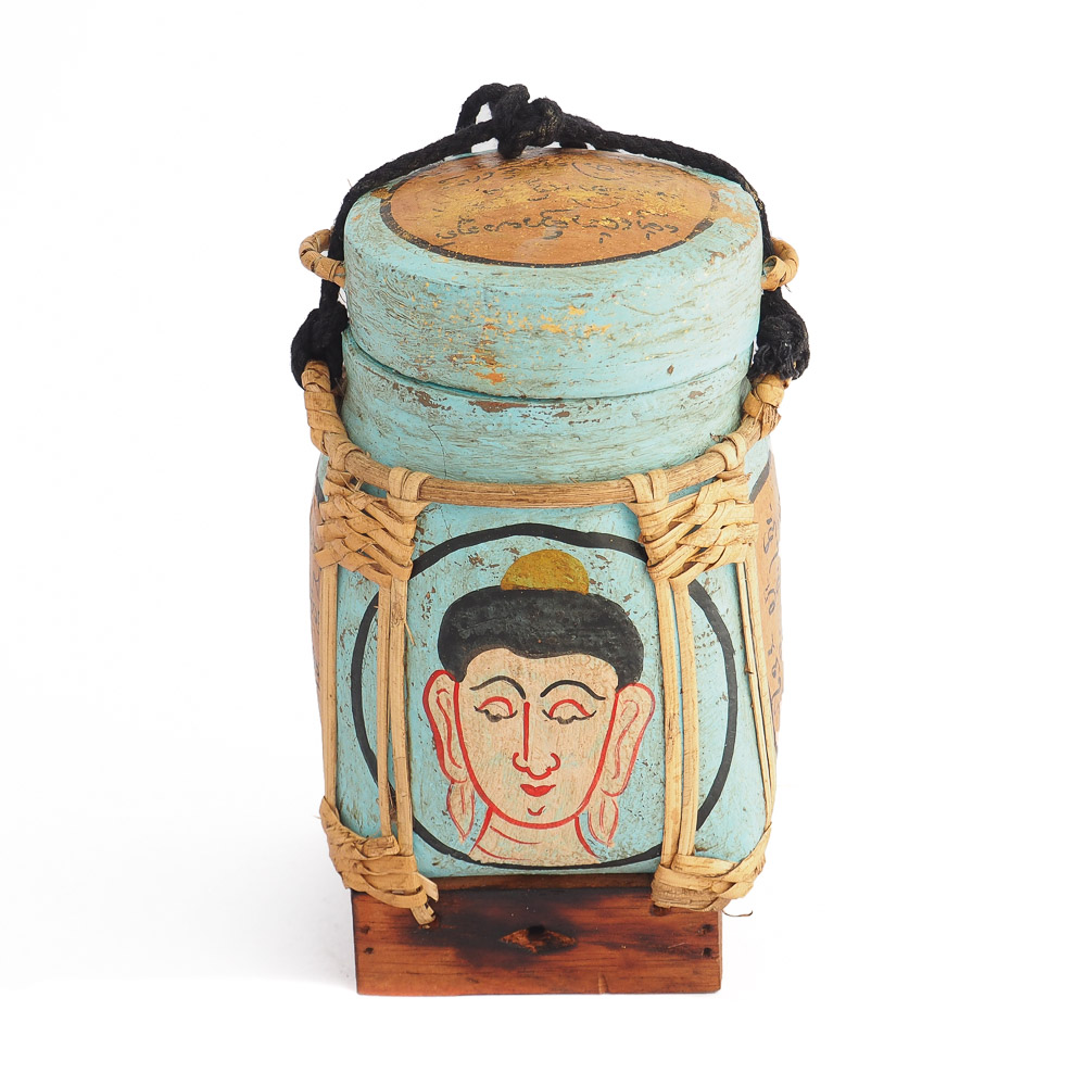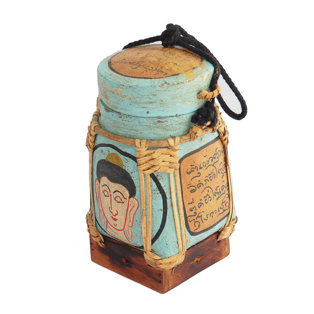 Asian storage container featuring a folk-art style Buddha portrait on soft turquoise background. This bamboo-woven vessel includes natural rattan accents, a coordinating lid, and wooden base. The rustic painted design combines traditional Thai craftsmanship with whimsical artistic elements.