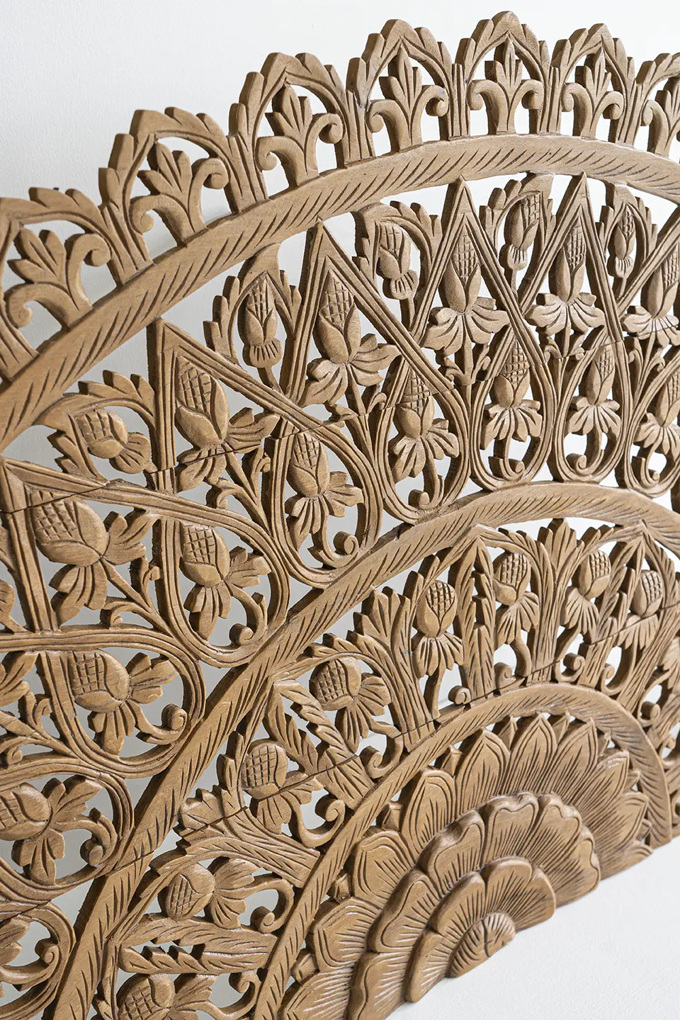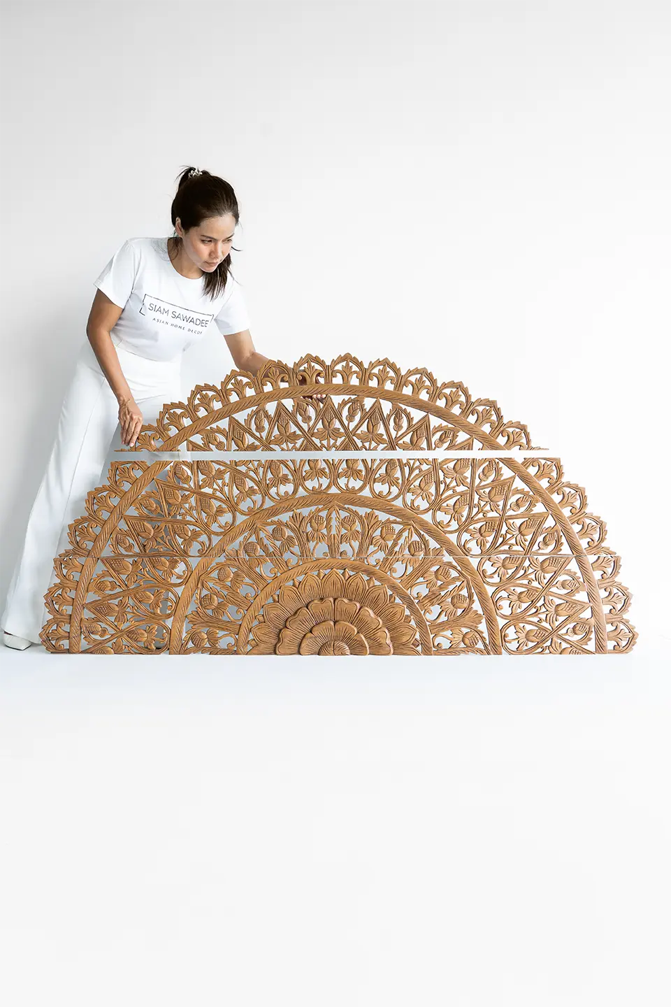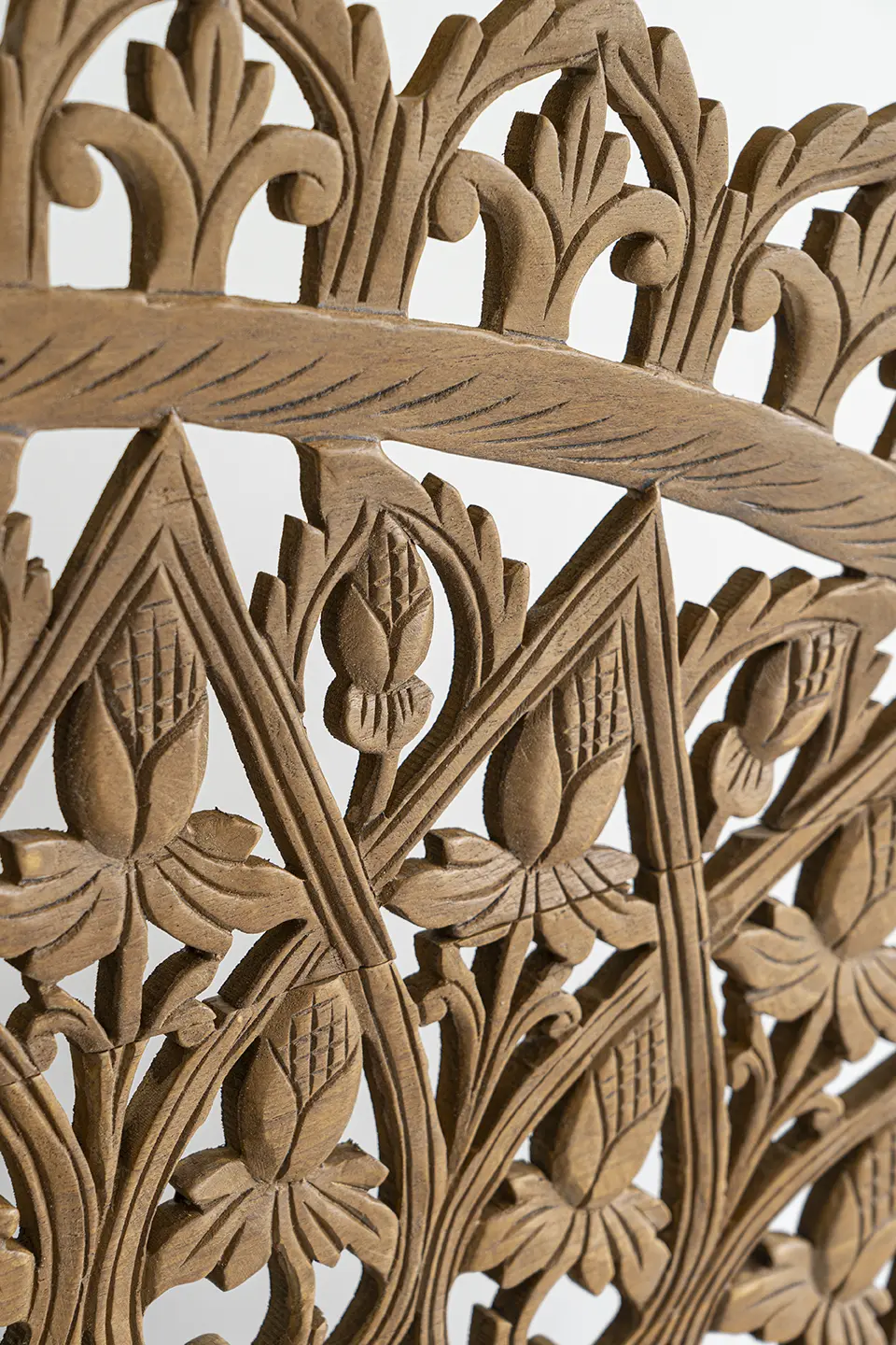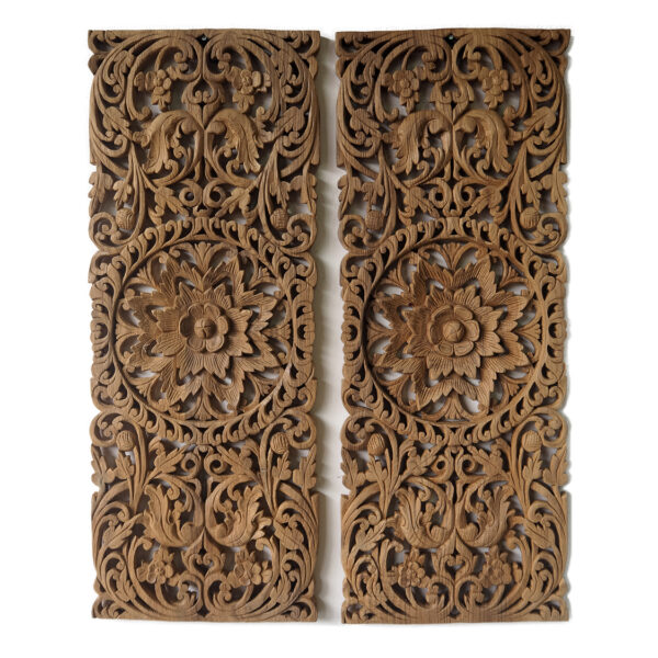 • Reclaimed Teak wood • Consists of 3 panels, 12″H each • Hand-carved — expect natural variations in pattern, color tone, wood grain, panel alignment, and up to ±1″ in width/height. Thickness may vary slightly due to carving. • Panel alignment may vary slightly due to handmade nature • Easy installation — metal hangers, screws, wall plugs, and instructions included • Optional wooden French cleat system available (additional cost) • Indoor use recommended; outdoor use possible only under covered areas (avoid direct sun/rain). Apply a clear outdoor wood sealant if placing outside. • Wipe with a dry cloth |