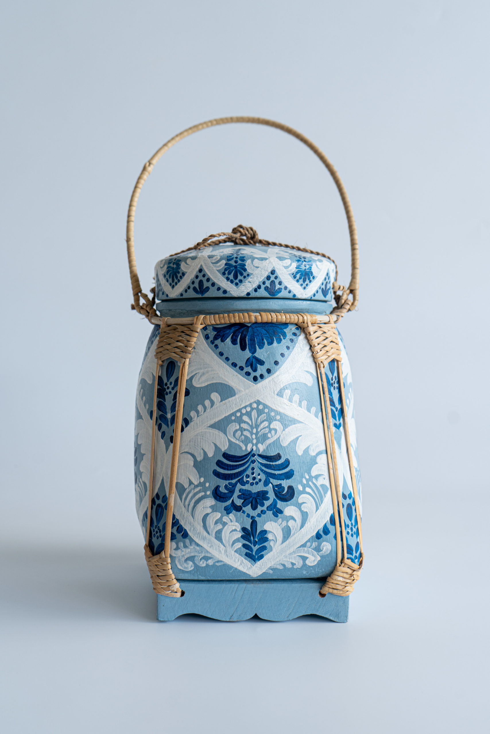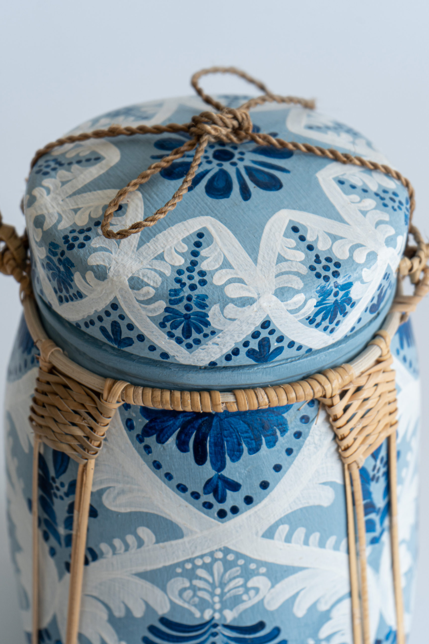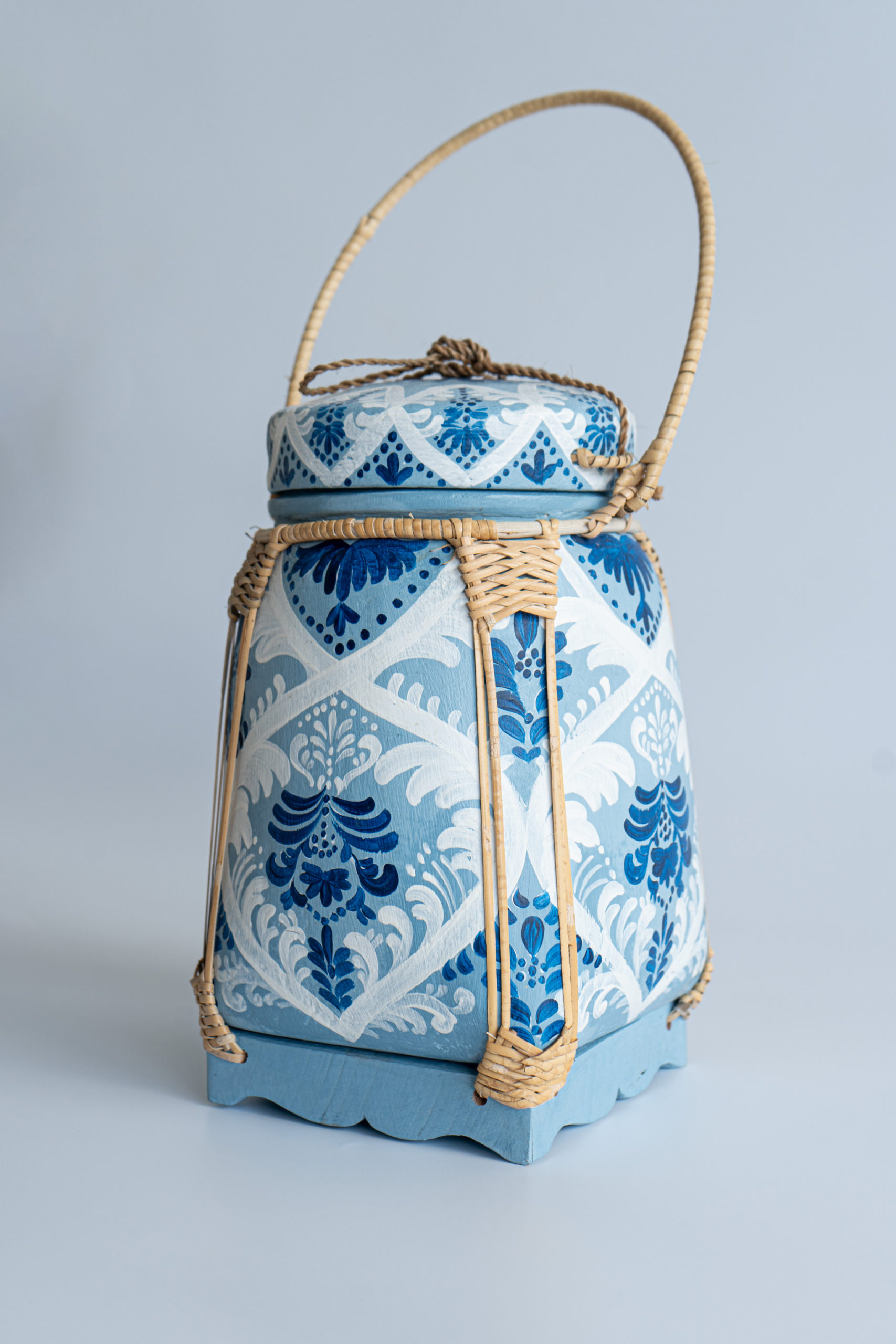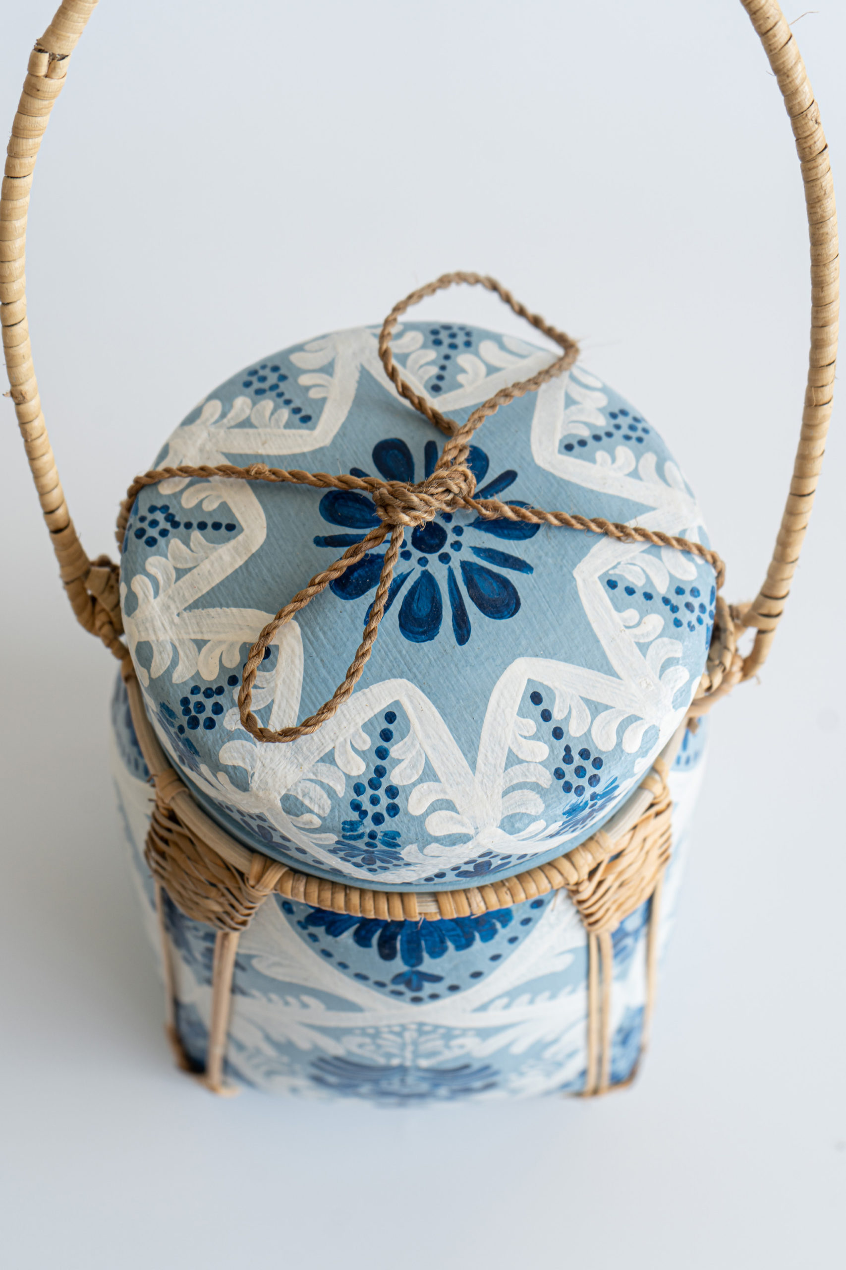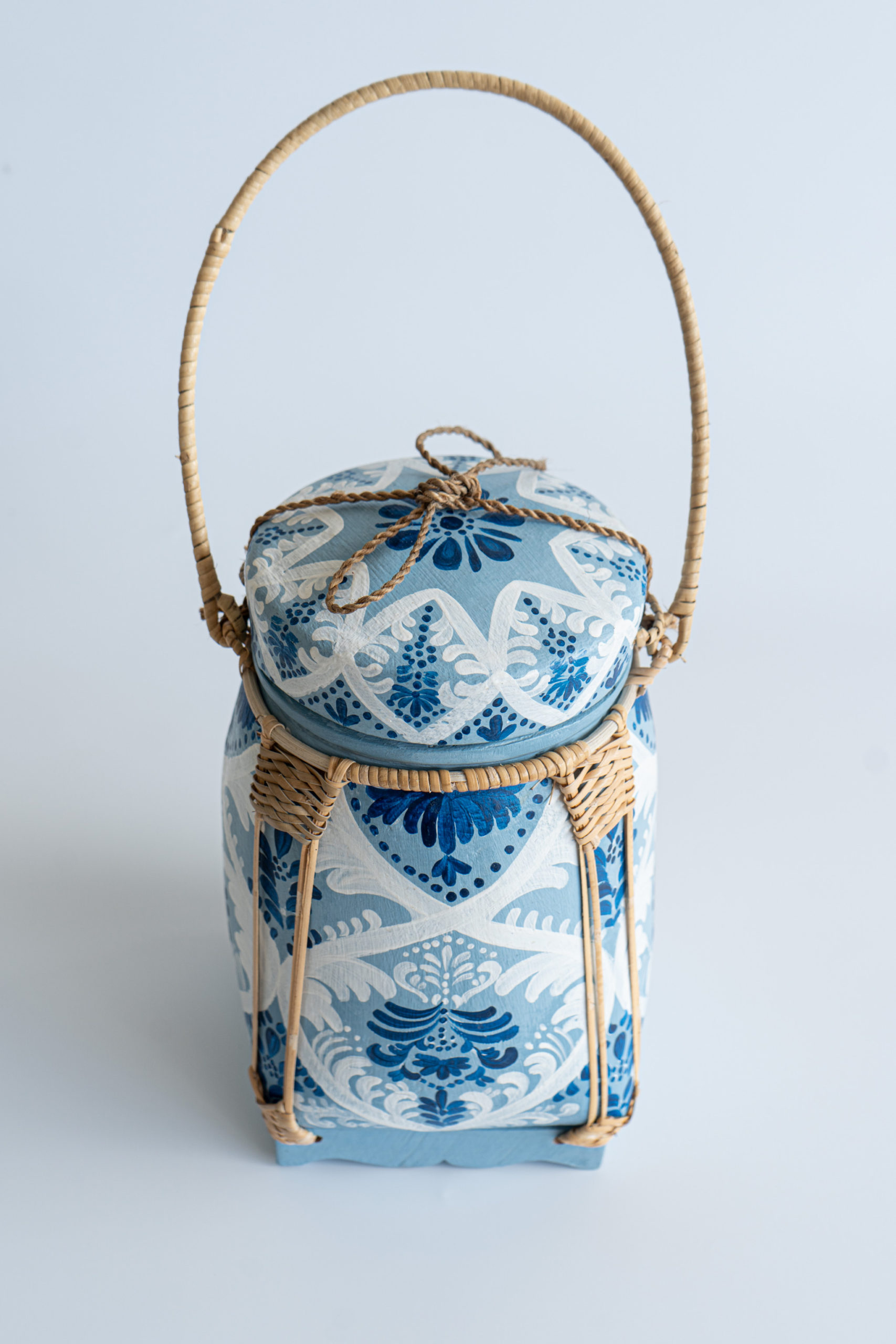 Coastal Thai storage basket featuring intricate damask-style patterns in varying shades of blue and white. The handcrafted piece combines traditional bamboo weaving with a carrying handle and decorative rattan supports. Its coordinating lid and base complete this versatile and stylish container.