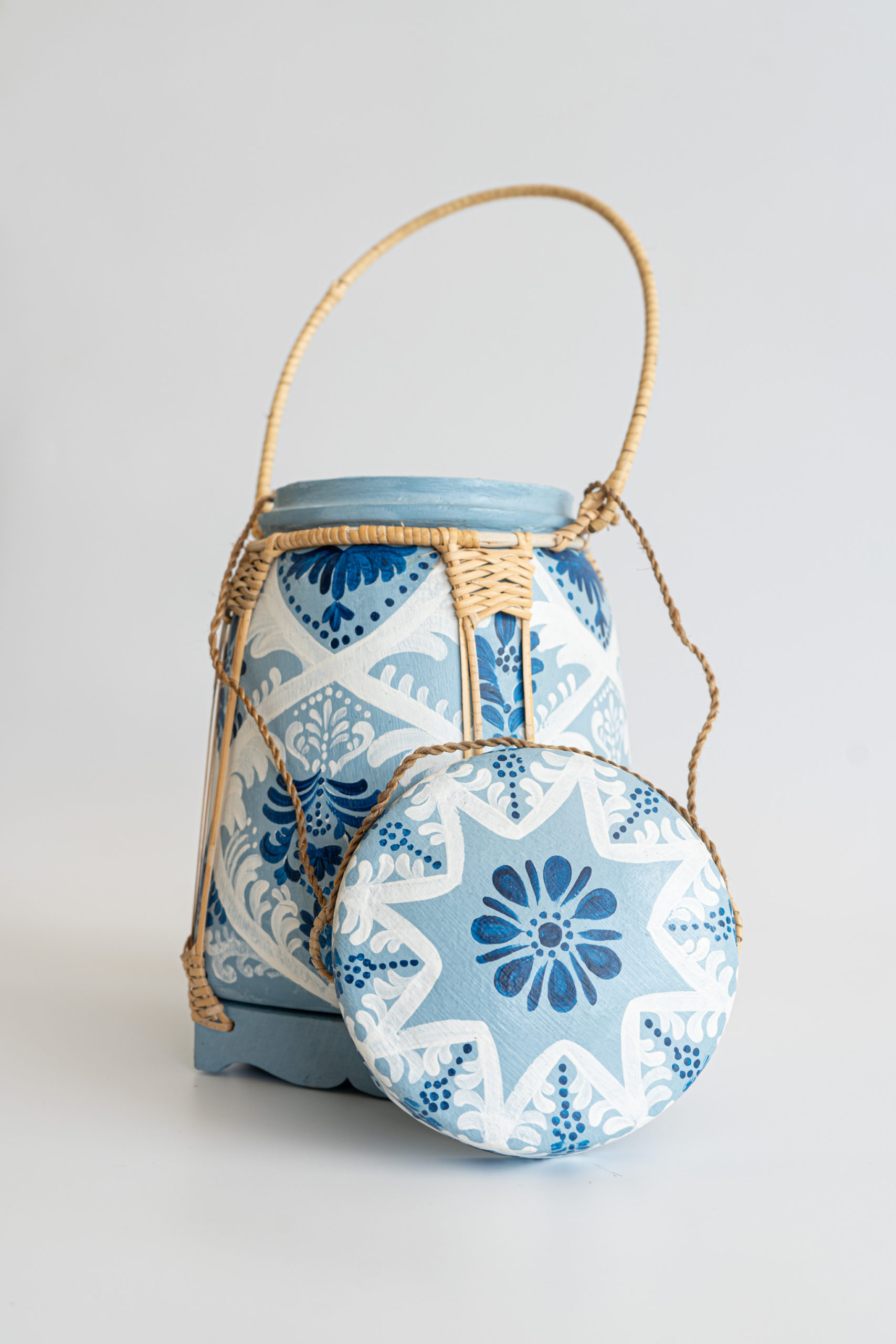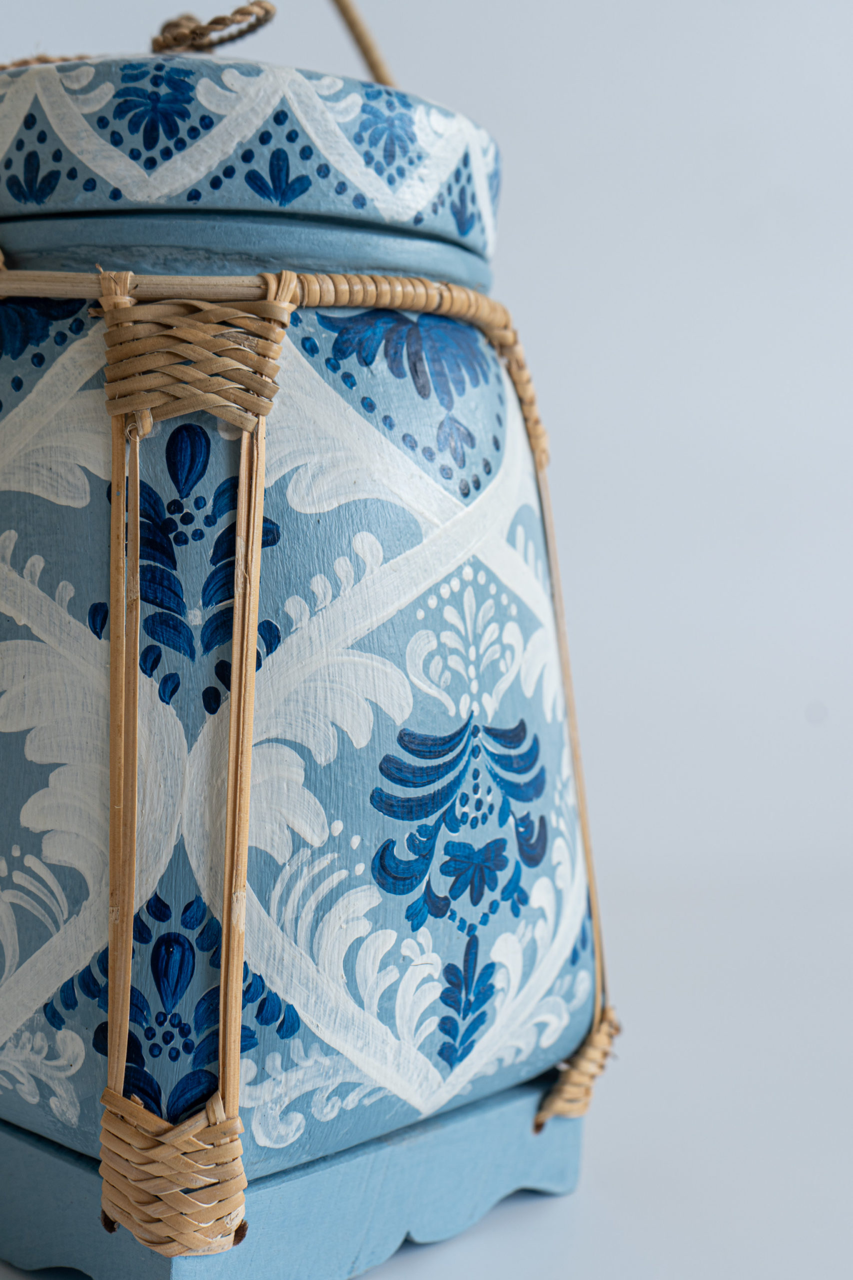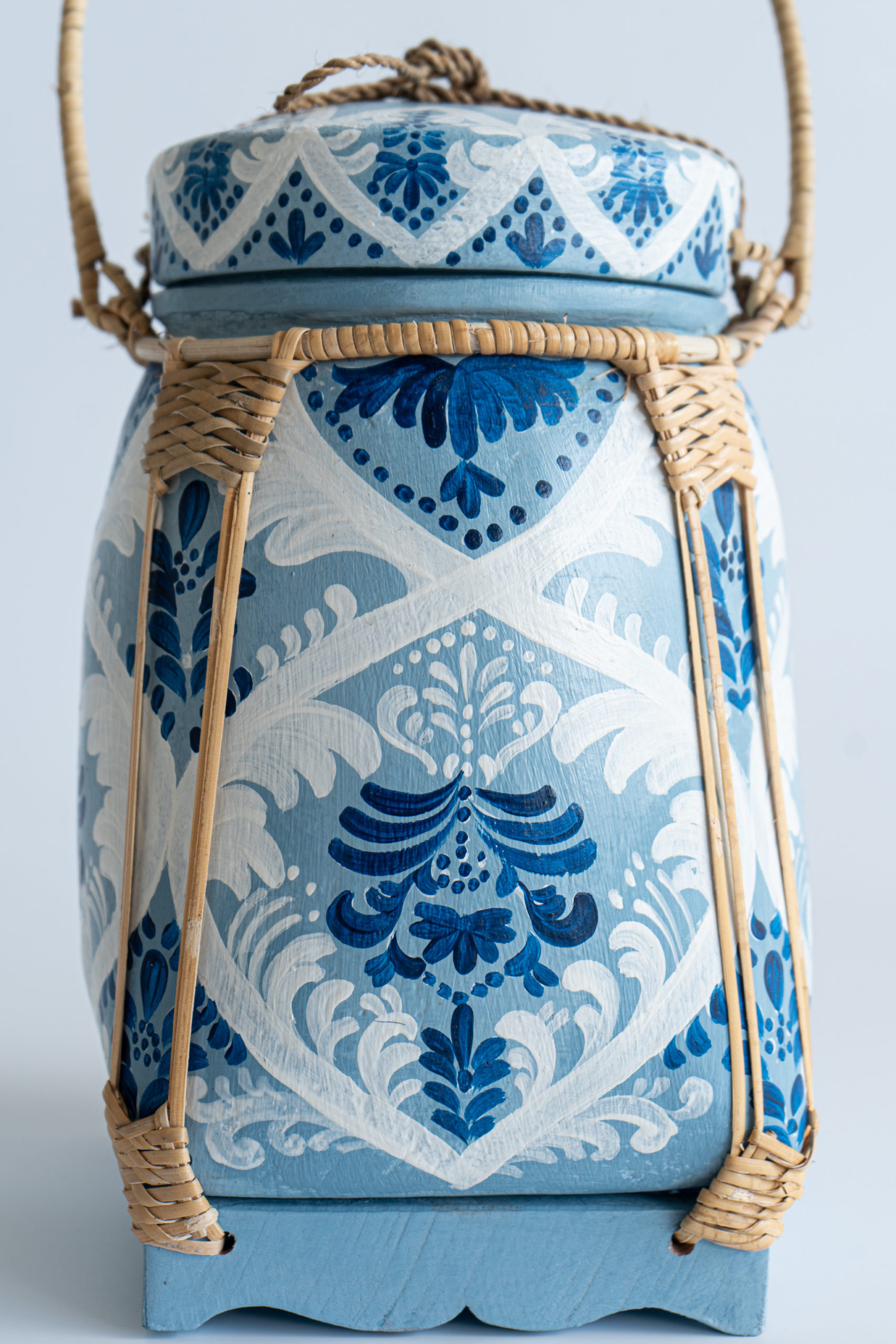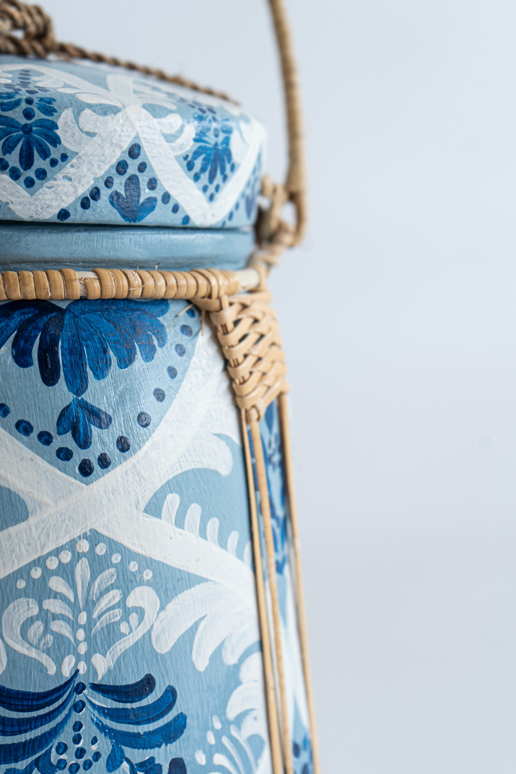 Coastal Thai storage basket featuring intricate damask-style patterns in varying shades of blue and white. The handcrafted piece combines traditional bamboo weaving with a carrying handle and decorative rattan supports. Its coordinating lid and base complete this versatile and stylish container.