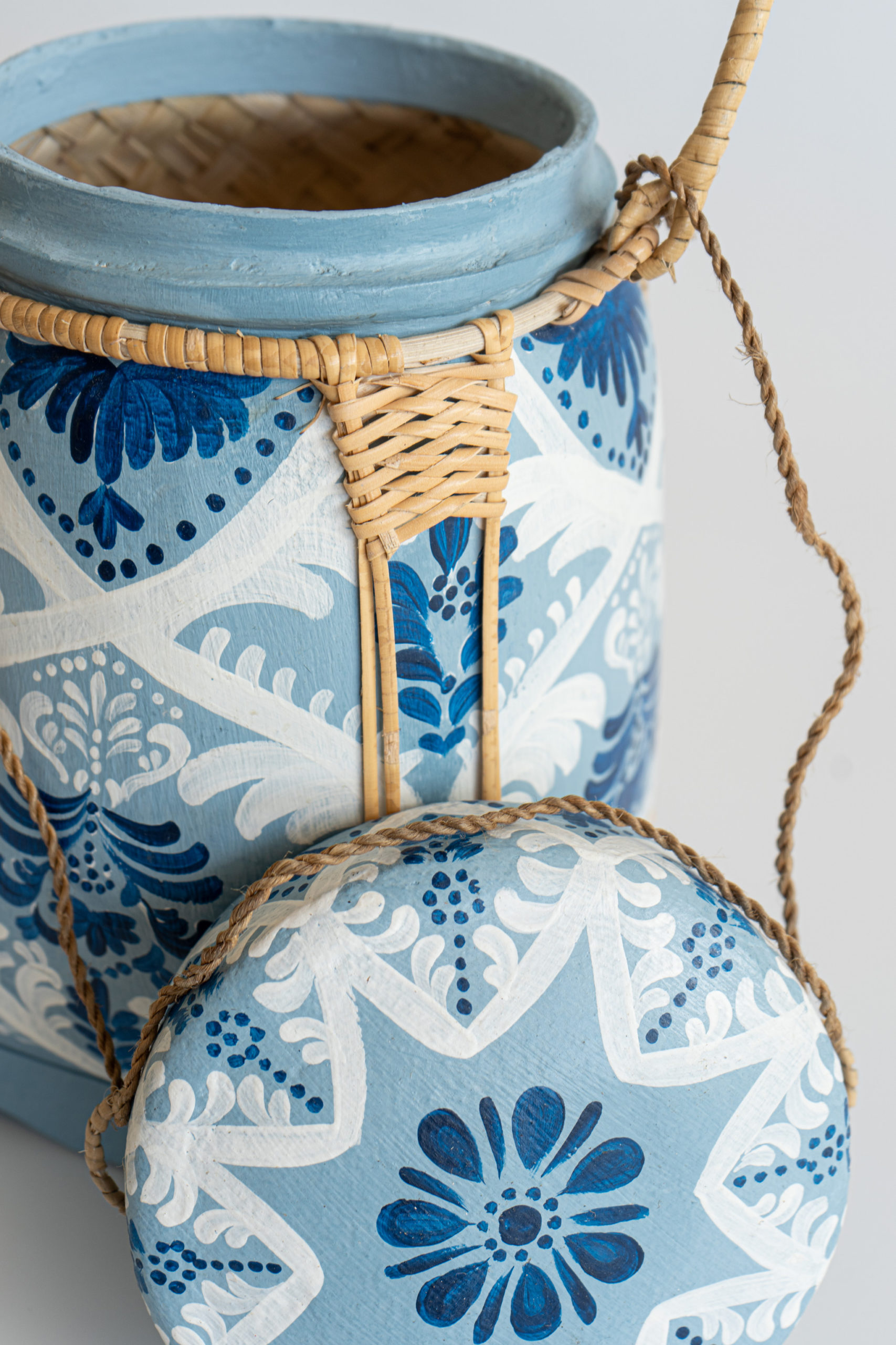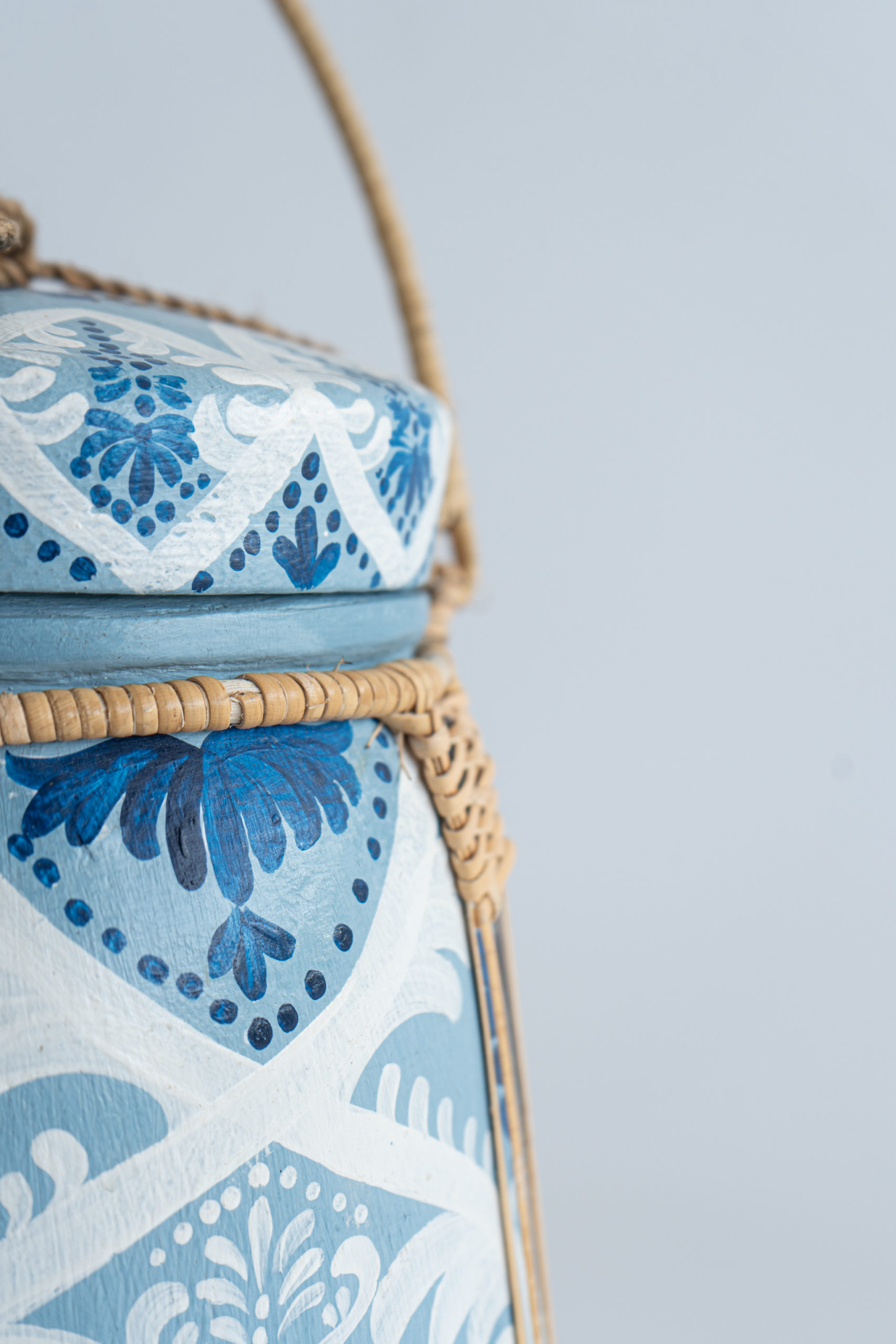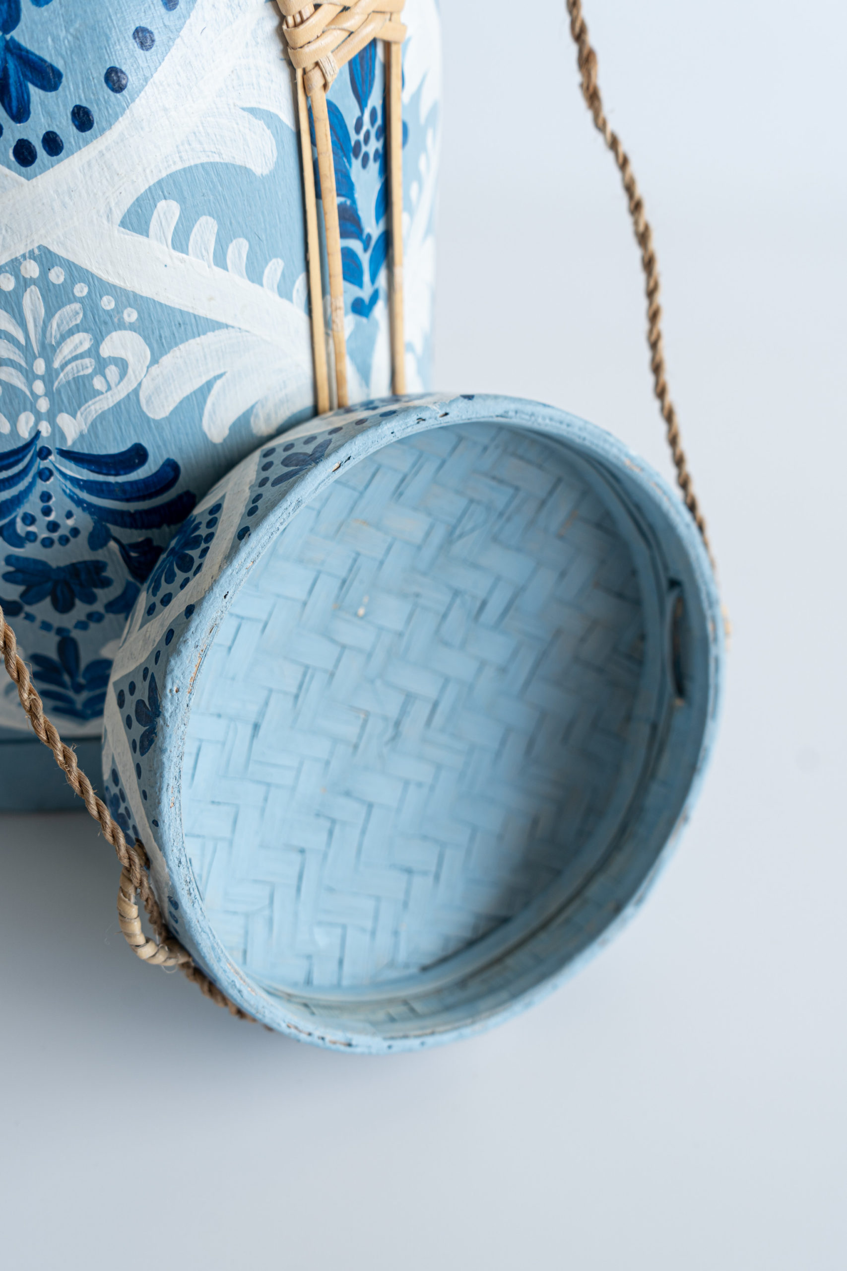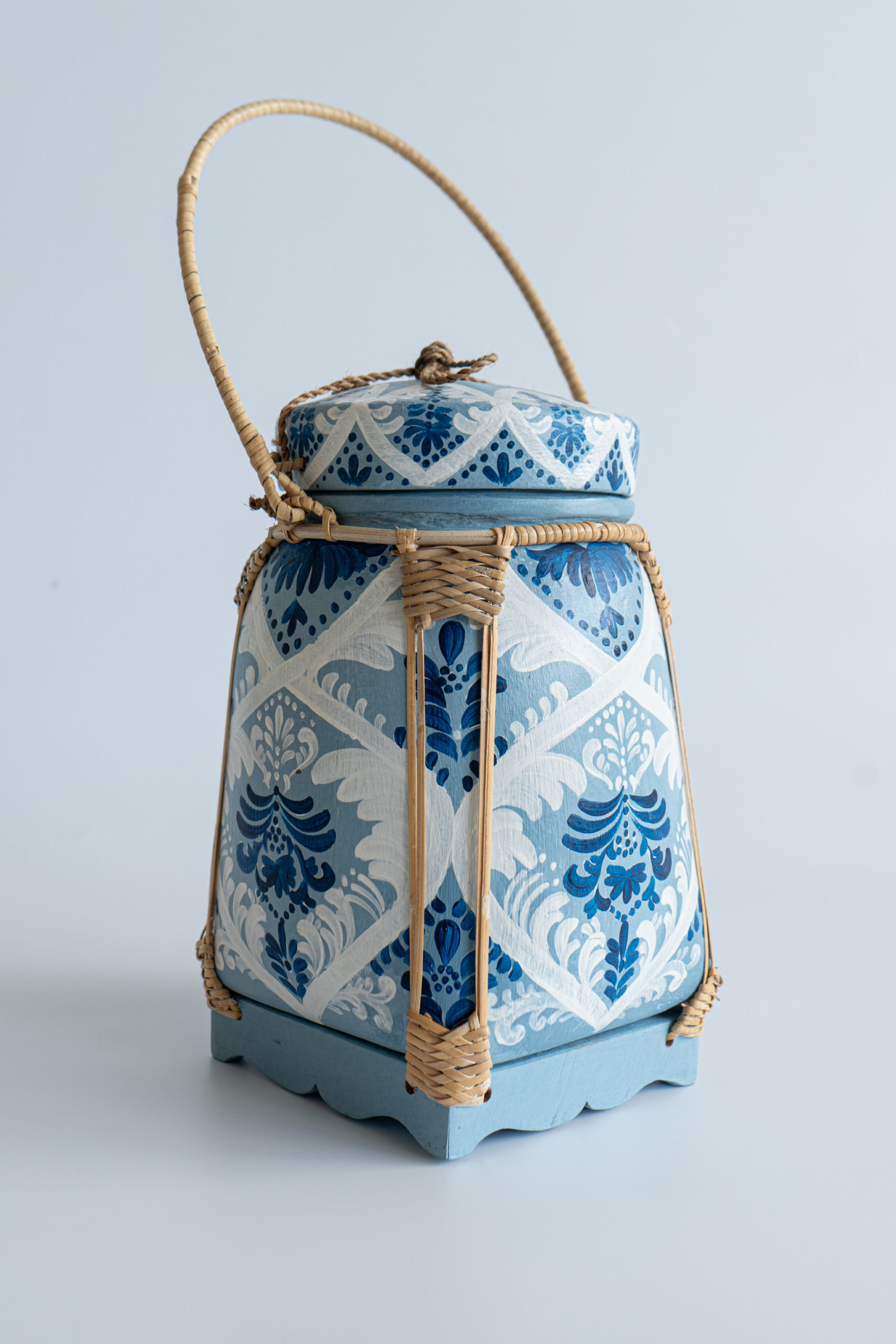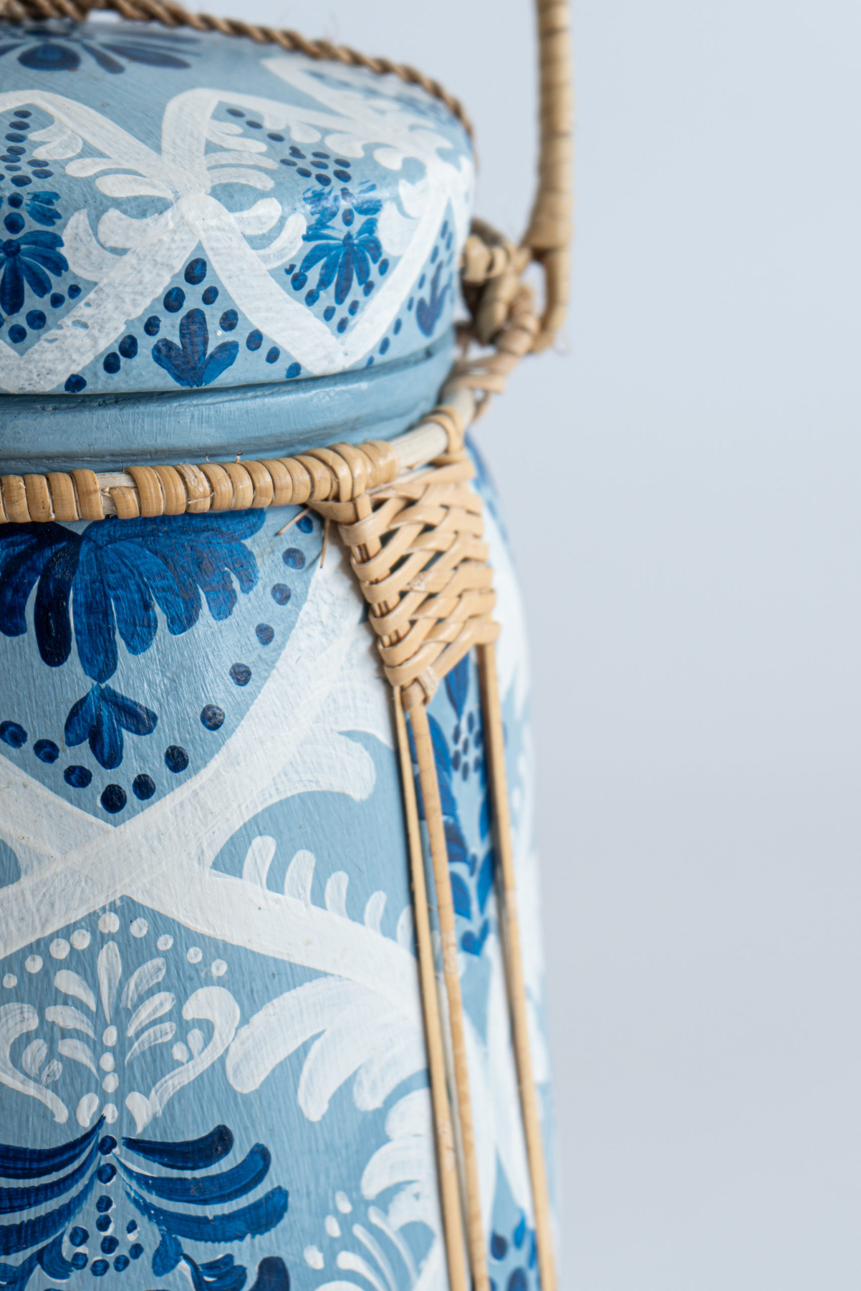 Coastal Thai storage basket featuring intricate damask-style patterns in varying shades of blue and white. The handcrafted piece combines traditional bamboo weaving with a carrying handle and decorative rattan supports. Its coordinating lid and base complete this versatile and stylish container.