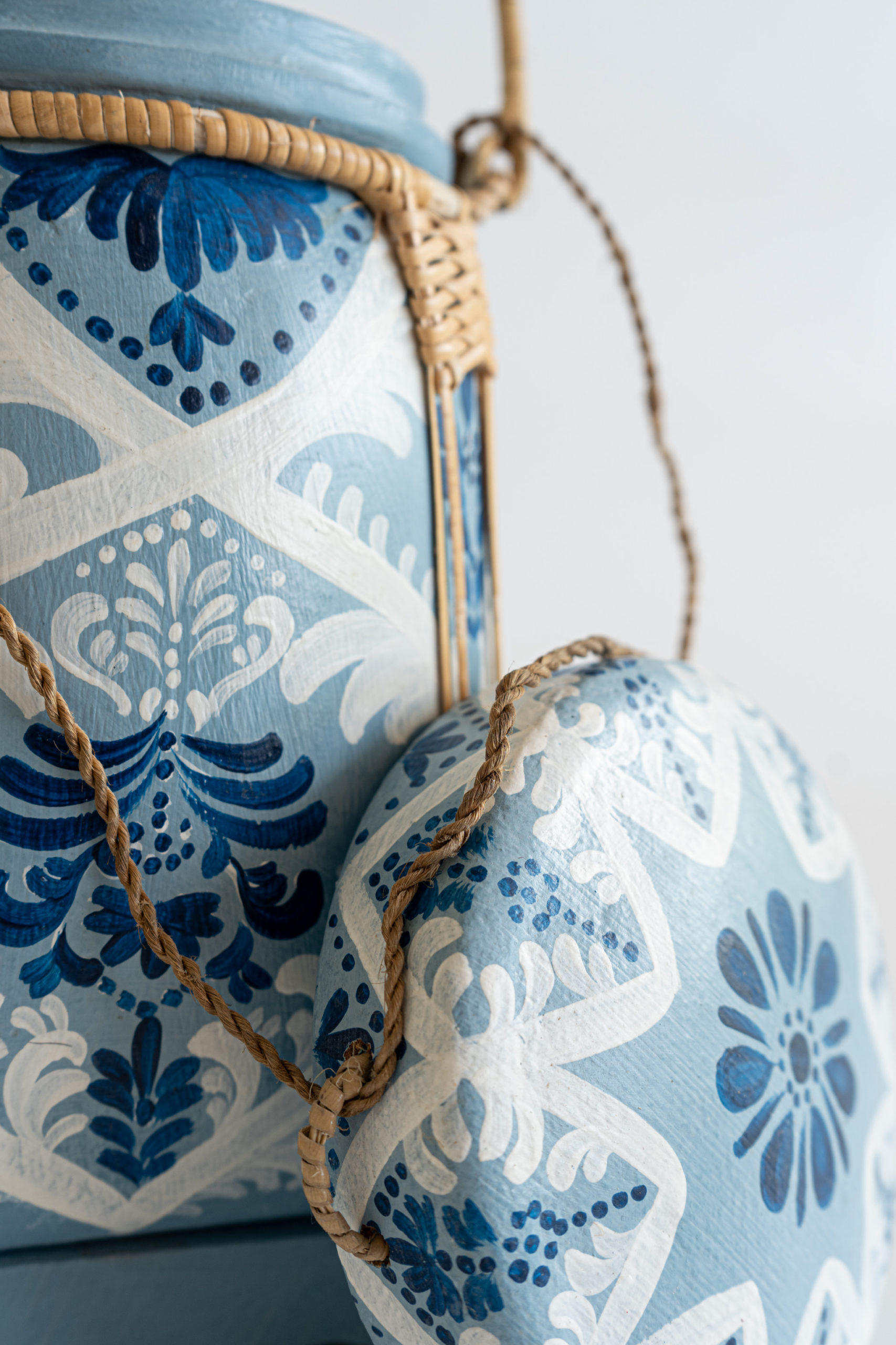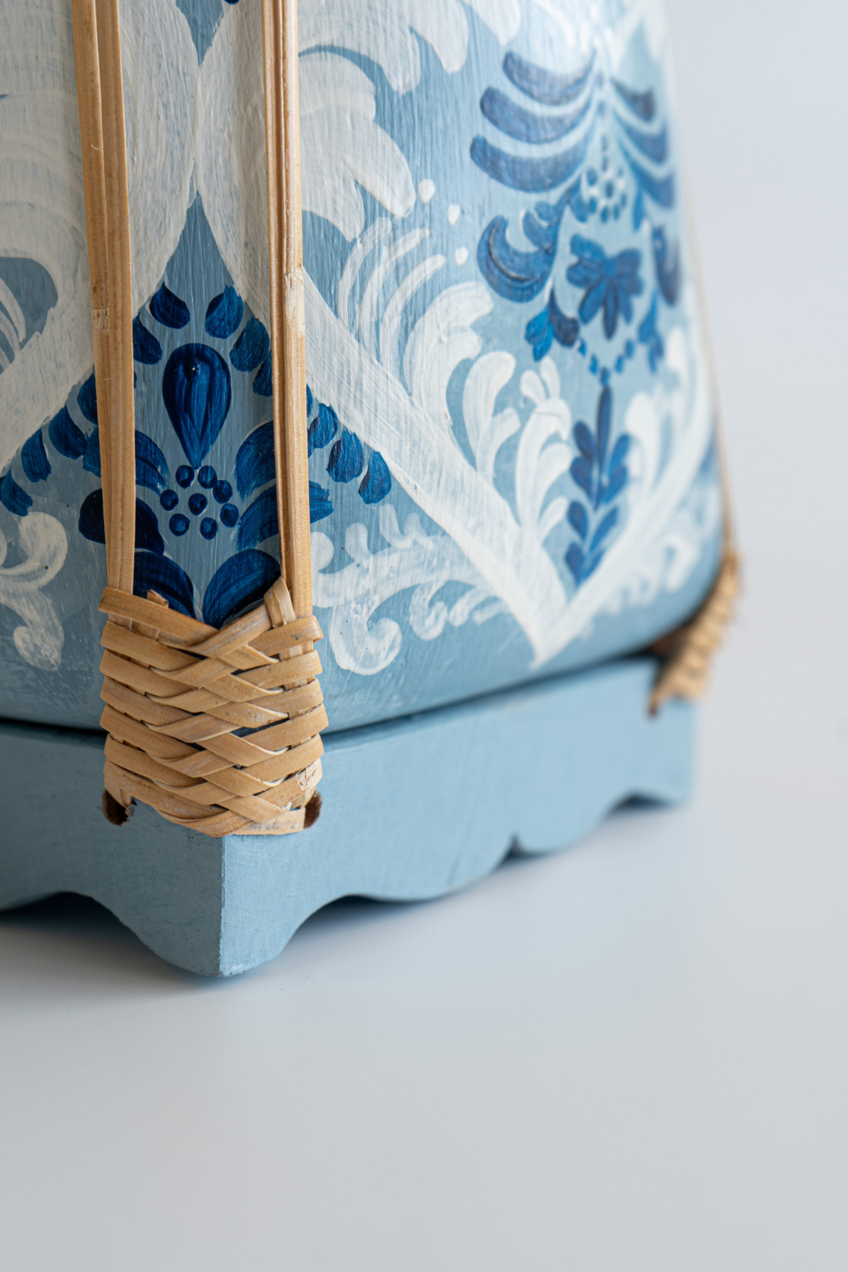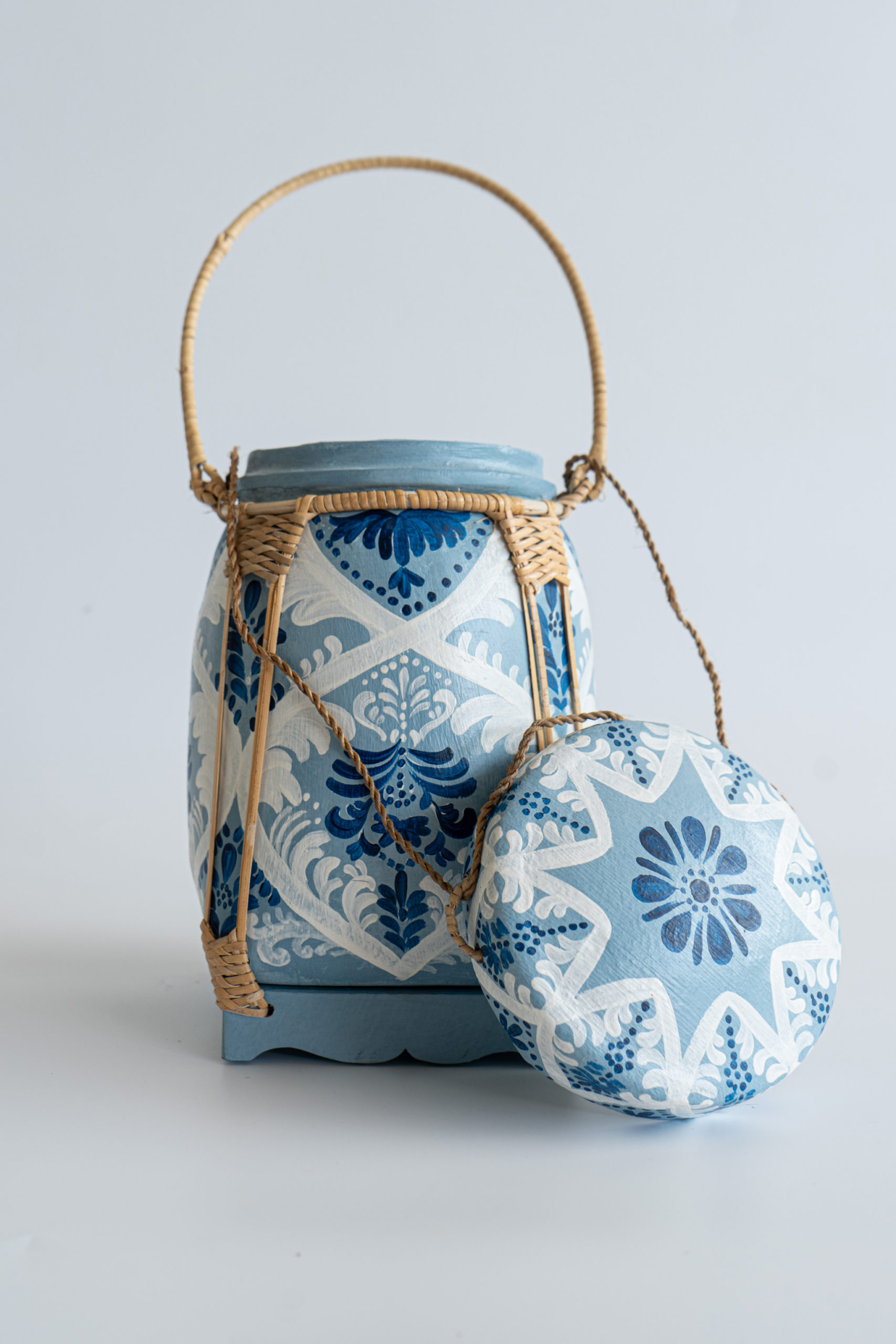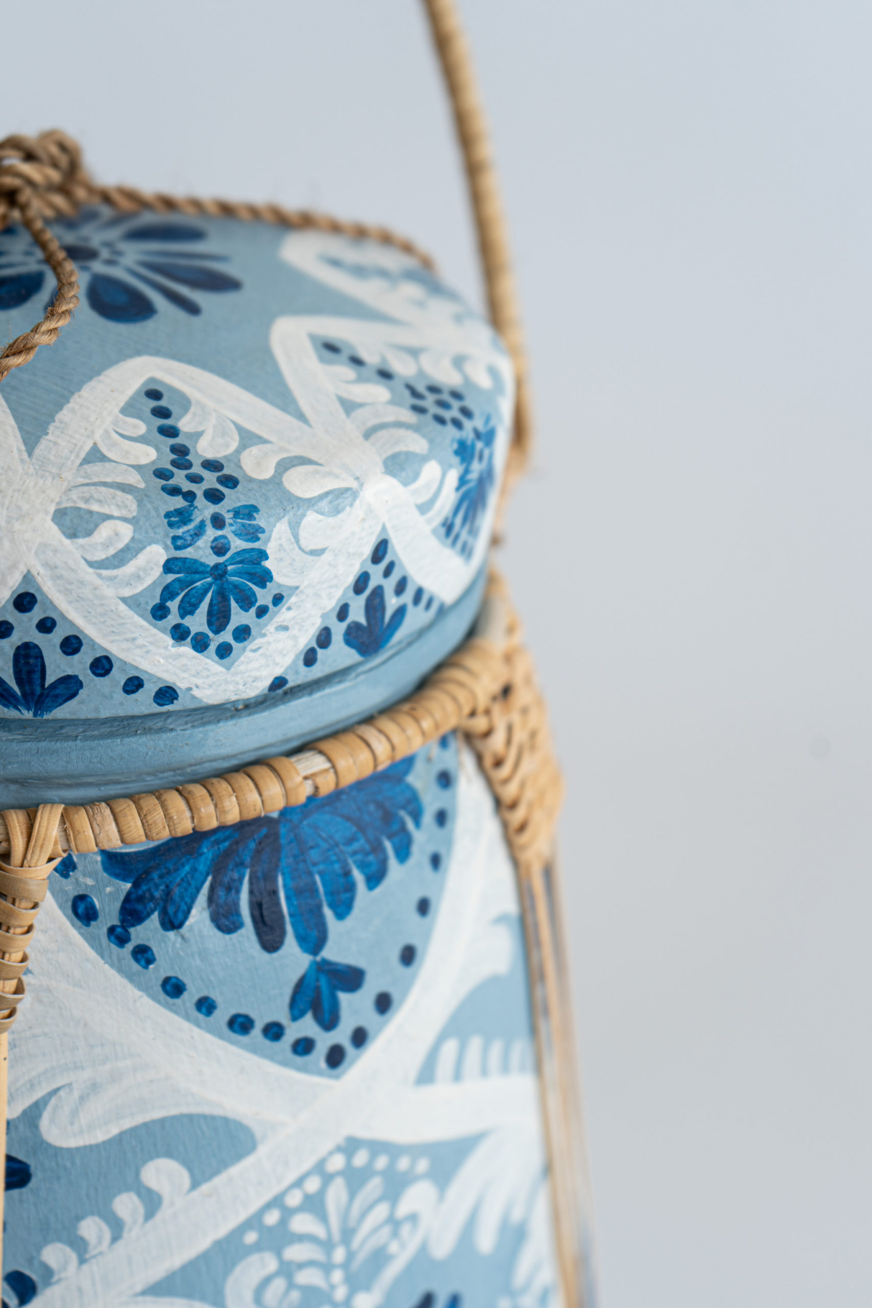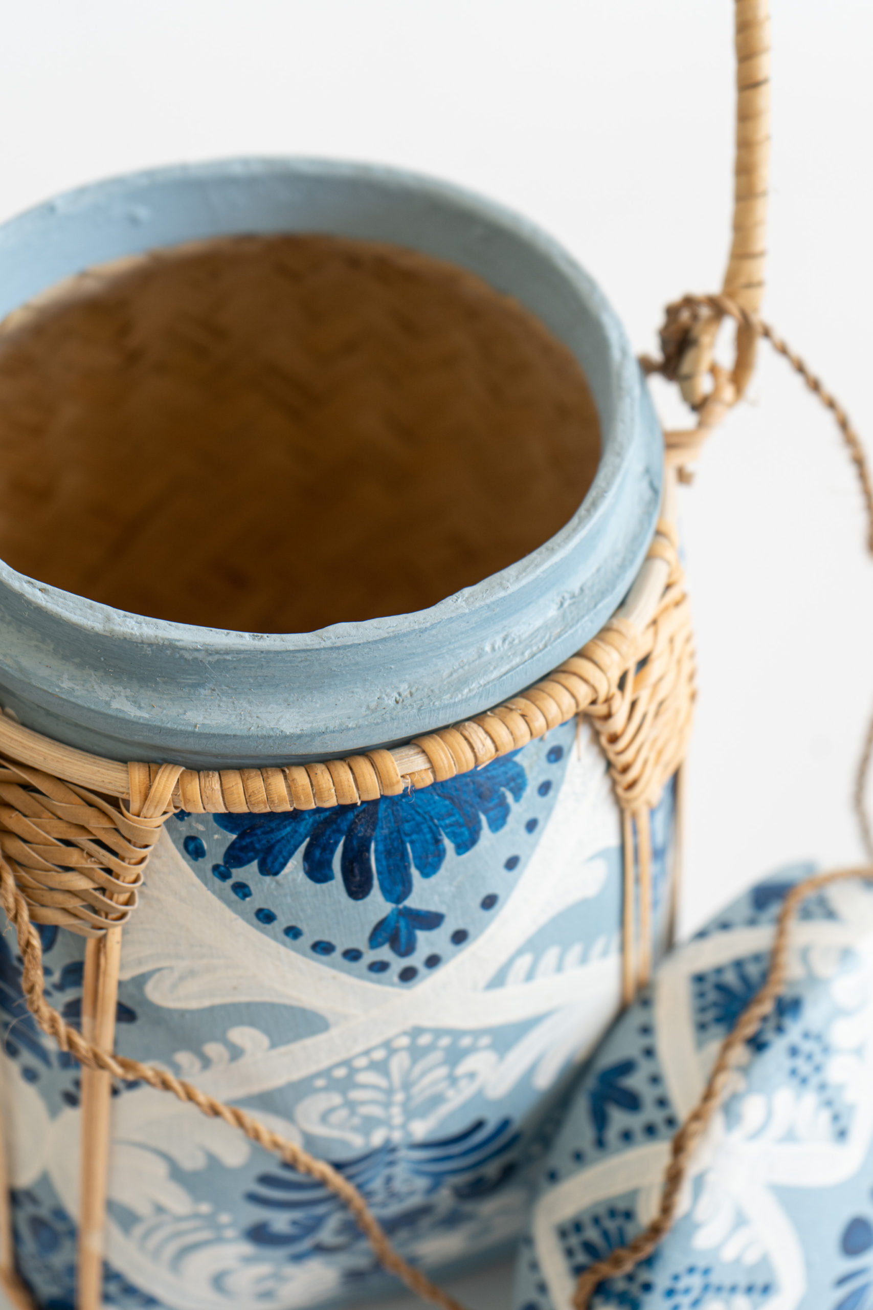 Coastal Thai storage basket featuring intricate damask-style patterns in varying shades of blue and white. The handcrafted piece combines traditional bamboo weaving with a carrying handle and decorative rattan supports. Its coordinating lid and base complete this versatile and stylish container.