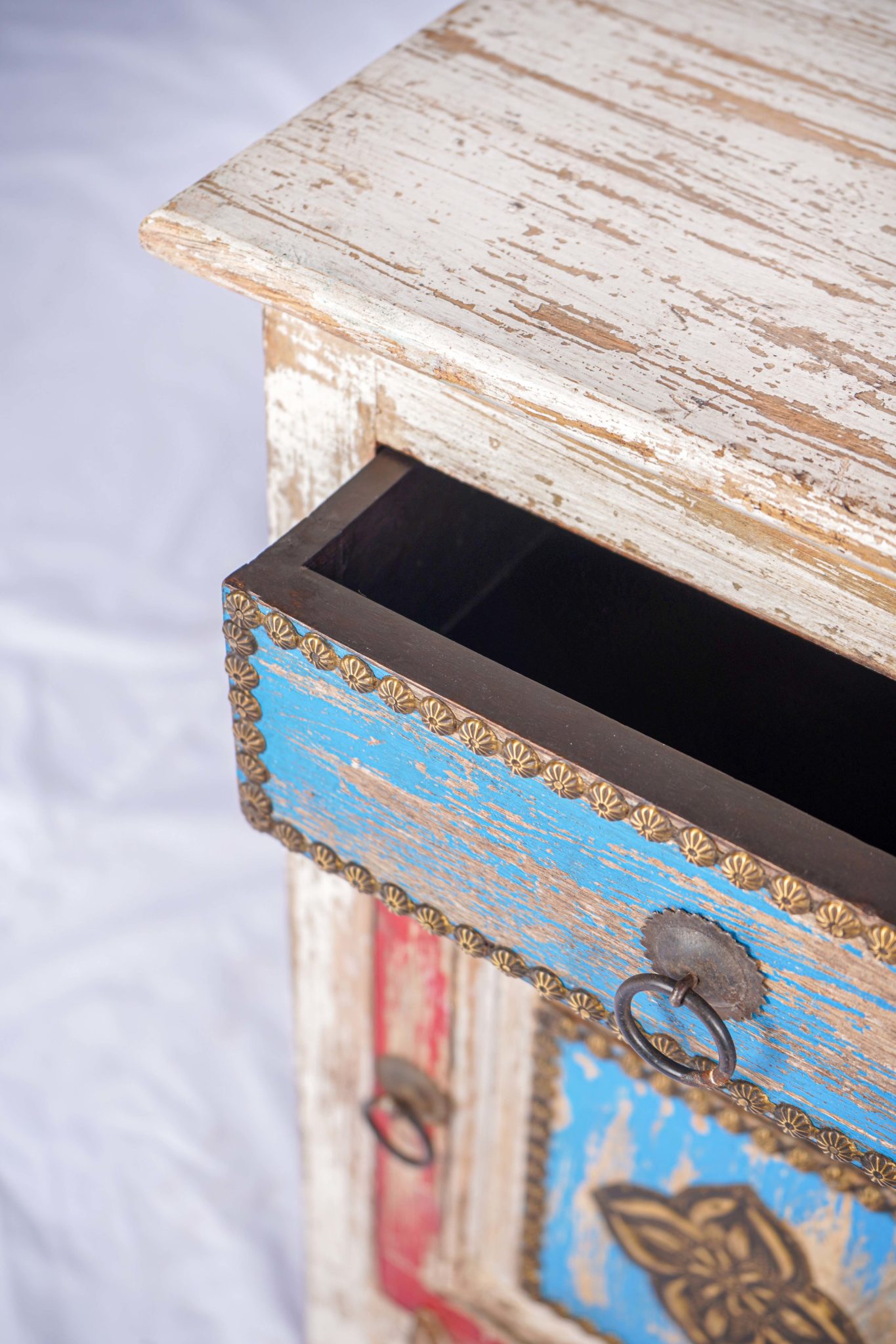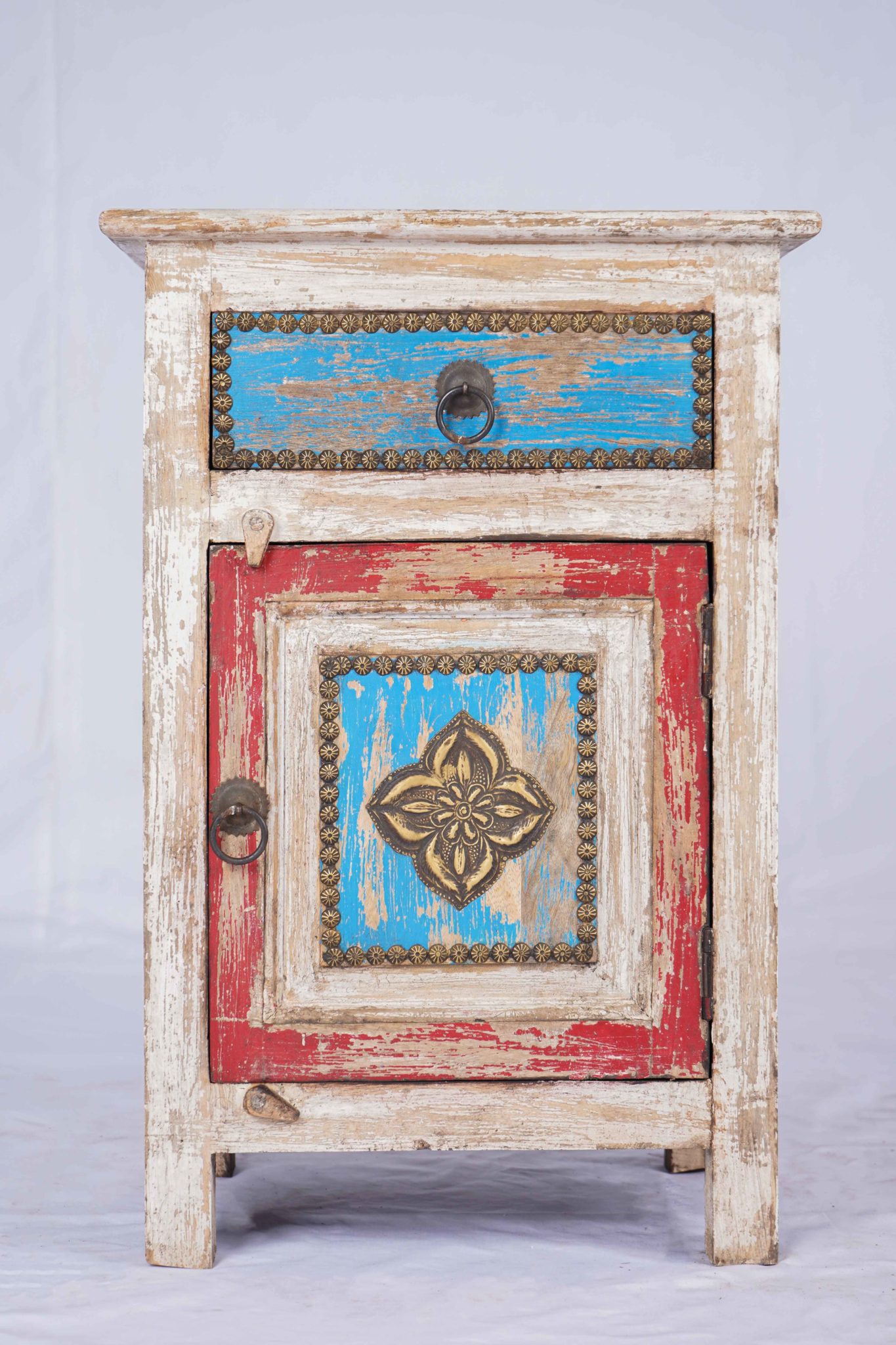 Incredibly bright pop colours washed out to give this unique vintage aspect. This pleasant side table will bring warmth to your home decor.