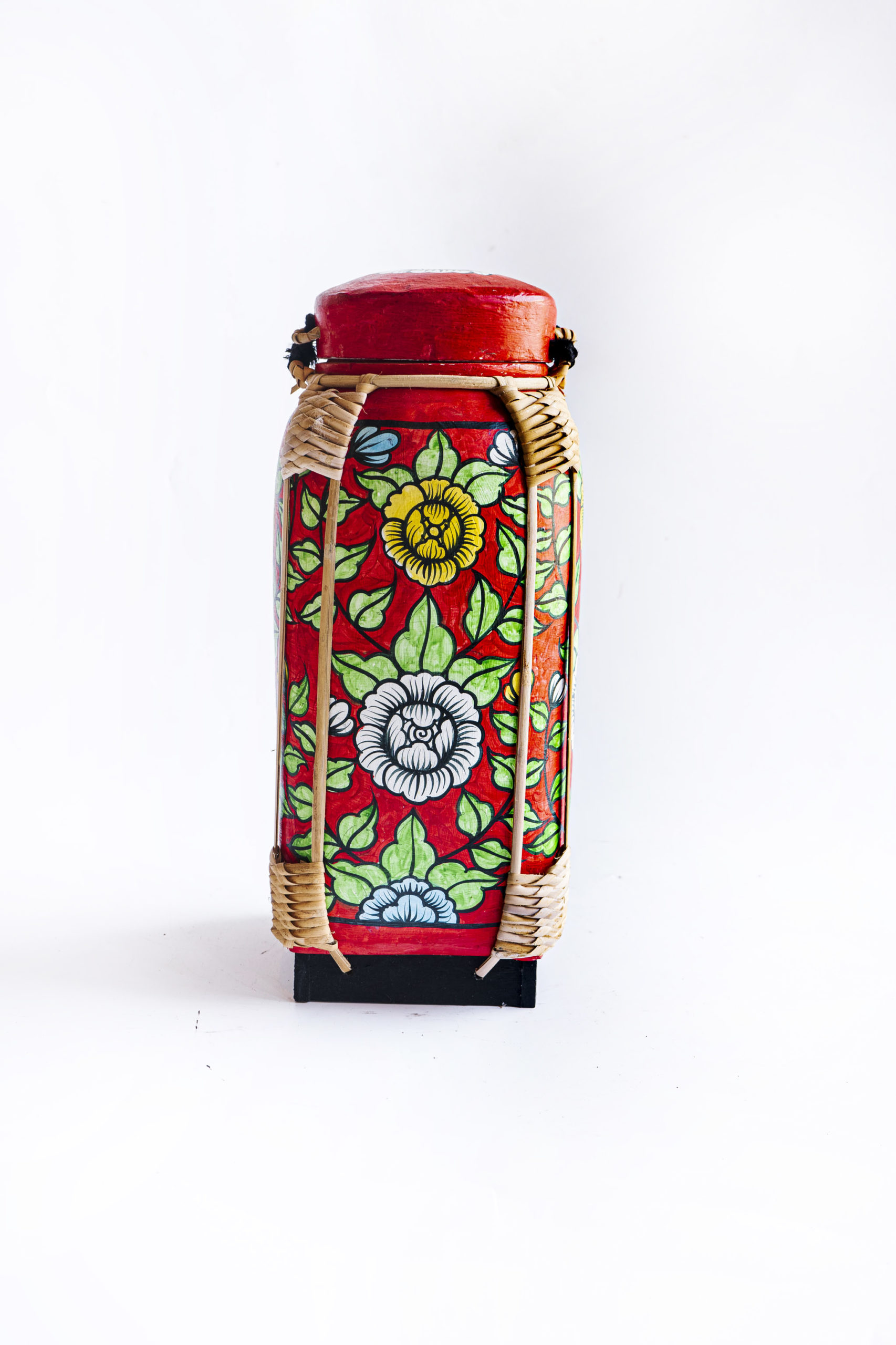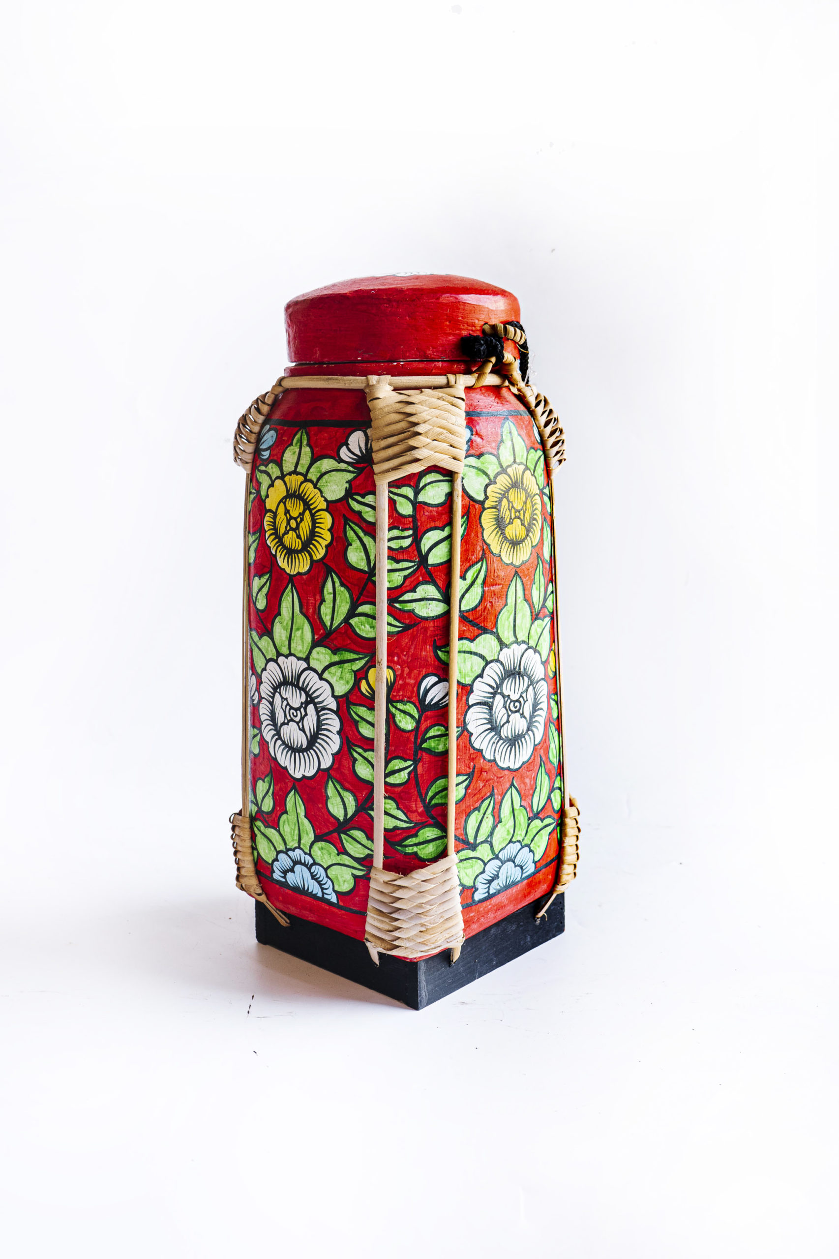 Handcrafted in Chiang Mai, this Thai rice basket features vibrant yellow and white florals on a bold red background. The bamboo weaving, adorned with clay artwork and rattan corners, comes complete with matching red lid and wooden base.