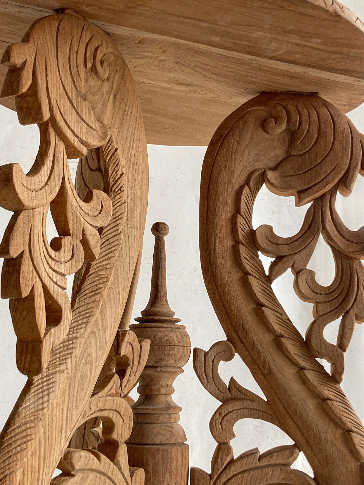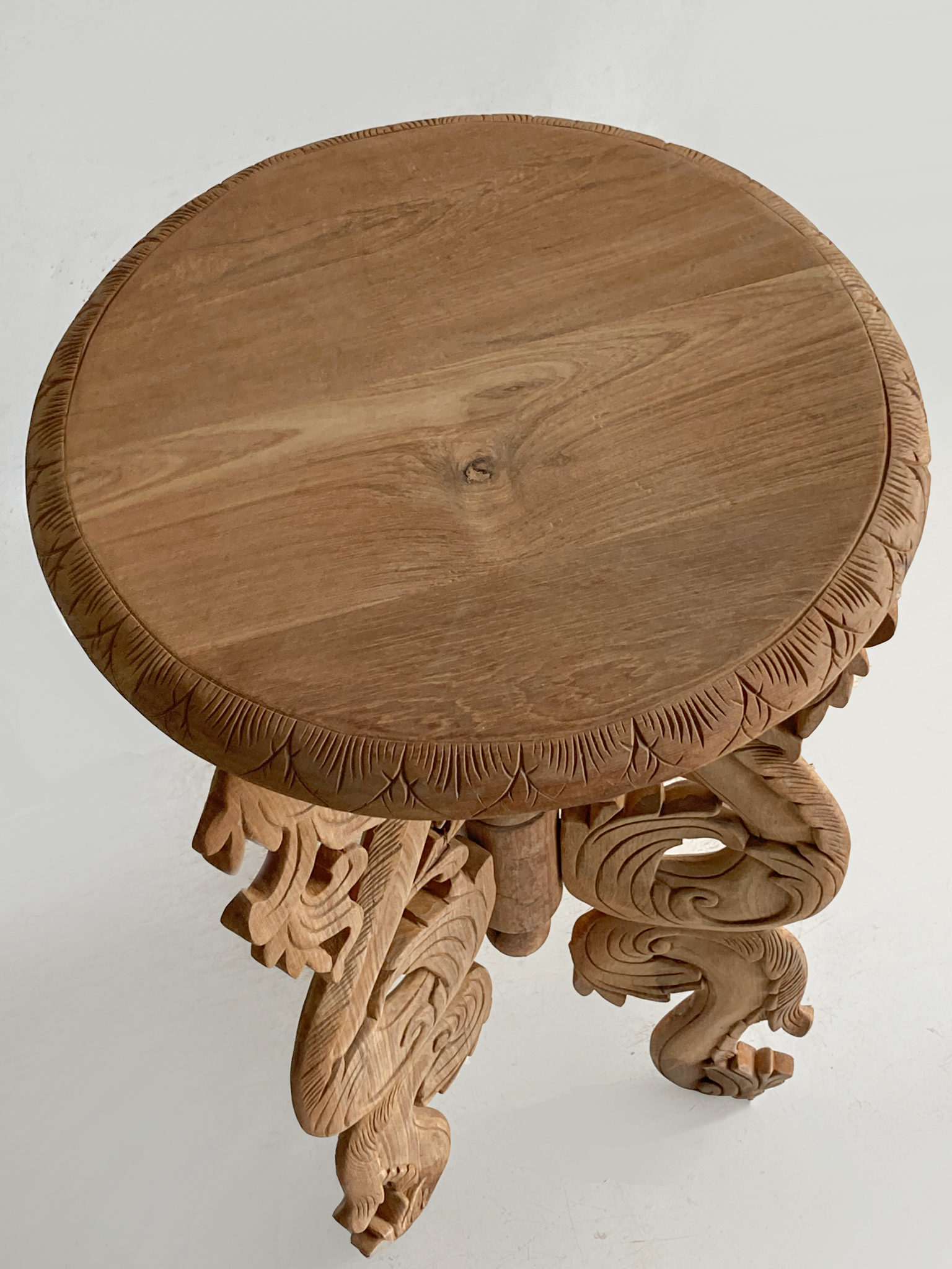 | Content & Care | • Hand-carved Teak side table • Comes in 5 pieces • Due to the nature of handmade, expect a slightly difference in the appearance of each unique piece, sizes may vary from 0.5 inches • Dusting is best done with a soft, lint-free cloth • If a liquid spill occurs prompt cleaning is advised • Do not use harsh solvents or chemicals • Clean carving grooves with small, soft brush • Do not place hot items directly on surface • Do not sliding objects on furniture’s surface; always lift and place objects |