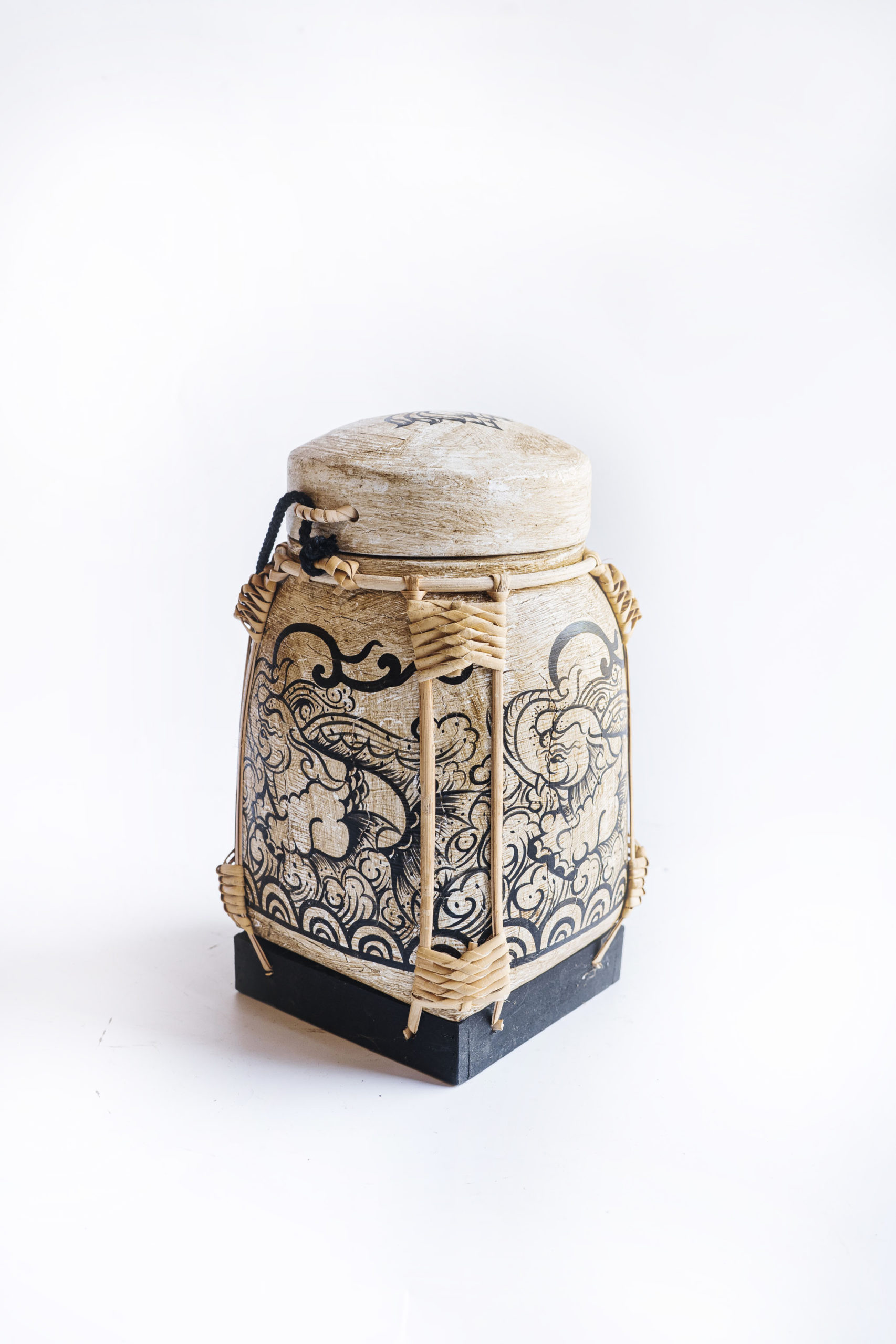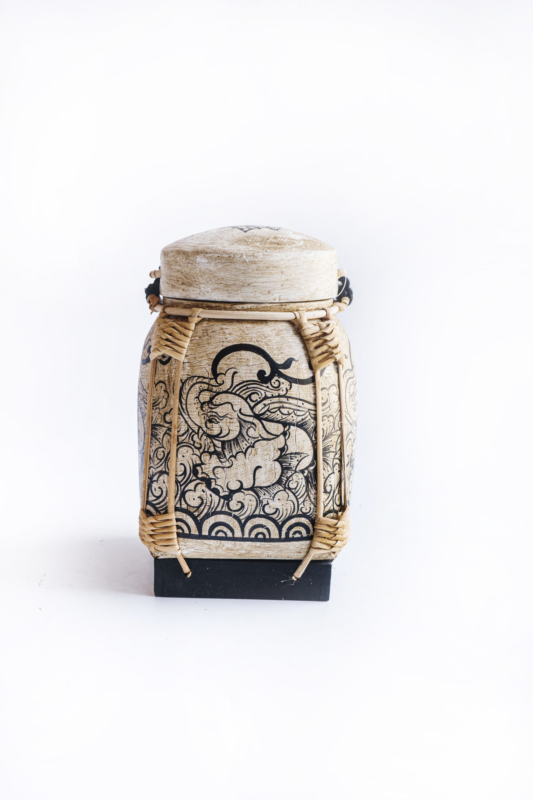 This ethereal Thai basket showcases a mythical elephant emerging from swirling clouds, painted in black brushstrokes on a whitewashed background. The traditional design combines bamboo weaving with rattan supports, creating an elegant storage vessel with spiritual symbolism.