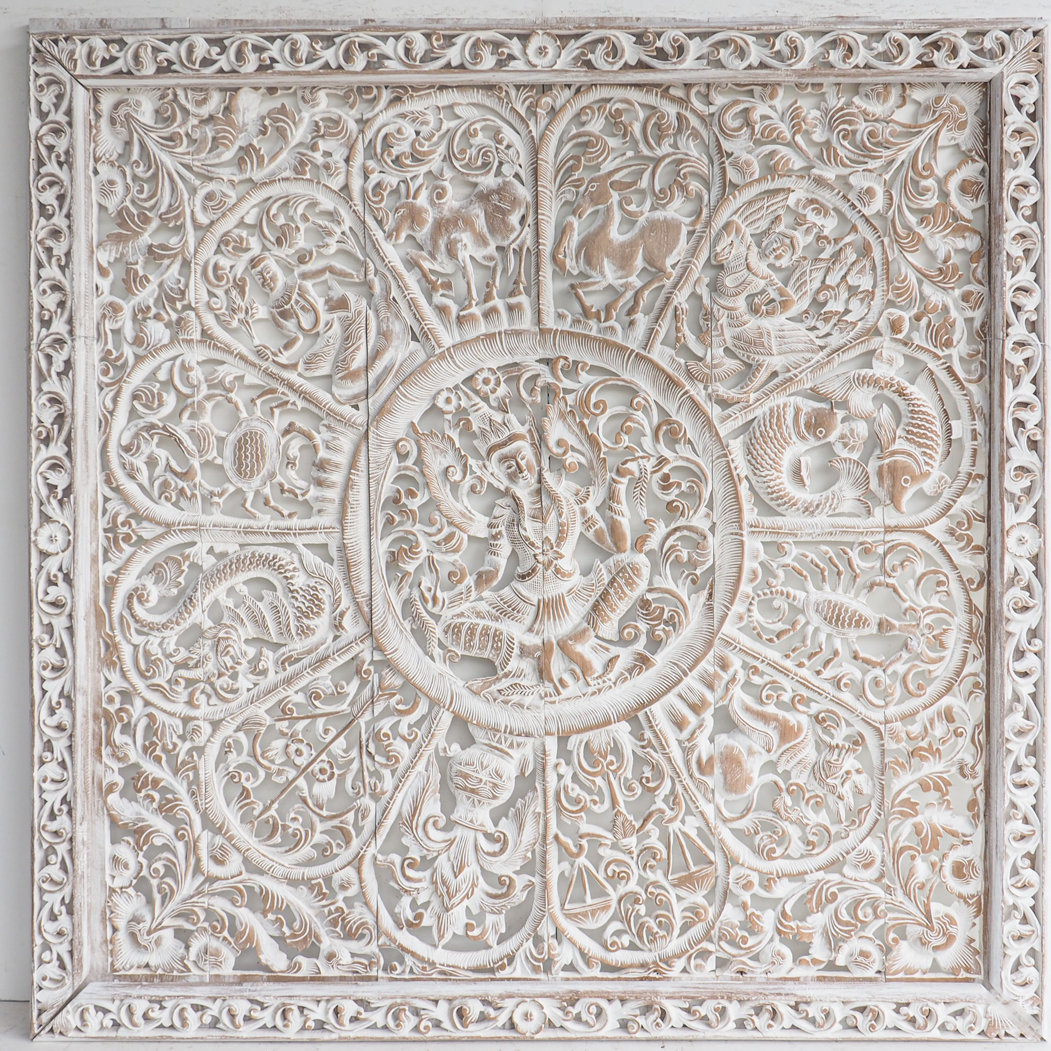 This carving exhibits a captivating three-dimensional motif of vines and lotus blooms. Mounted on a wall or leaning on a side-board or table, the panel merges design complexity with meditative tranquility.