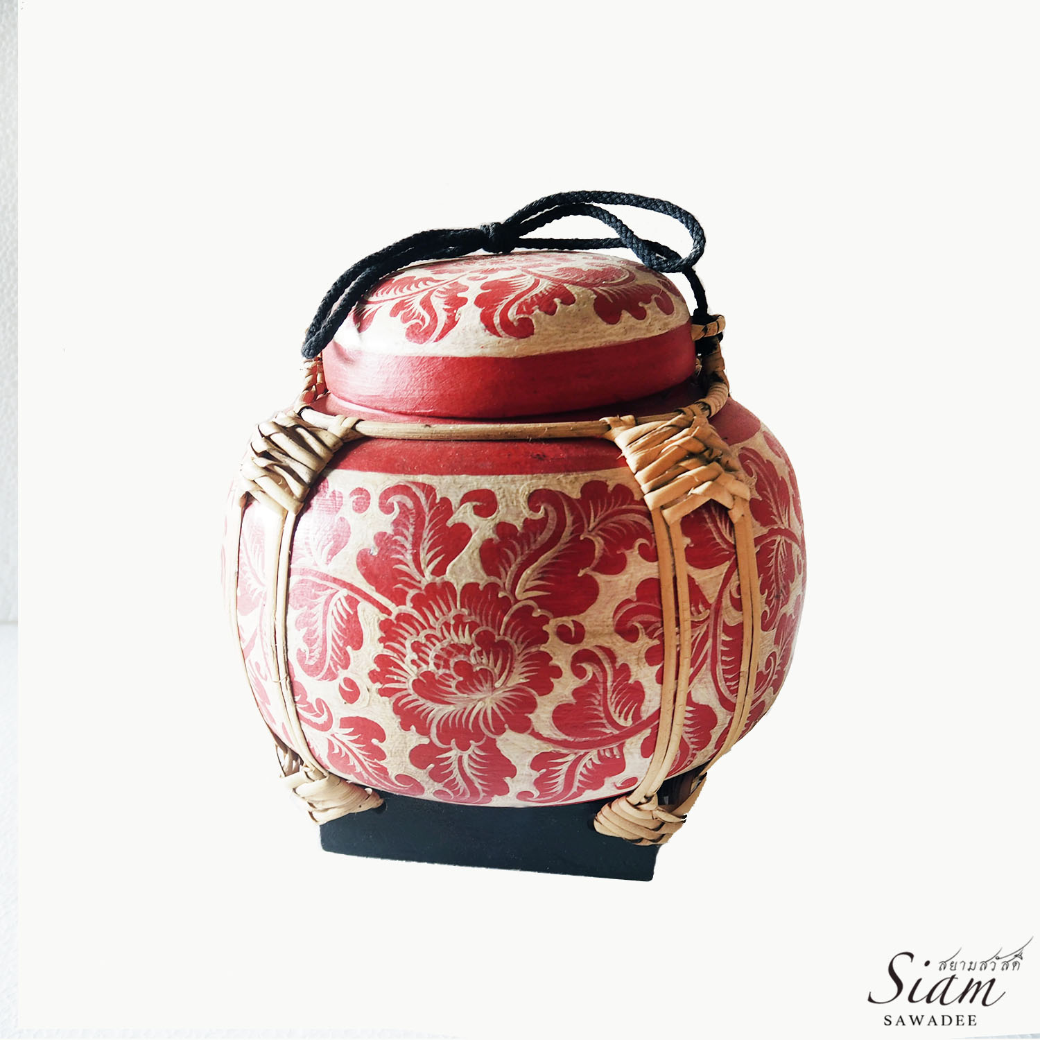 Traditional handcrafted Thai rice basket boxes. Hand woven bamboo is used to create stunning storage baskets and decorative rattan containers which are then expertly hand painted by local Thai artists.