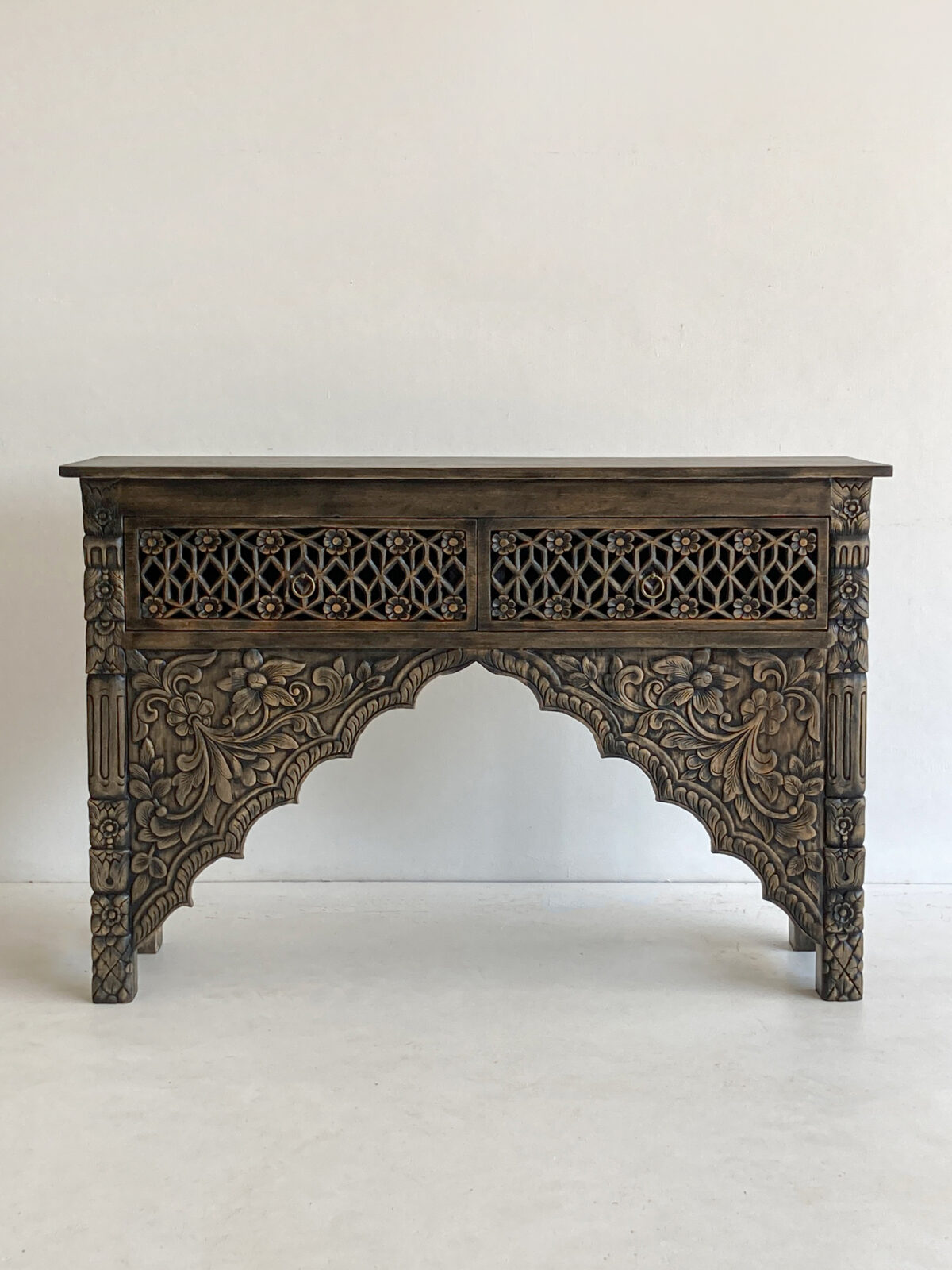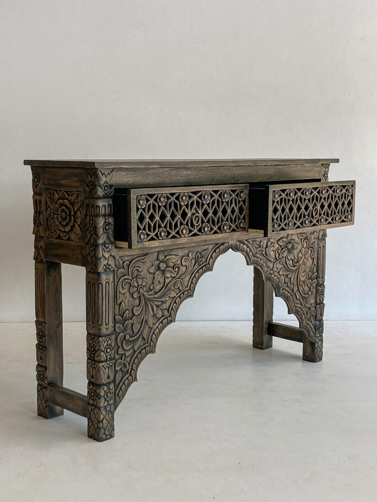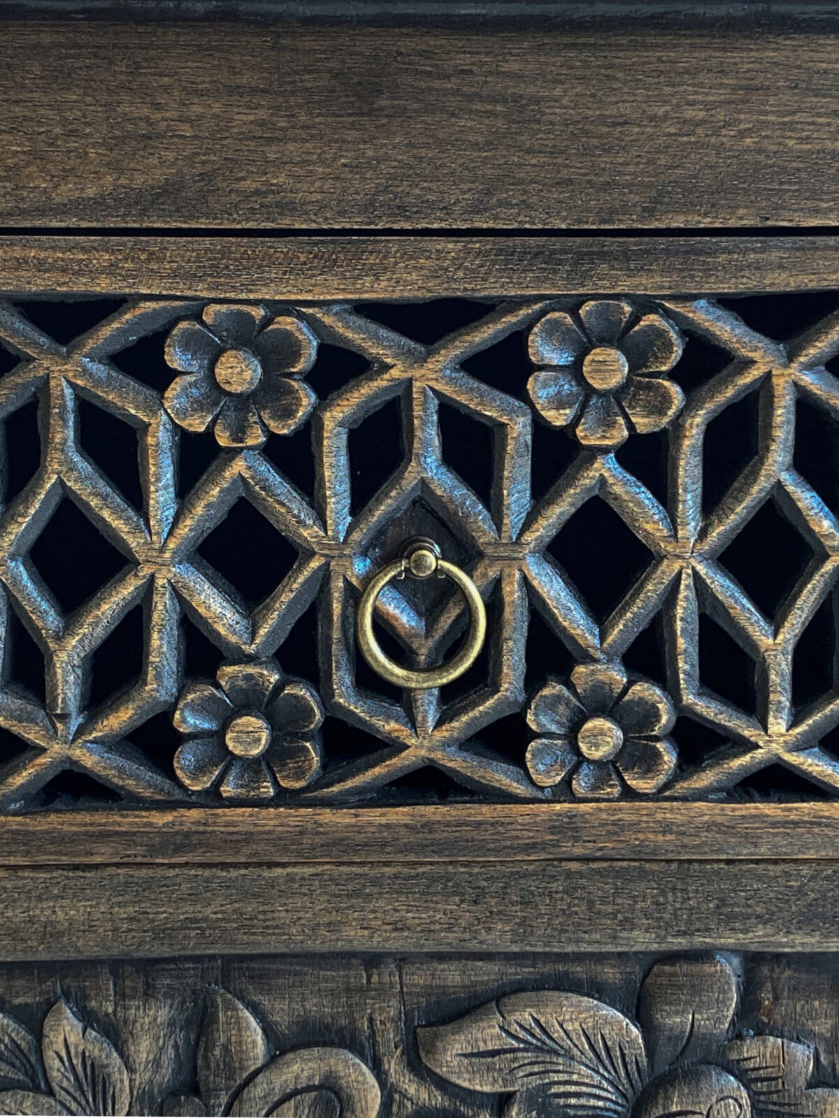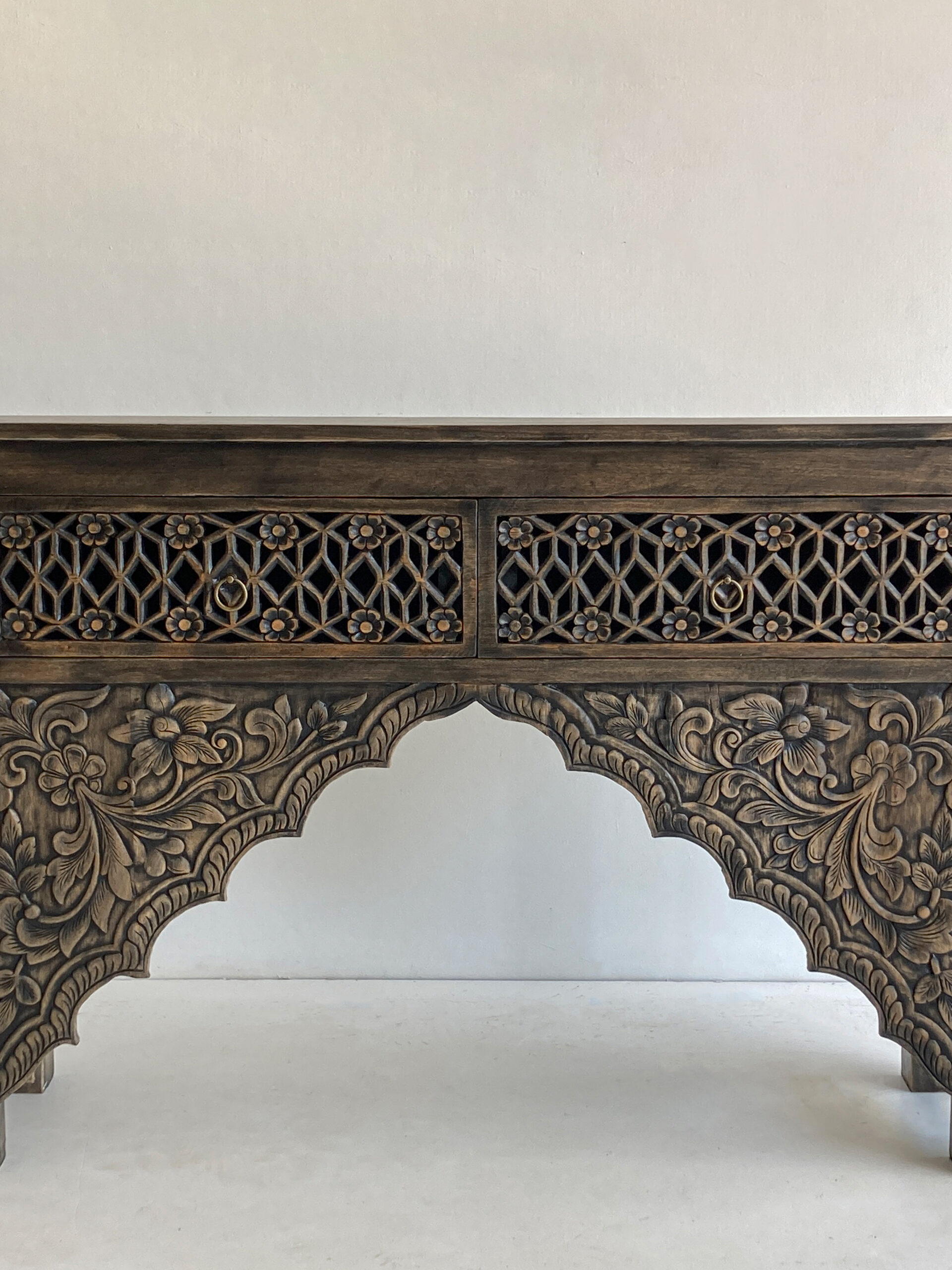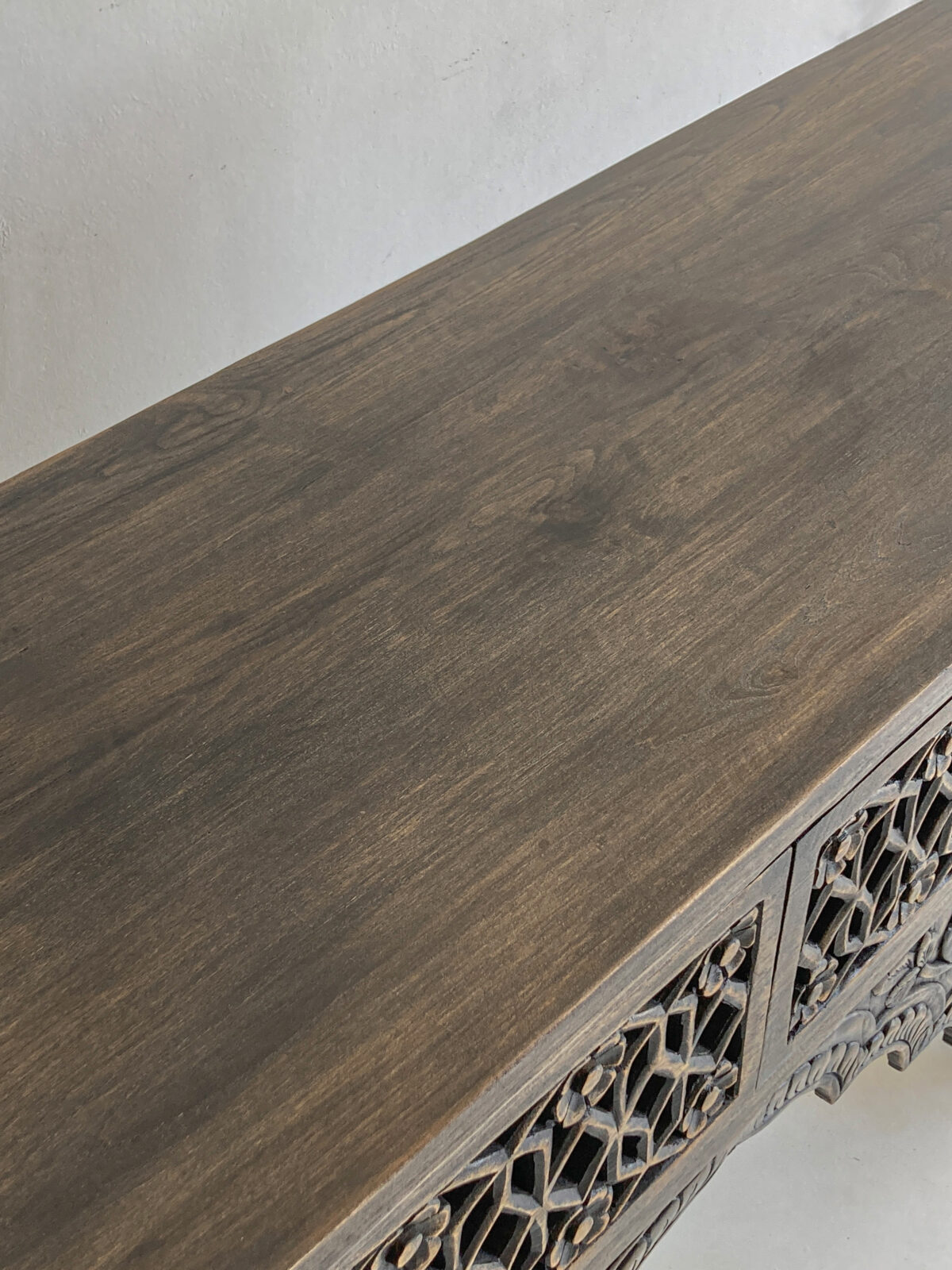 Hand-carved teak console cabinet featuring two drawers, crafted from reclaimed wood with a rustic black wash finish. This Indian-inspired piece showcases intricate artisanal details, making it a versatile addition to any living space.