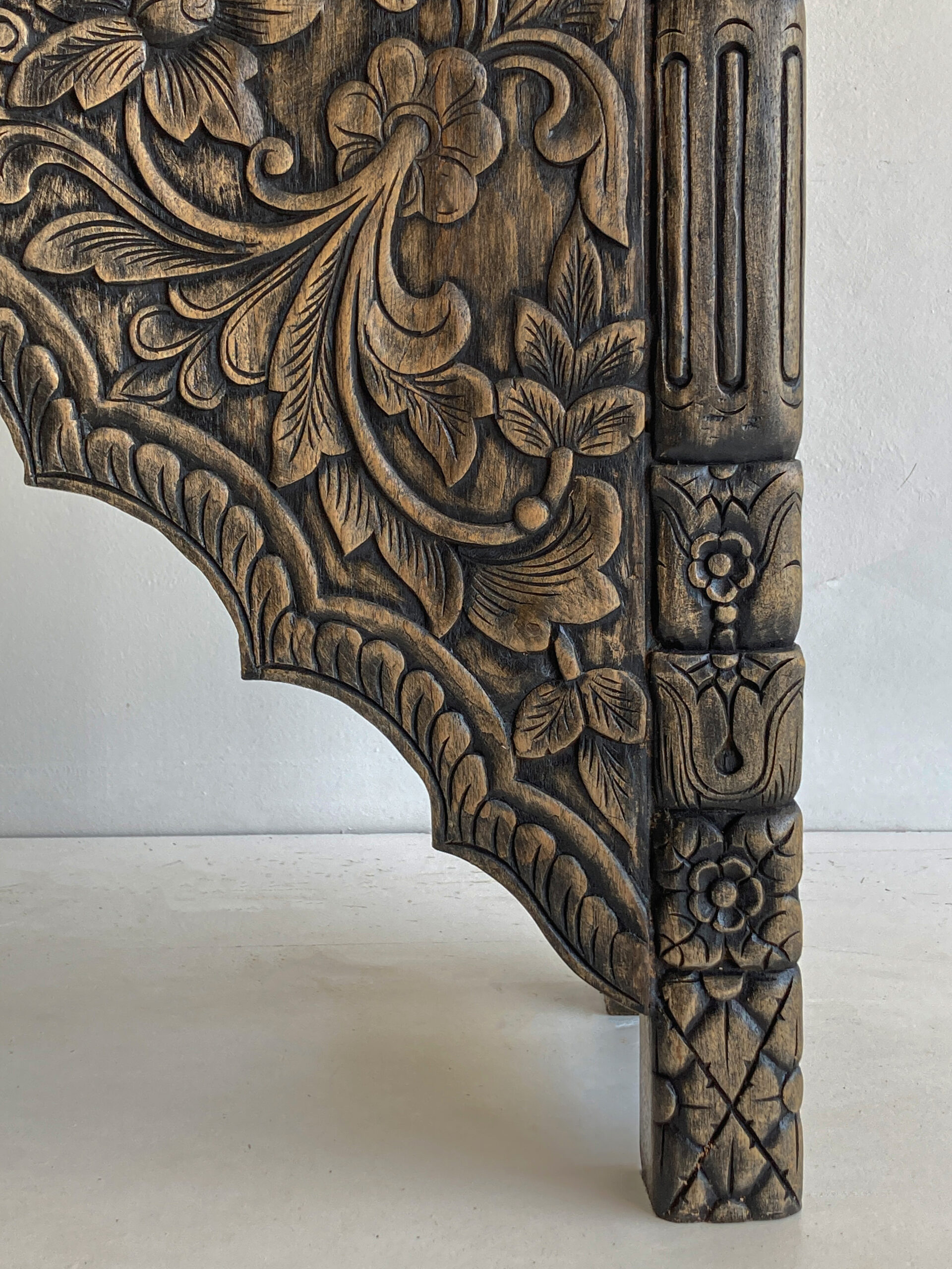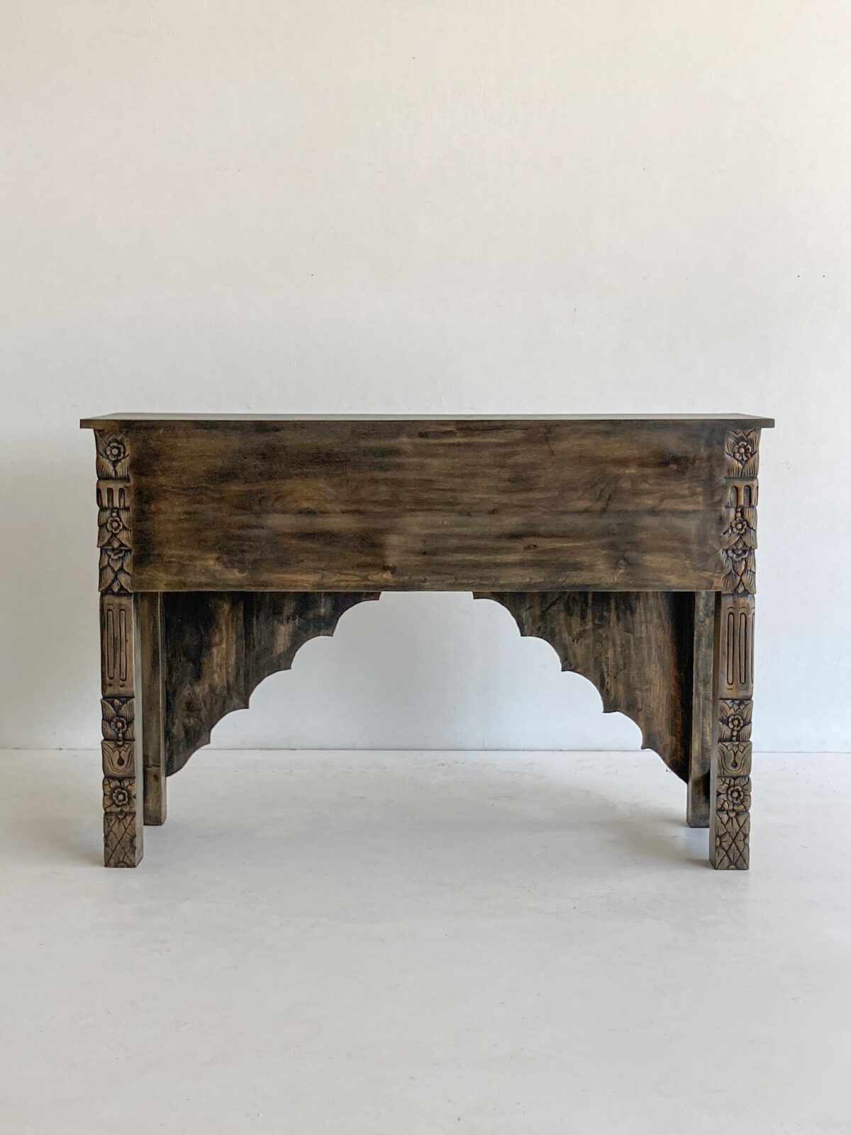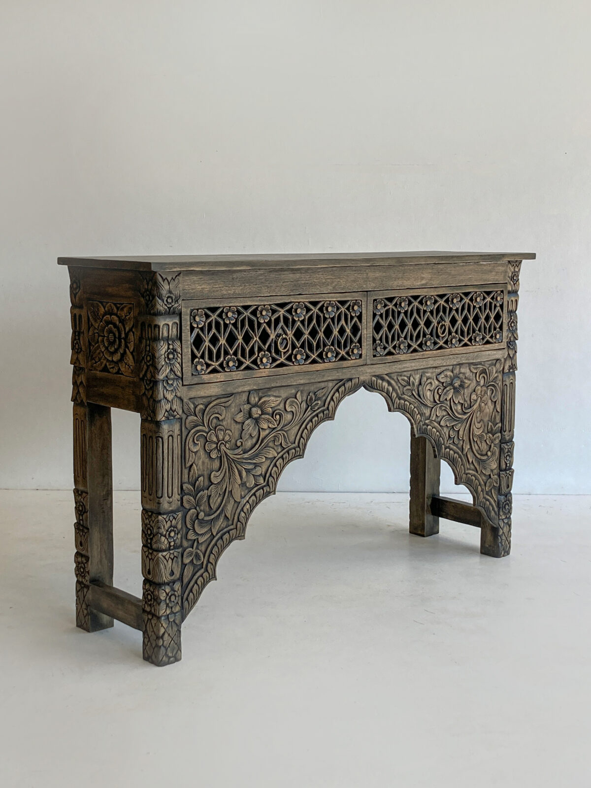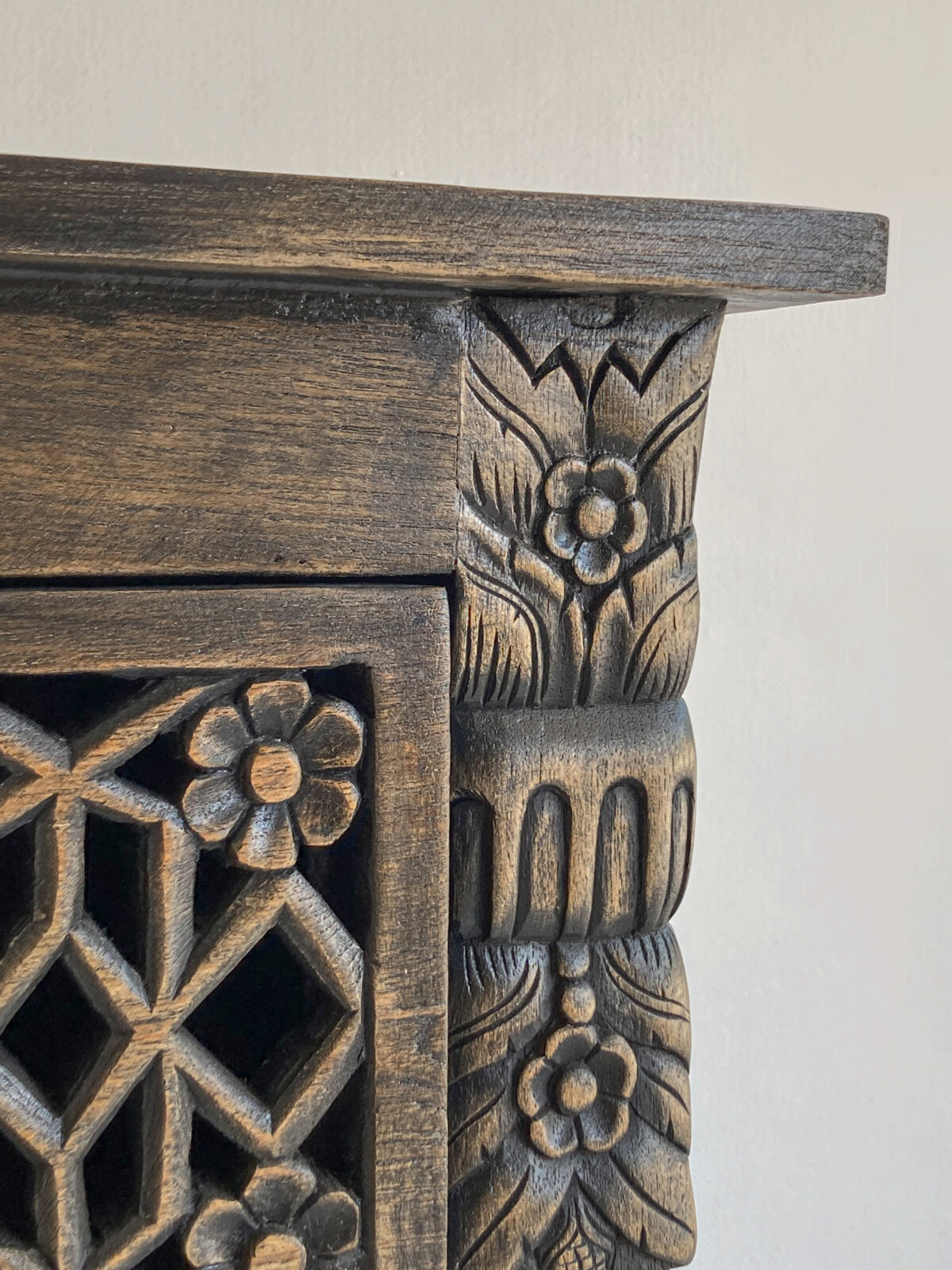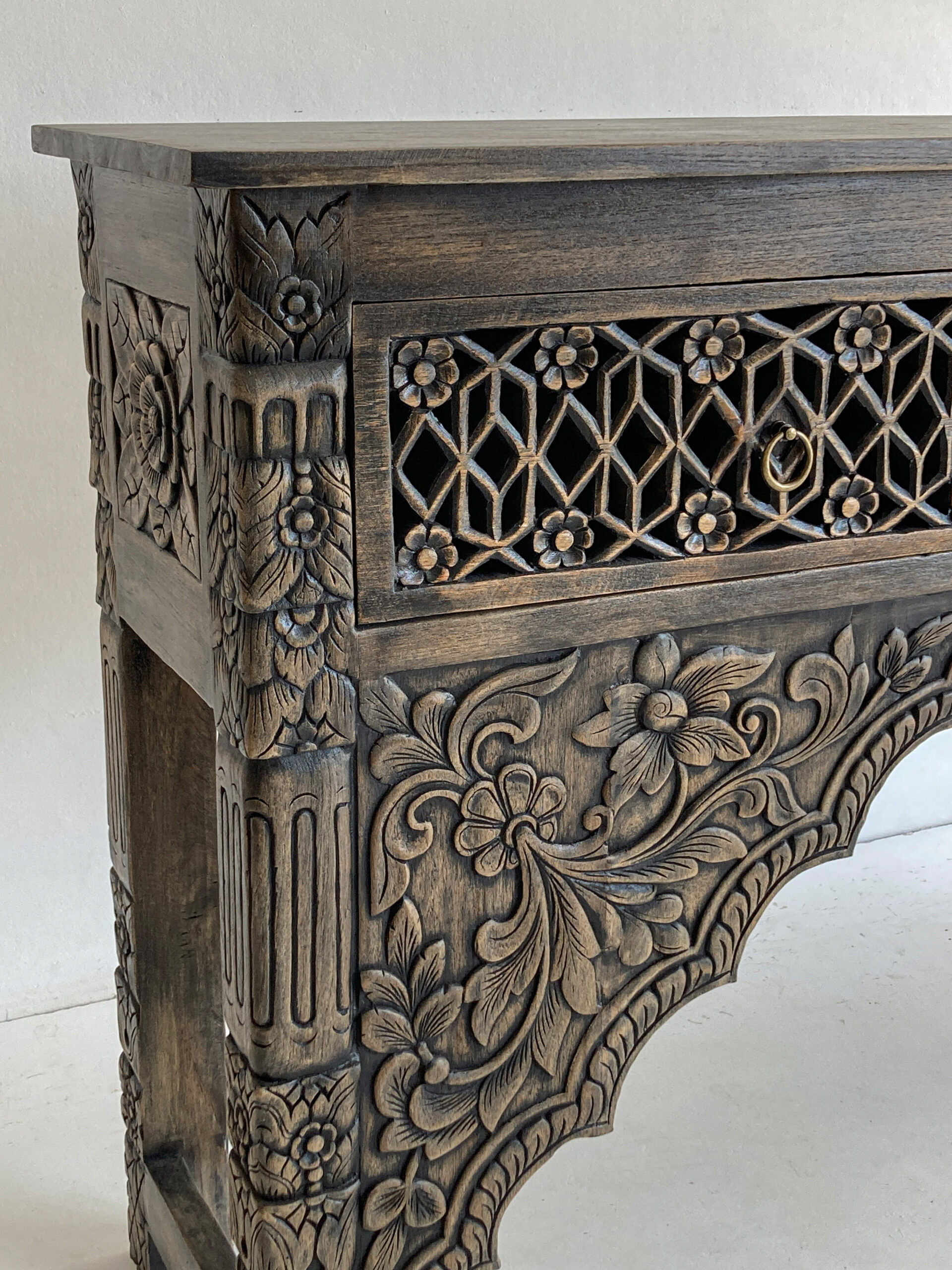 Hand-carved teak console cabinet featuring two drawers, crafted from reclaimed wood with a rustic black wash finish. This Indian-inspired piece showcases intricate artisanal details, making it a versatile addition to any living space.