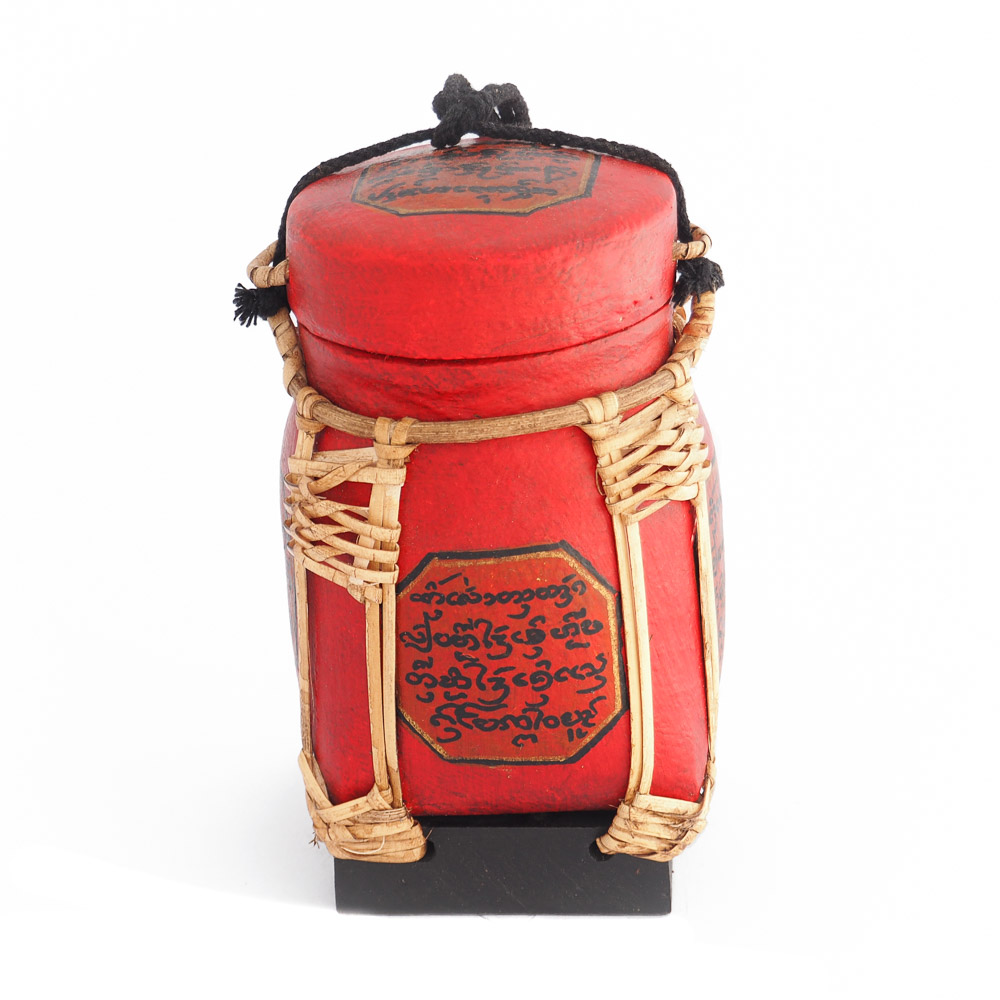 Asian storage vessel in vibrant vermillion featuring sacred Lanna blessing script in decorative medallions. This bamboo-crafted container includes natural rattan supports, a matching lid, and black wooden base. The bold color and spiritual inscription make this piece both decorative and culturally significant.