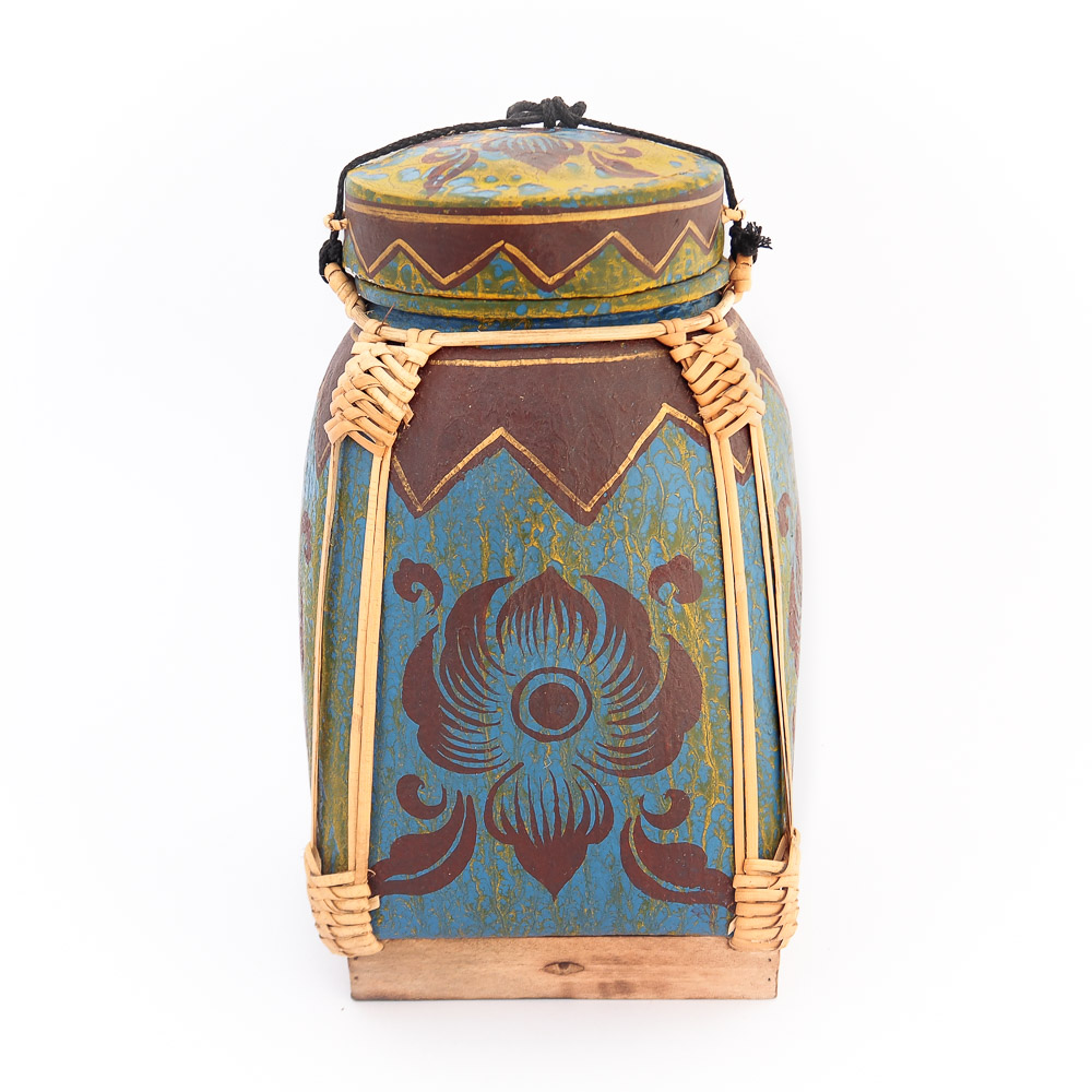 Lovely lotus painted on hand-weaved bamboo basket. Neatly finished with woven rattan, a lid and a rope for practicality while keeping the elegancy of this handmade craft from Northern Thailand.