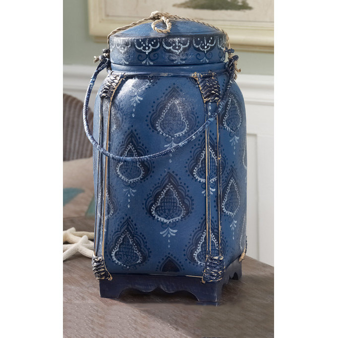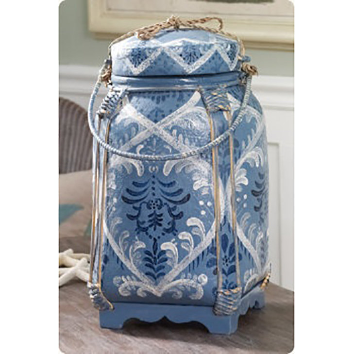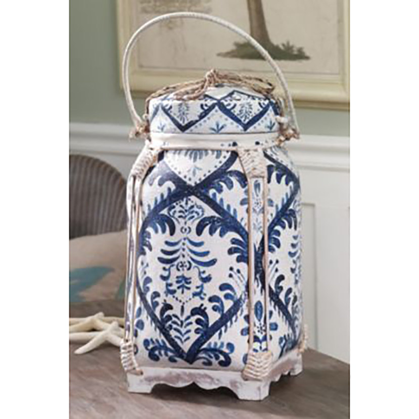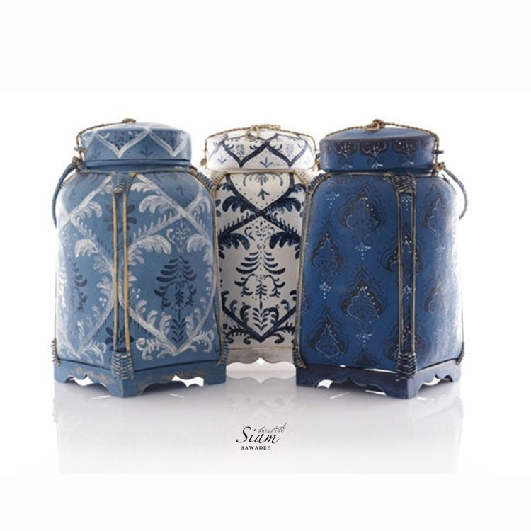 Beautiful trio of Thai storage baskets showcasing complementary blue and white damask patterns. Each handwoven container features distinctive ornamental designs, bamboo handles, and rattan supports. These versatile pieces combine traditional craftsmanship with elegant color coordination, perfect for both storage and display.