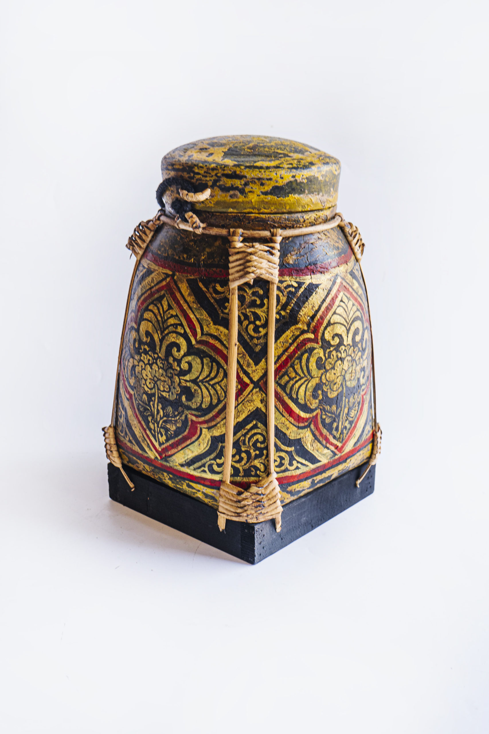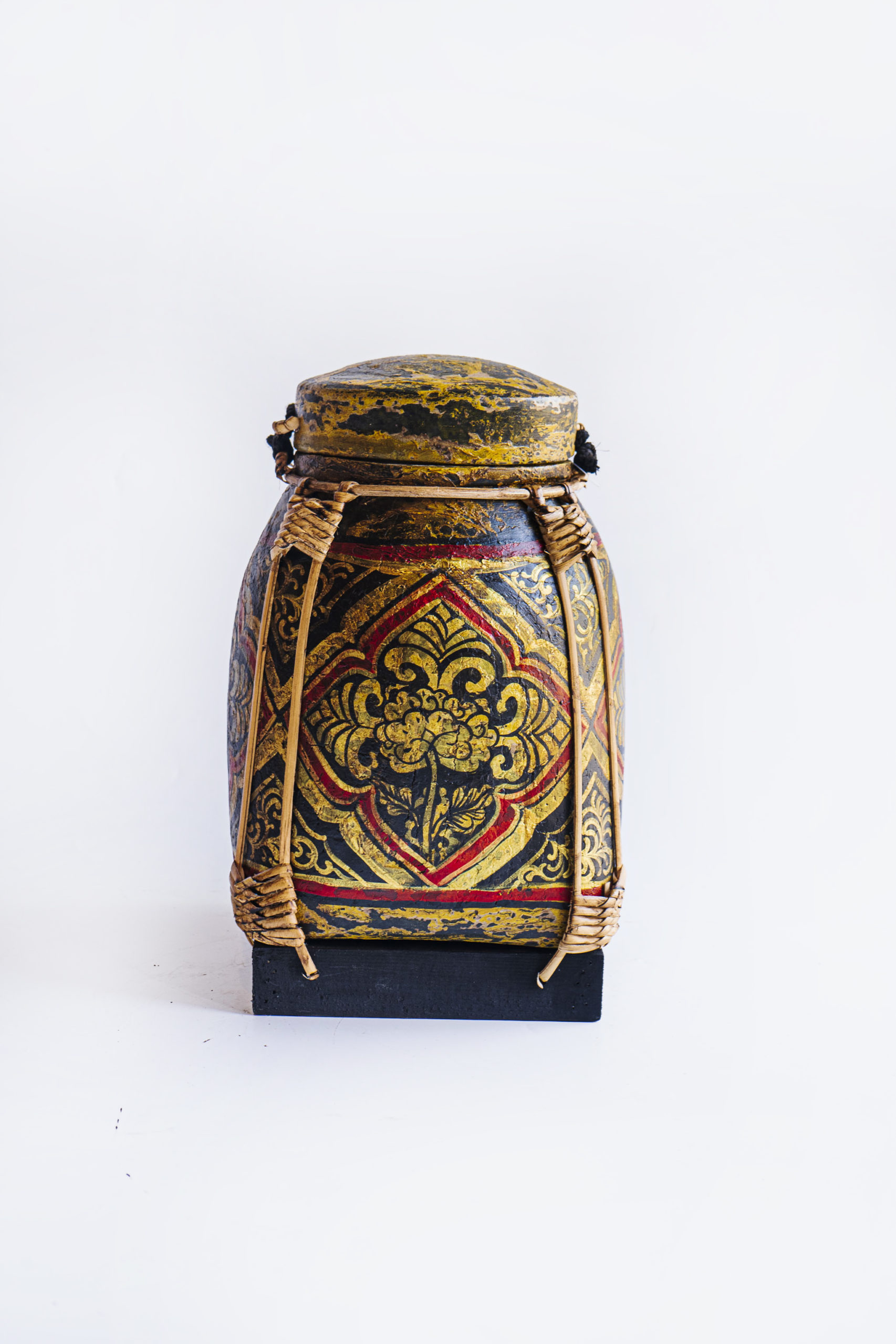 This artisanal Thai basket showcases an elegant gold and crimson medallion pattern painted on a black background. The traditional floral motif is complemented by bamboo weaving and rattan bindings, while a wooden base provides stability. This versatile lidded container merges decorative beauty with practical storage, perfect for both display and organization in any home setting.